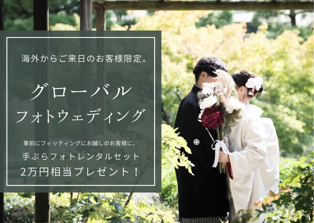 海外からお越しいただき、事前フィッティングのうえ当店でご成約いただいたお客様限定で、手ぶらフォトセット(2万円相当)をプレゼントさせて頂きます。