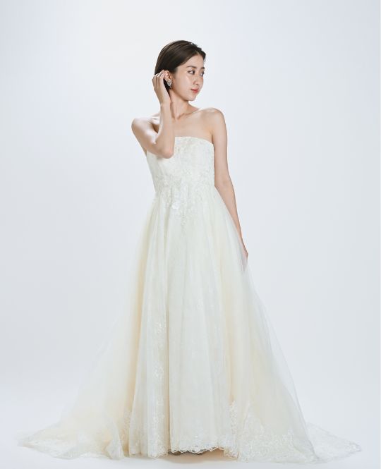 オフホワイトが肌なじみよく、ナチュラルな美しさを引き立てるAラインドレス。繊細なレースと軽やかなチュールを重ねたスカートは、動きに合わせてふんわりと揺れ、柔らかな印象を与えます。