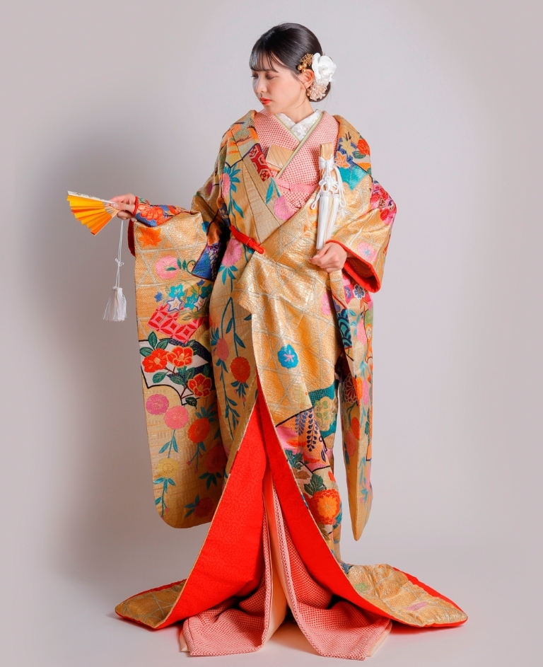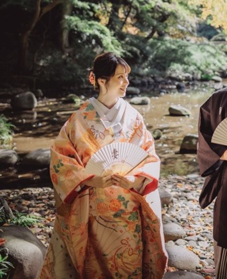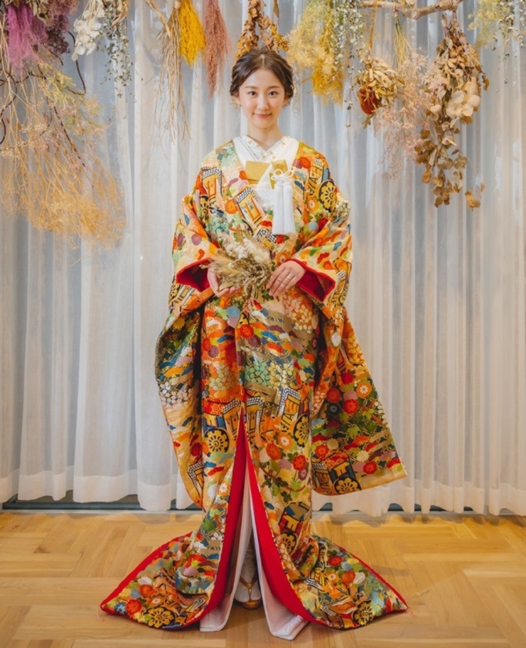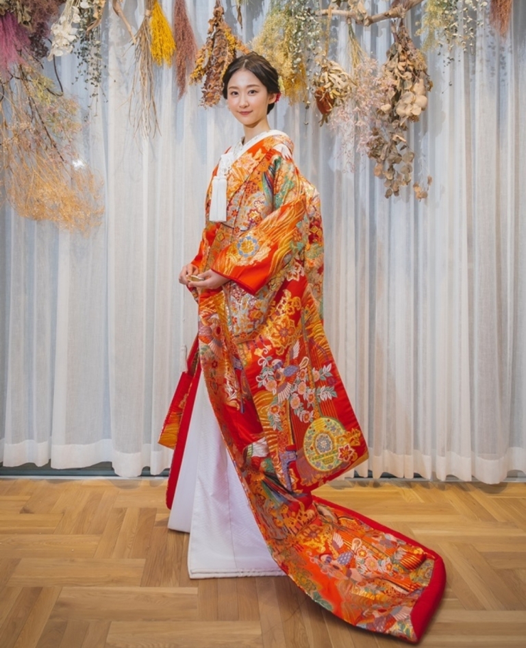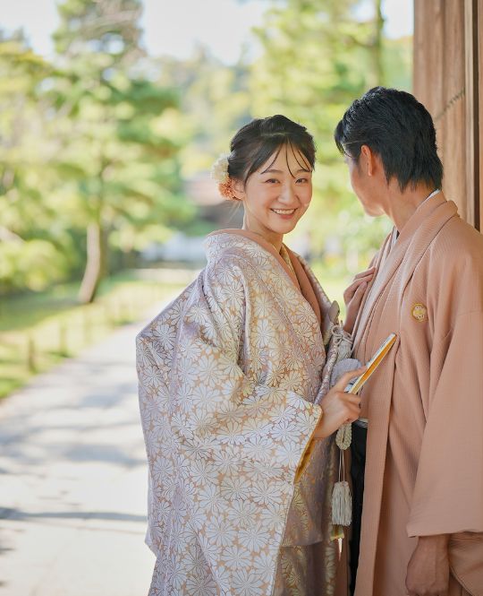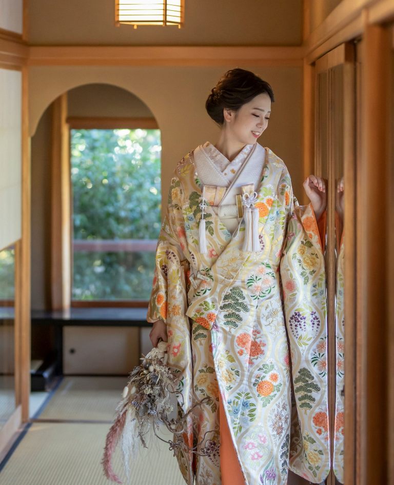明るいオレンジを帯びたベージュカラーの紋付は、柔らかく温かみのある雰囲気。新婦様の色掛下と揃えたカラーコーディネートが叶い、華やかさと統一感を兼ね備えた一着です。