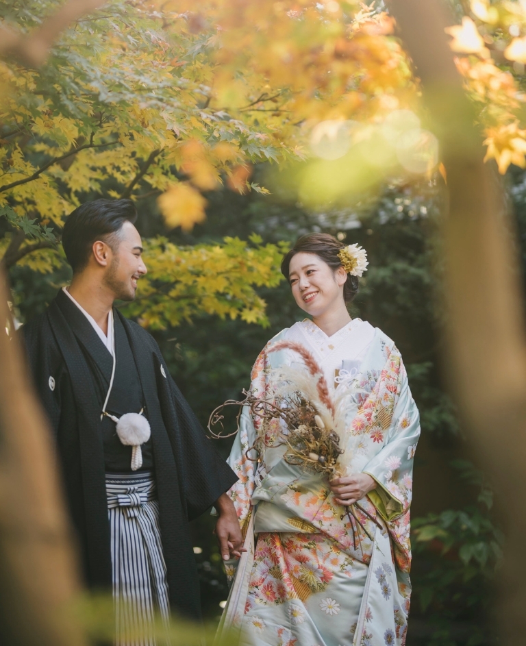 スコティッシュなチェックの柄と、伝統ある紋付が融合した現代風の着こなしが叶う一着。古来から伝わる伝統的な紋付とは一線を画す雰囲気が特徴。こちらの紋付も新婦様とのカラーリンクコーデが叶います。