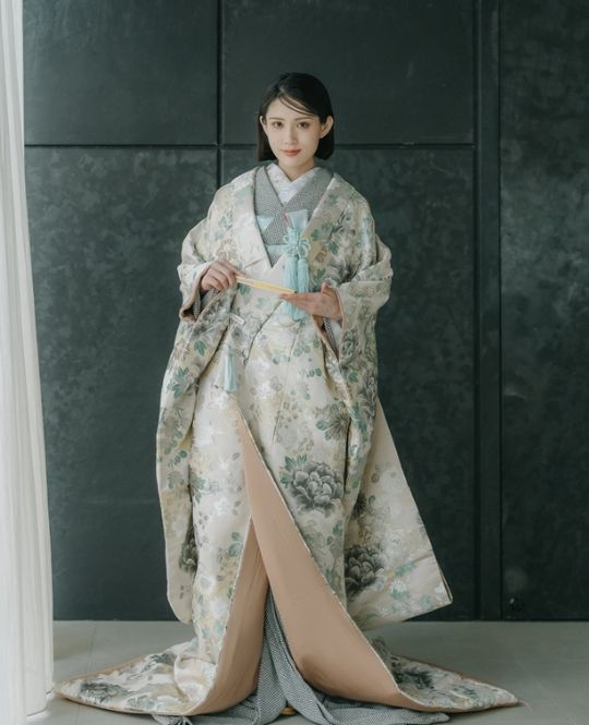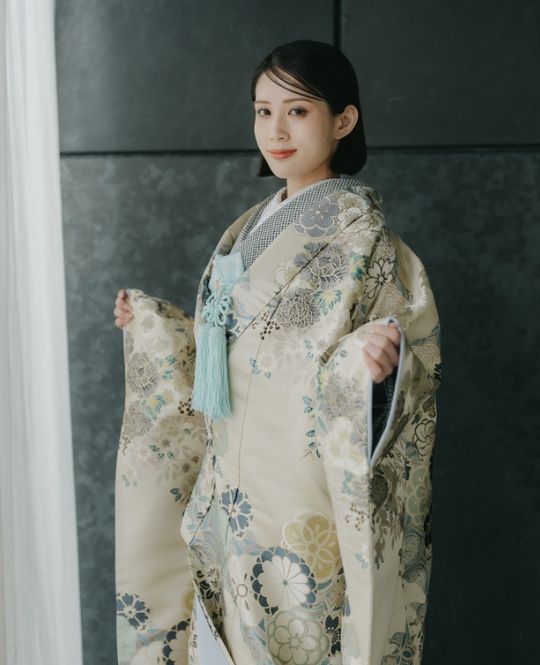 柔らかなアイボリーに温かみのある陰影を添えた紋付。透明感が魅力で、優雅な色味が穏やかに顔映りを引き立て、上品さを漂わせます。