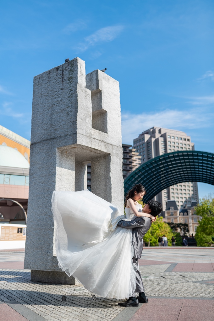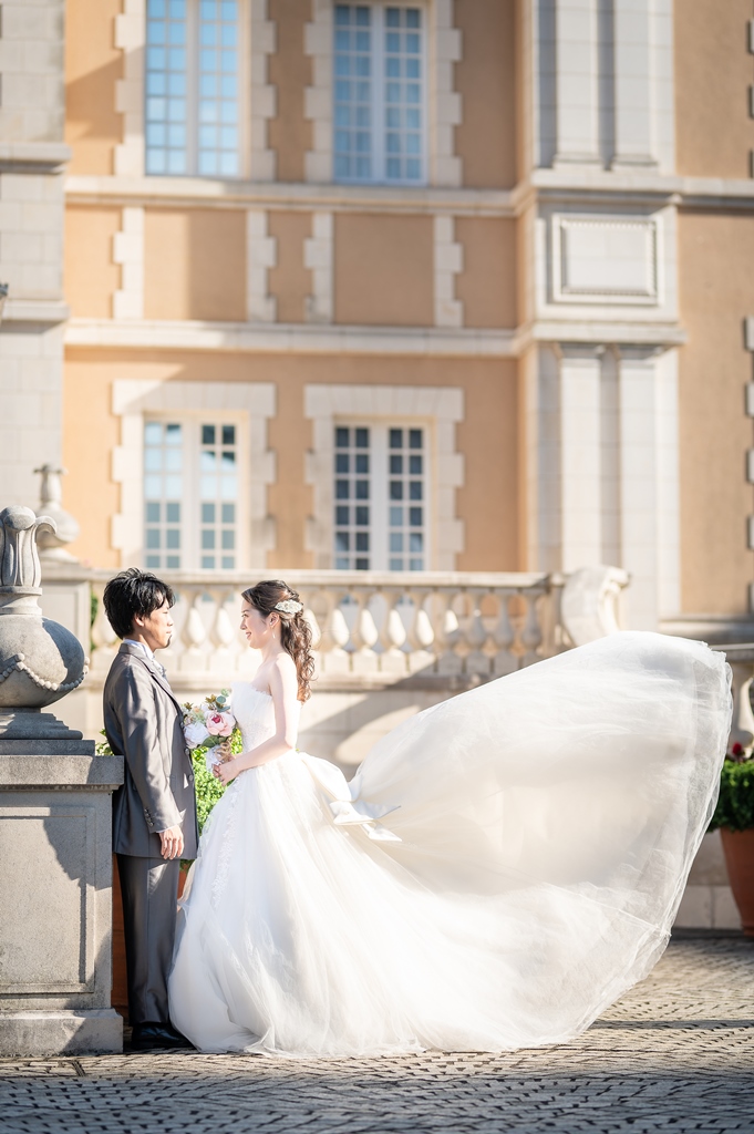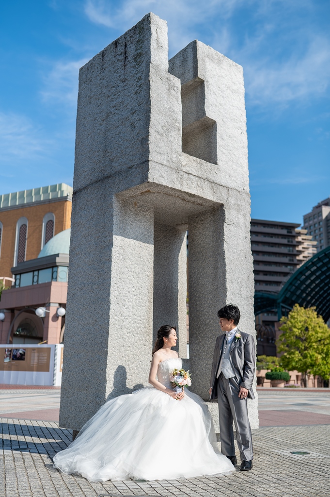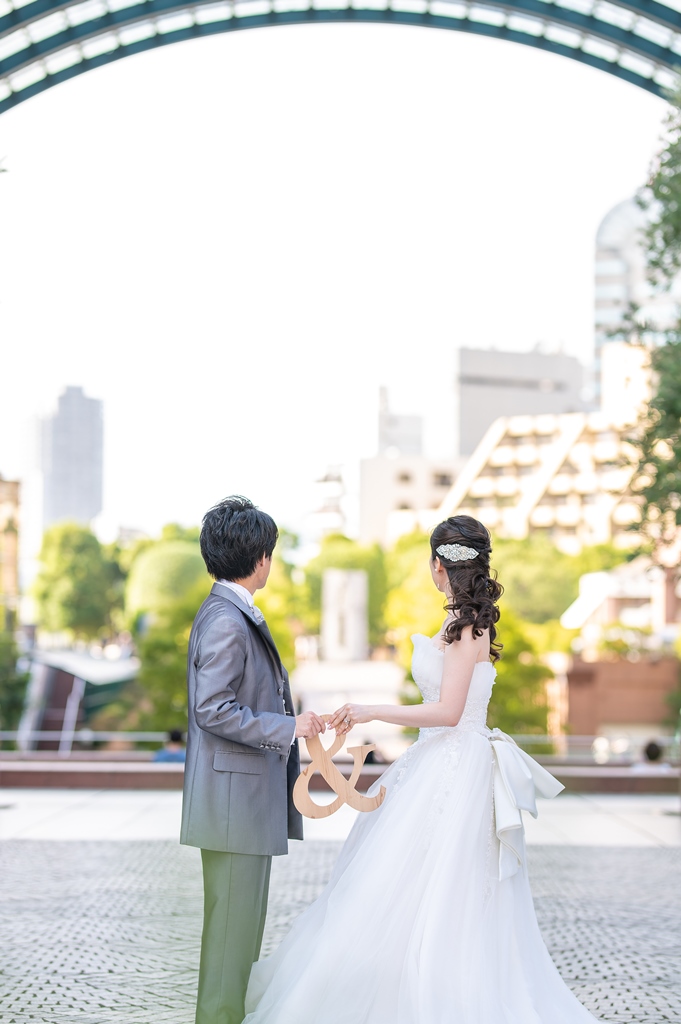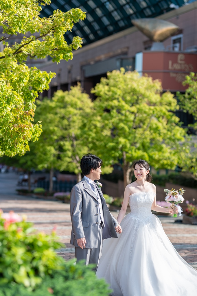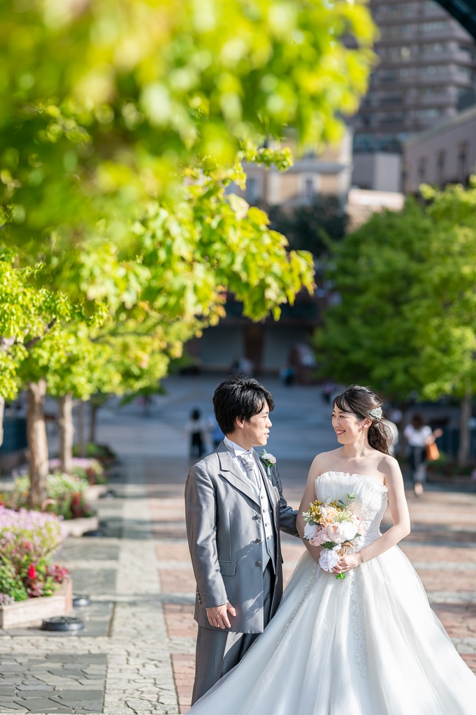 ご新婦様のチュールタイプの可愛らしいドレスとご新郎様の光沢のあるグレーのタキシードがとってもお似合いで、恵比寿ガーデンプレイスでばっちり映えていますね♬