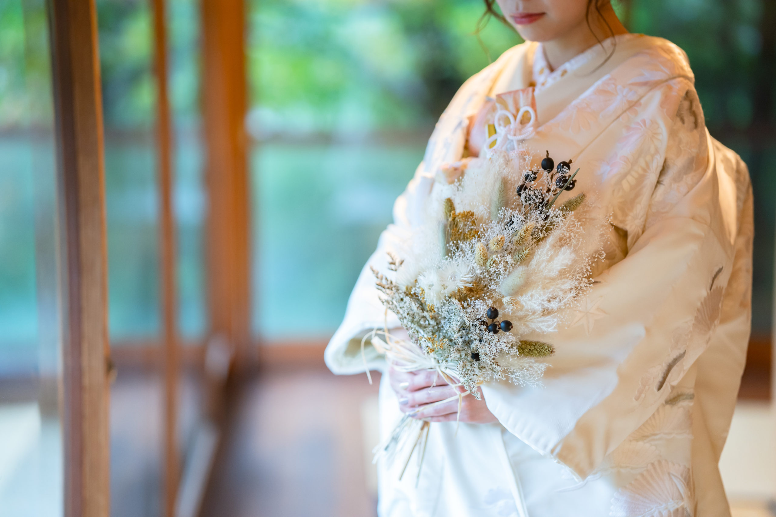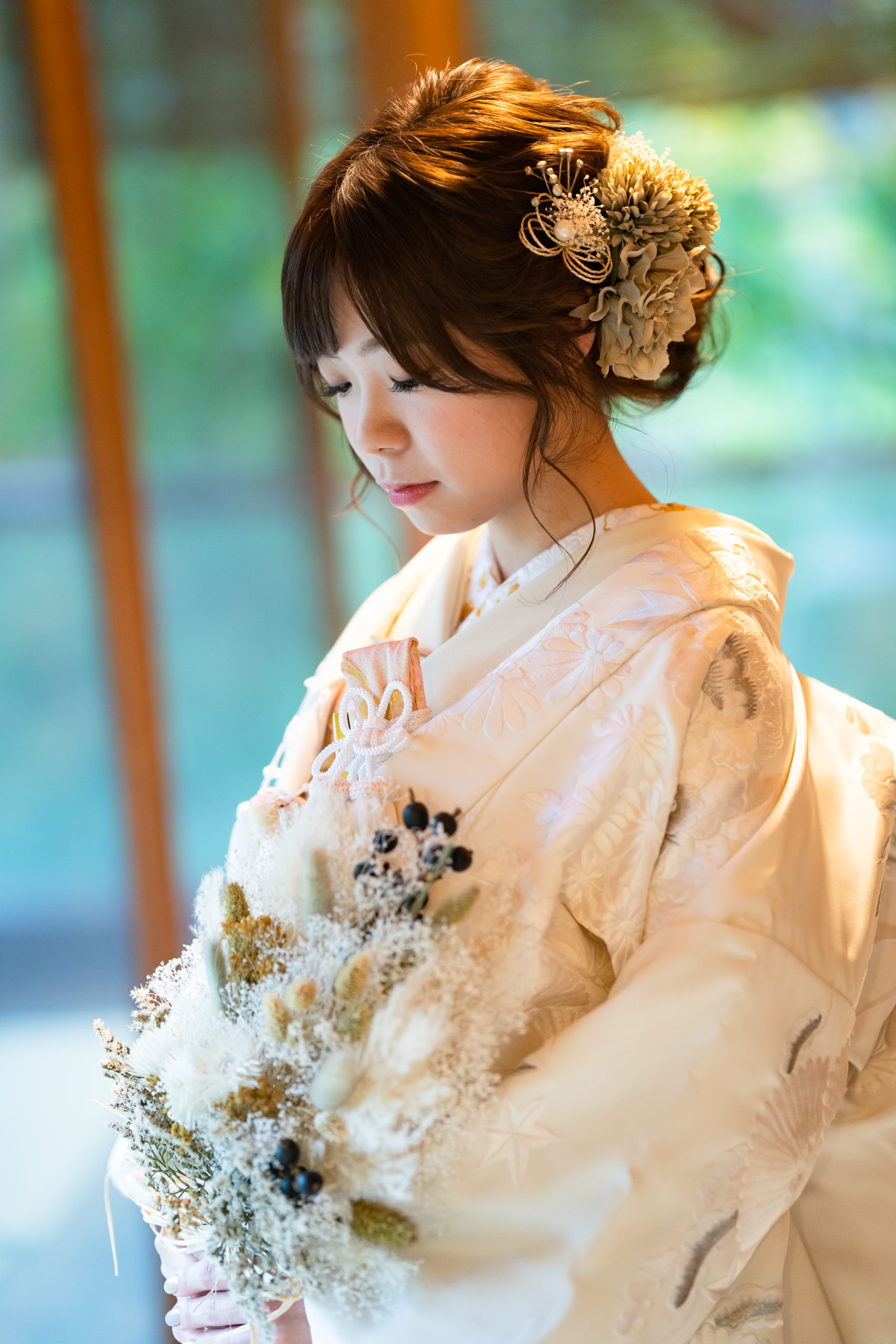 新婦様は白無垢をご着用いただき、胸元に刺繍やお色のアクセントを入れたりと、とっても可愛いコーディネイトにして頂きました♡