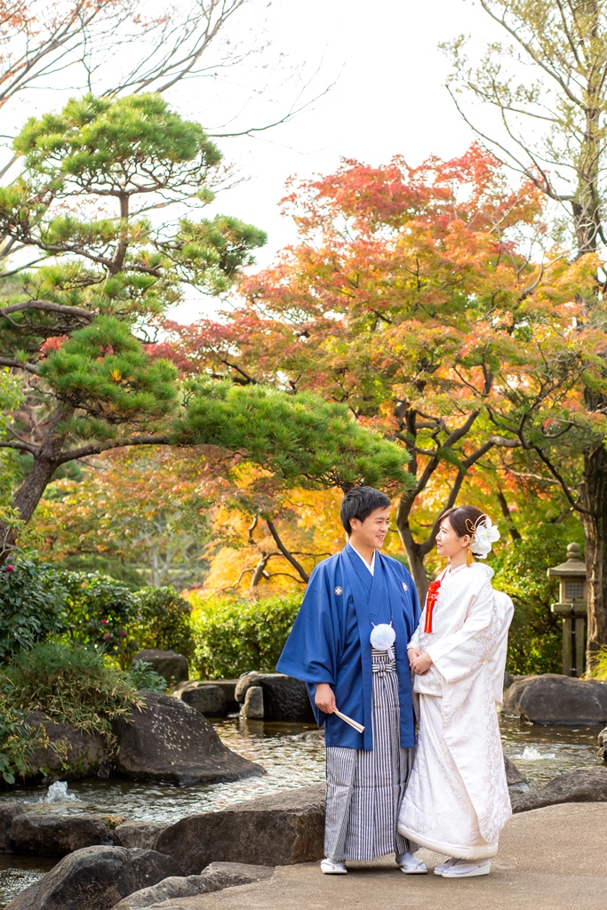 11月下旬、色付く木々が綺麗な時期に平成庭園にて前撮り撮影を行いました。