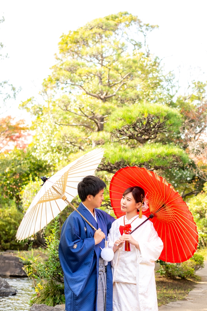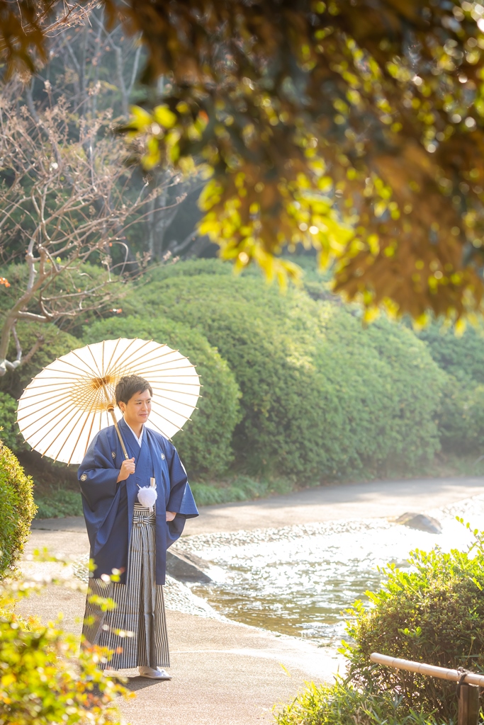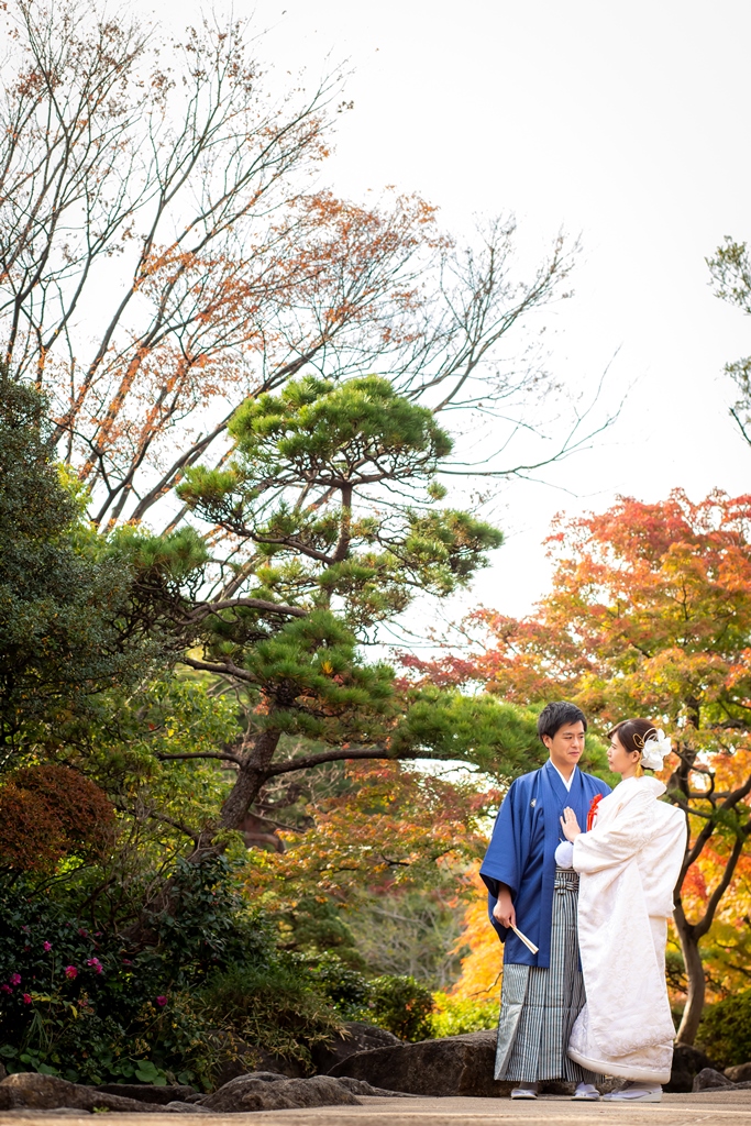 庭園は、どの季節に訪れても四季折々の景色を楽しむことができます。今回、新郎様は青い紋付、新婦様は白無垢に赤や刺繡などの差し色を足して着ていただきました。
