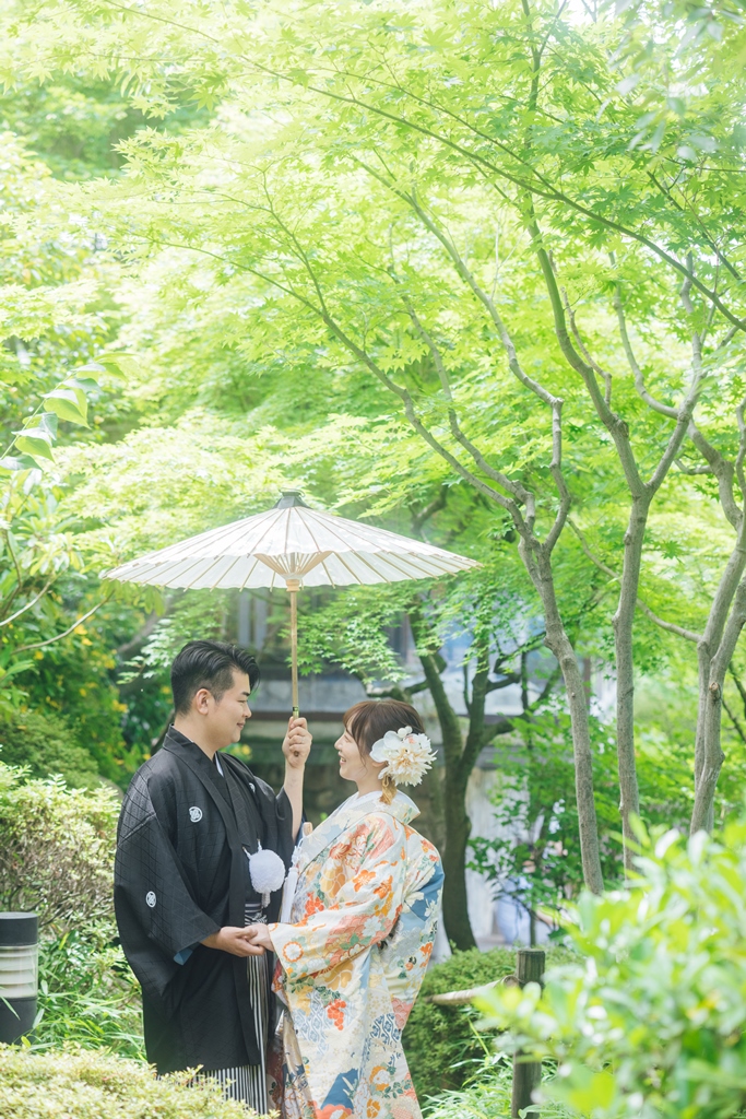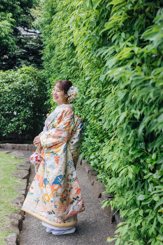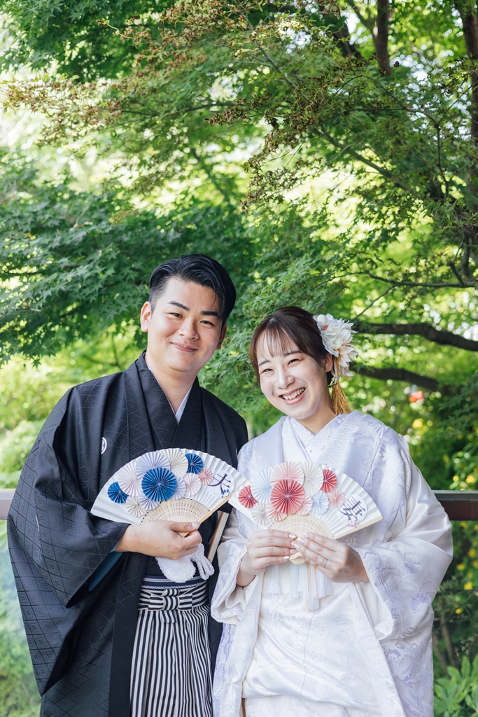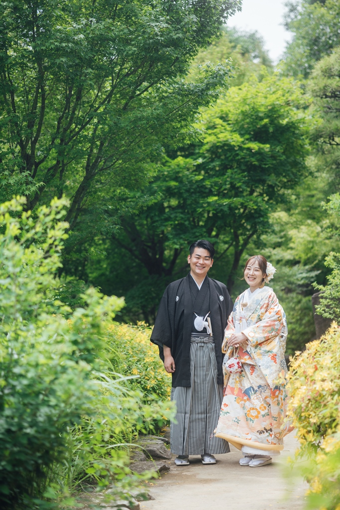 爽やかな新緑の中、新作の色打掛がとってもお似合いでした♡お持ち込みいただきましたおふたりの