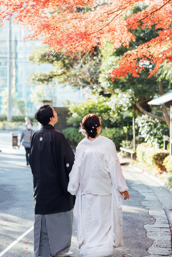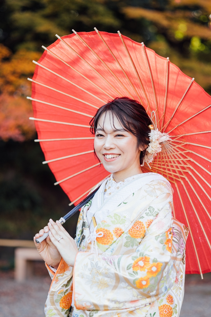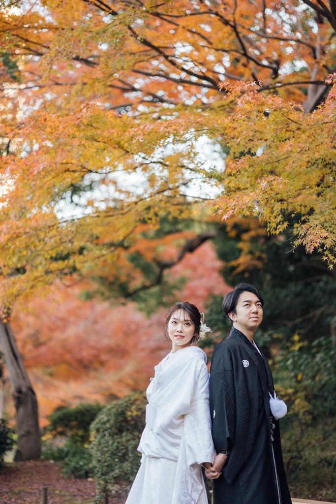 淡いお色のお着物と紅葉の相性もバッチリです!羽織替えをして、色打掛と白無垢の両方で撮影していただき、ありがとうございました(*^^*)