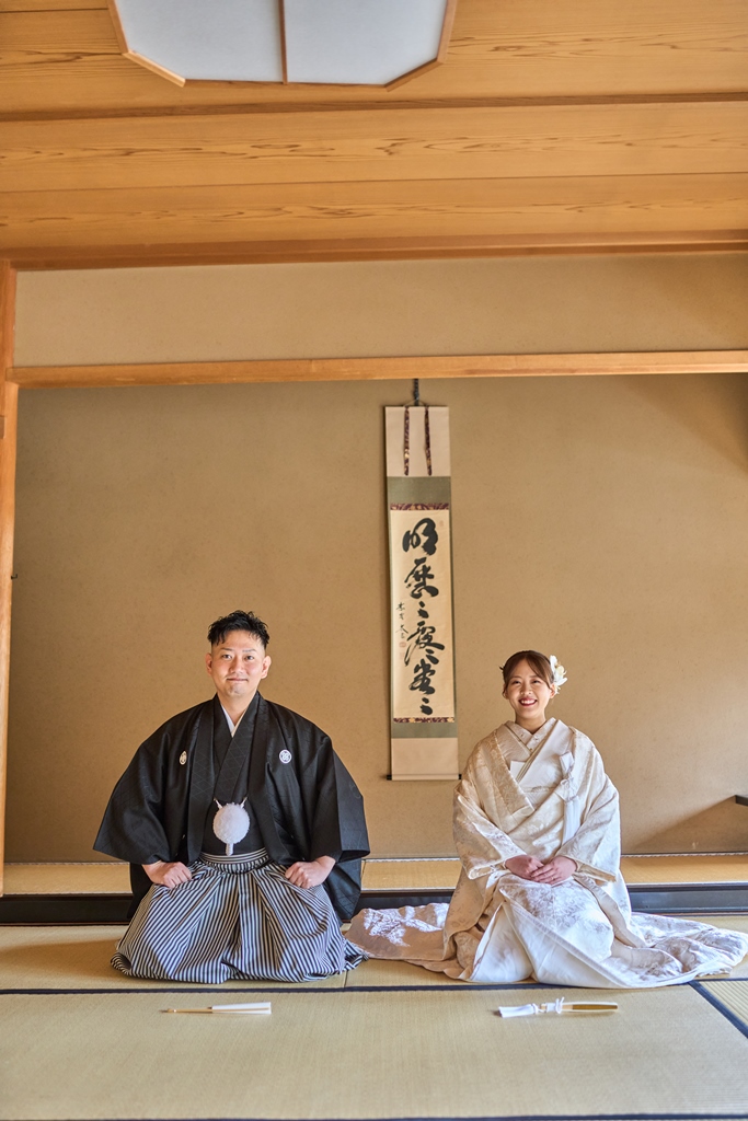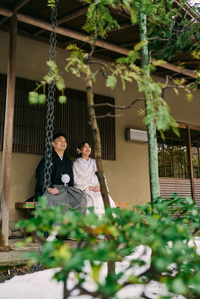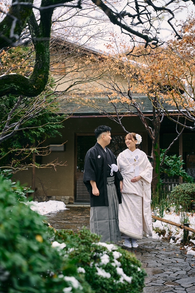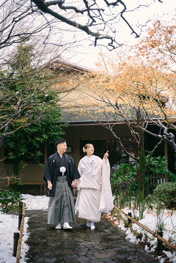和装は少し雨が降っていましたが、庭園は雪化粧でとても素敵な写真を撮っていただきました。