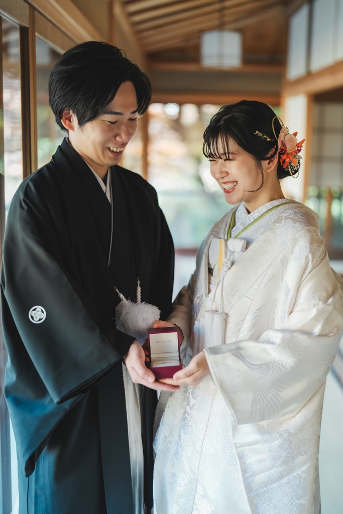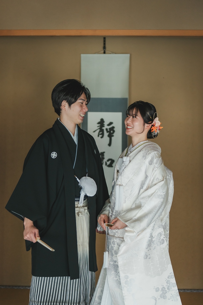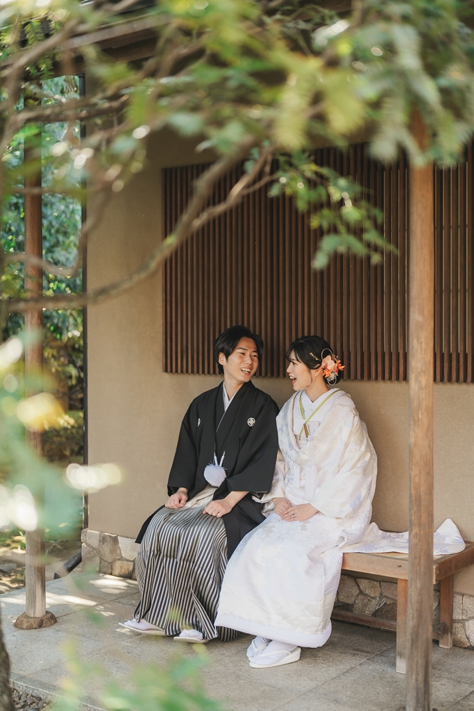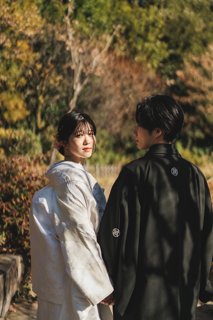 和装で前撮りをお願いしており、自分たちがいろいろと動きにくい中で様々な部分に気を遣っていただいて大変気持ちよく過ごさせていただきました。移動中もたくさん話しかけていただいて、そのおかげでリラックスして撮影に臨むことができ、自分たちらしい表情、雰囲気で写真を撮っていただけたと思います。非常に楽しくて、撮影時間の2時間をあっという間に感じました。