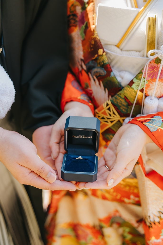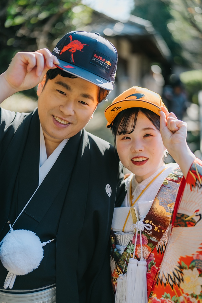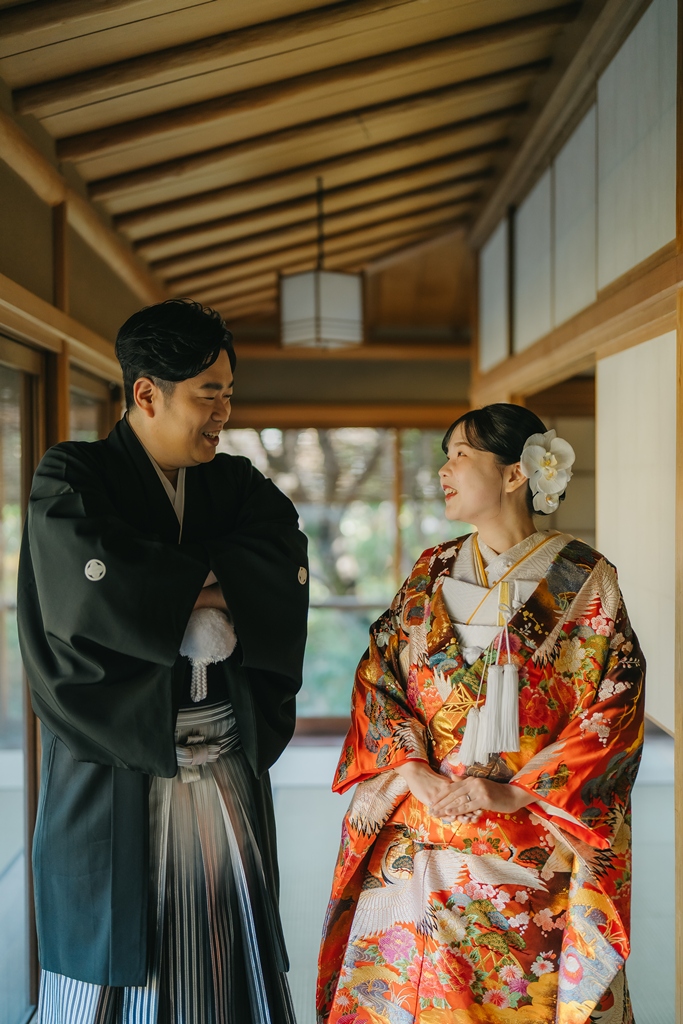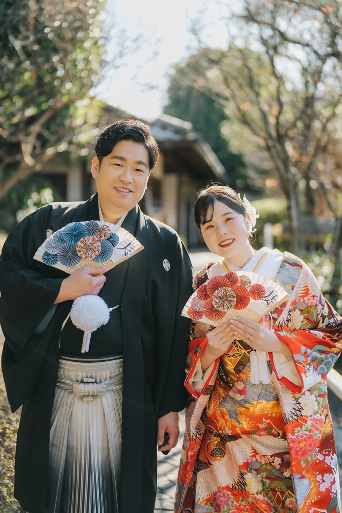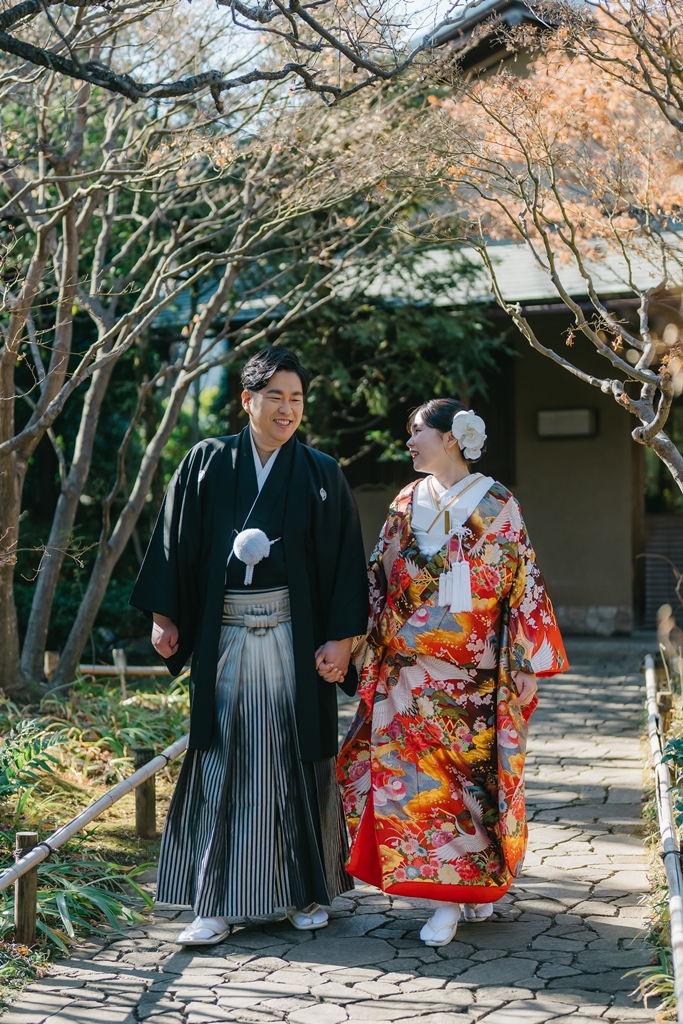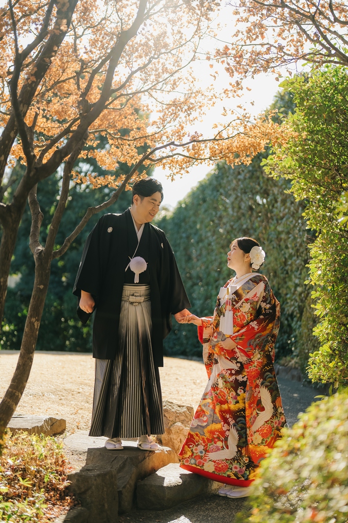 撮影場所の目白庭園の和室が雰囲気がとても良かったです。また庭園の様々な場所で撮影ができて、冬でしたが緑もあるところもあり秋の様な雰囲気の写真も撮ってくれて良かったです。和装・洋装どちらも持ち込んだ小物をカメラマンさんが存分に活用してくれてとても撮影が楽しかったです。