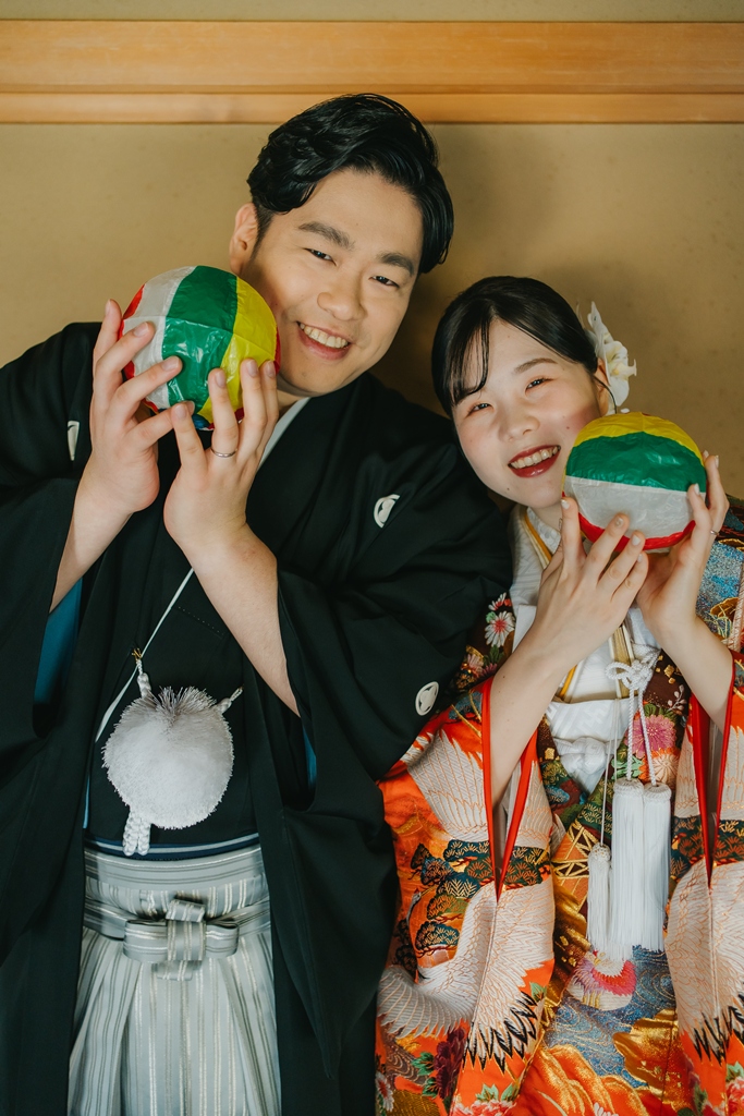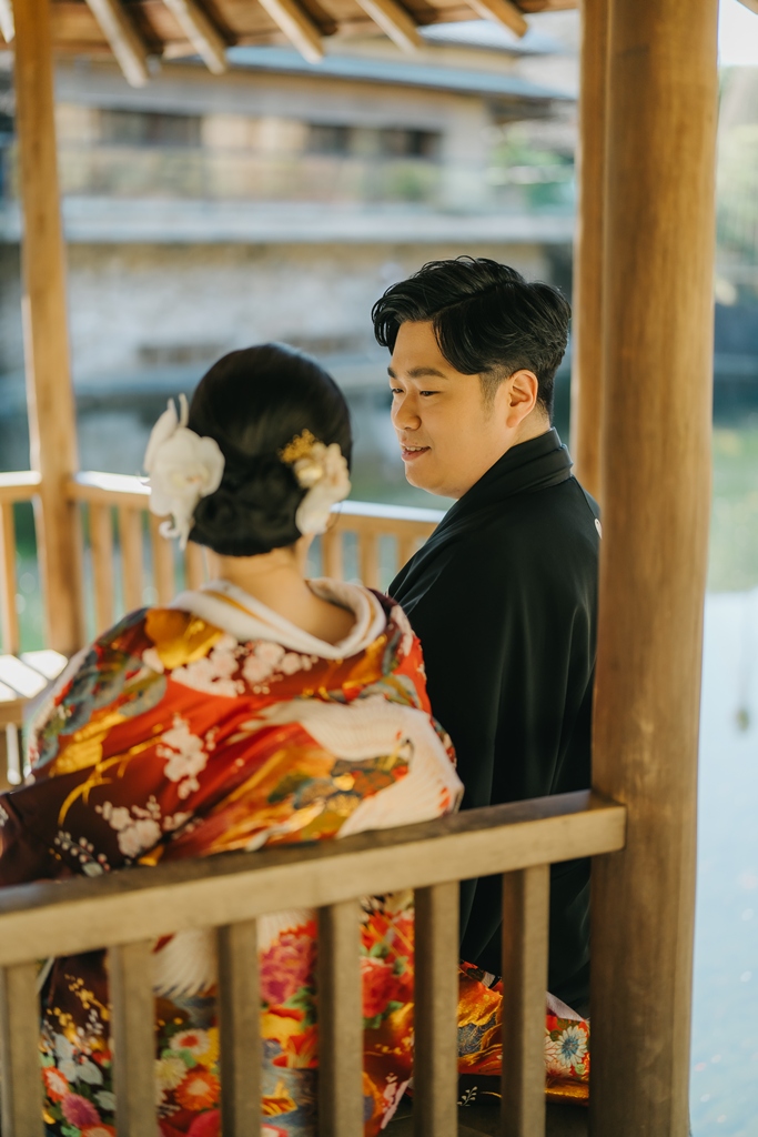 新婦様のお着物は、上品な色合いと華やかな柄が大変美しく、柔らかな笑顔と見事に調和していましたね。新郎様の袴姿も凛々しく、お二人が並ばれたお姿は、まるで日本画の一場面のように素敵でした。目白庭園の趣ある日本庭園の風景は、お二人の和装姿をより一層引き立て、四季折々の自然が特別な瞬間を優雅に彩っておりました。