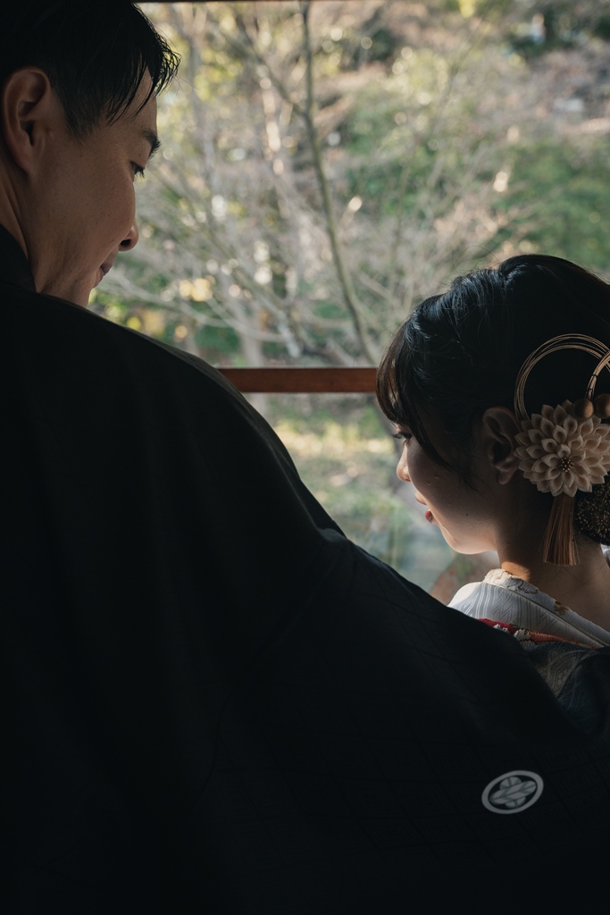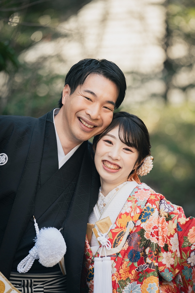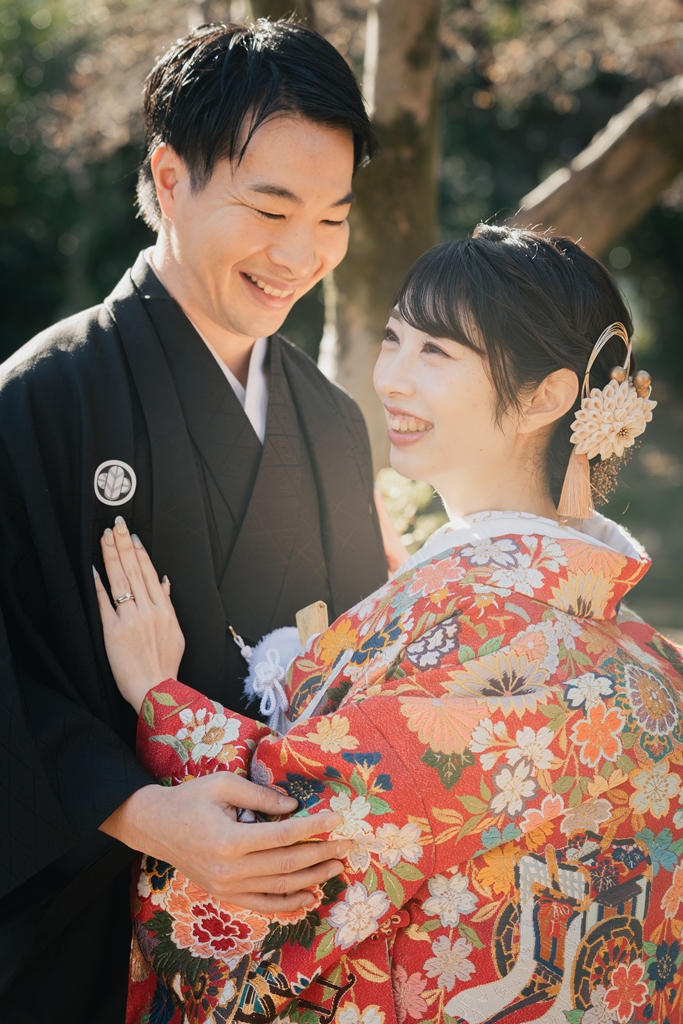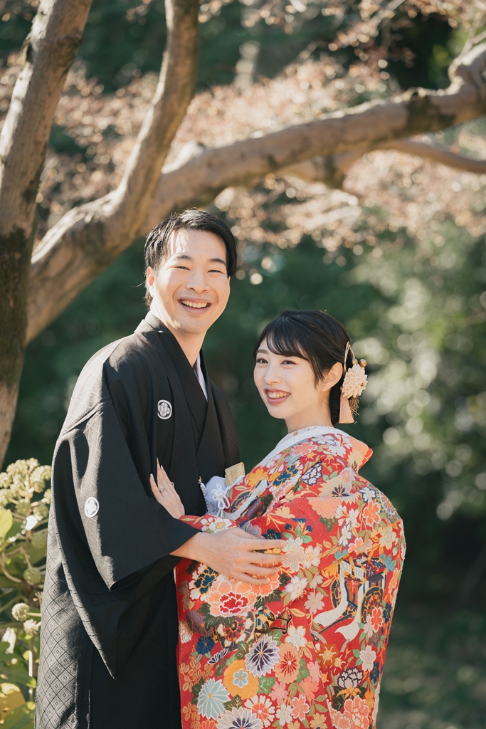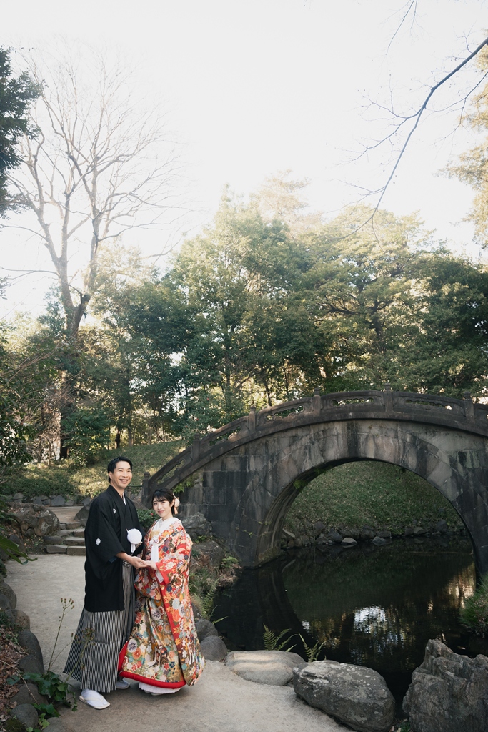 歴史ある日本庭園の静寂な雰囲気の中、新婦様の華やかで上品なお着物姿と、新郎様の凛々しい袴姿が見事に調和していましたね。四季折々の自然に囲まれた小石川後楽園の美しい風景が、お二人の特別な一日をより一層引き立てていました。