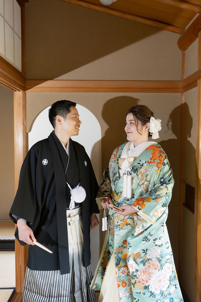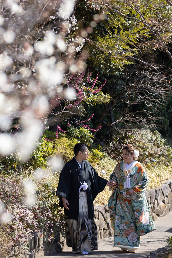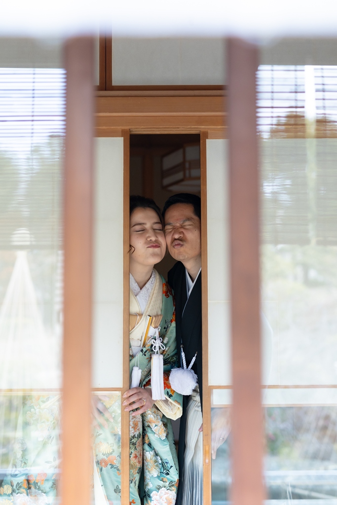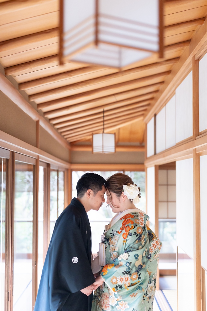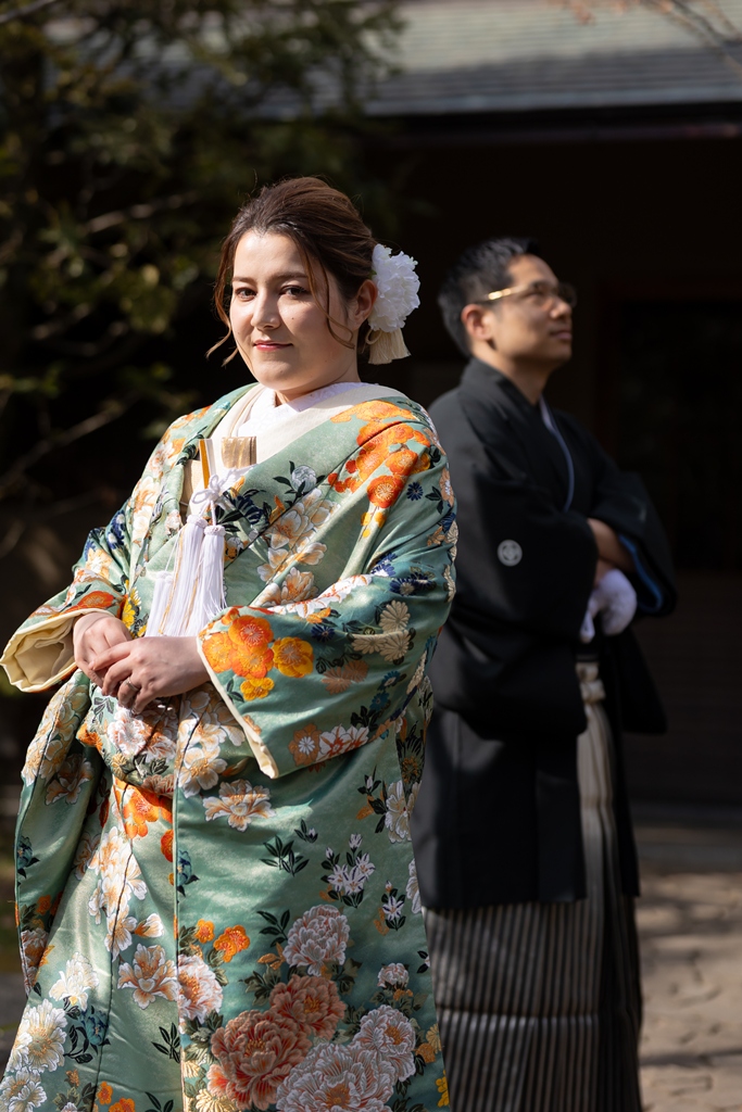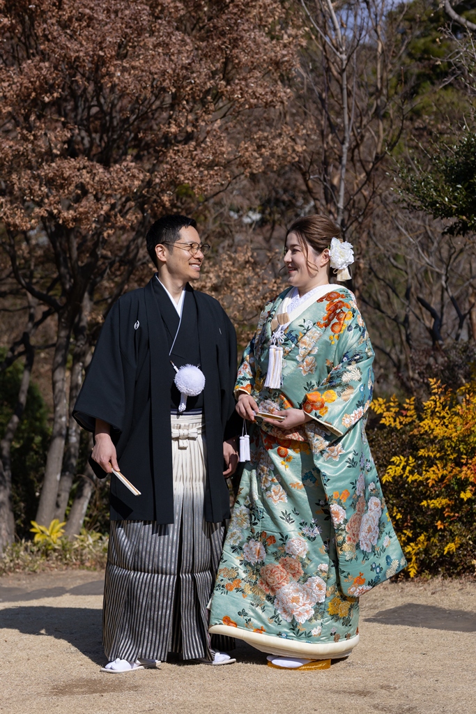 緑あふれる庭園と、おふたりの華やかな和装がとてもよく映えていて、撮影中も何度「素敵ですね〜!」と言ったかわからないくらいでした。自然の中でのびのびとした雰囲気のなか、季節の景色も味方につけながら、おふたりの笑顔が本当に輝いていました!