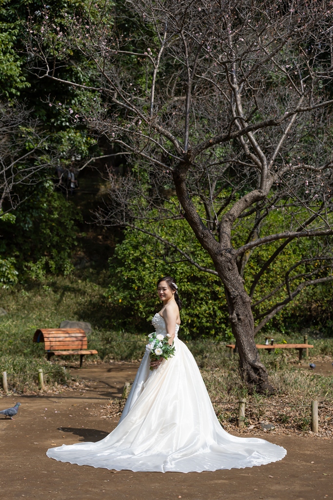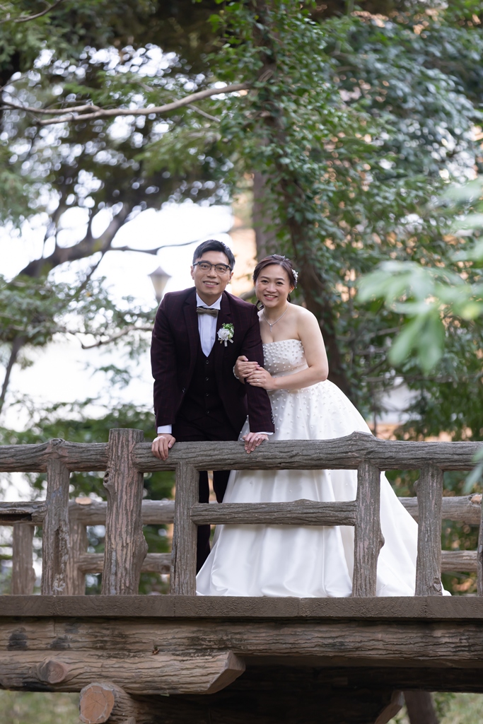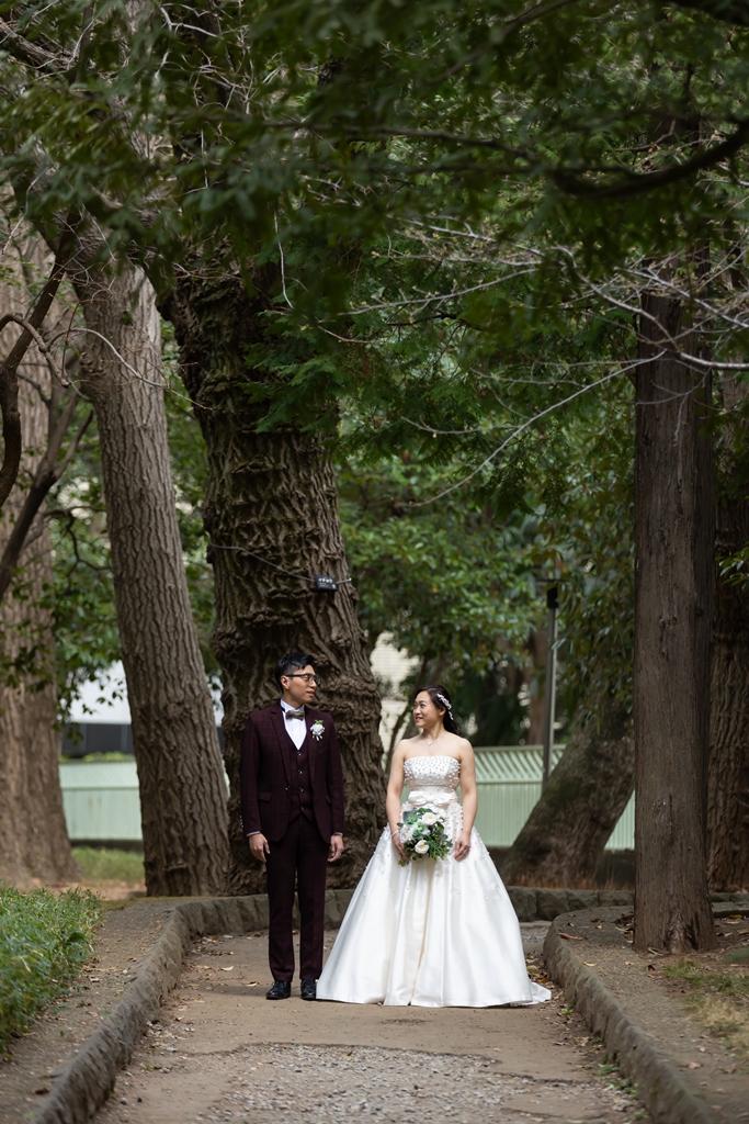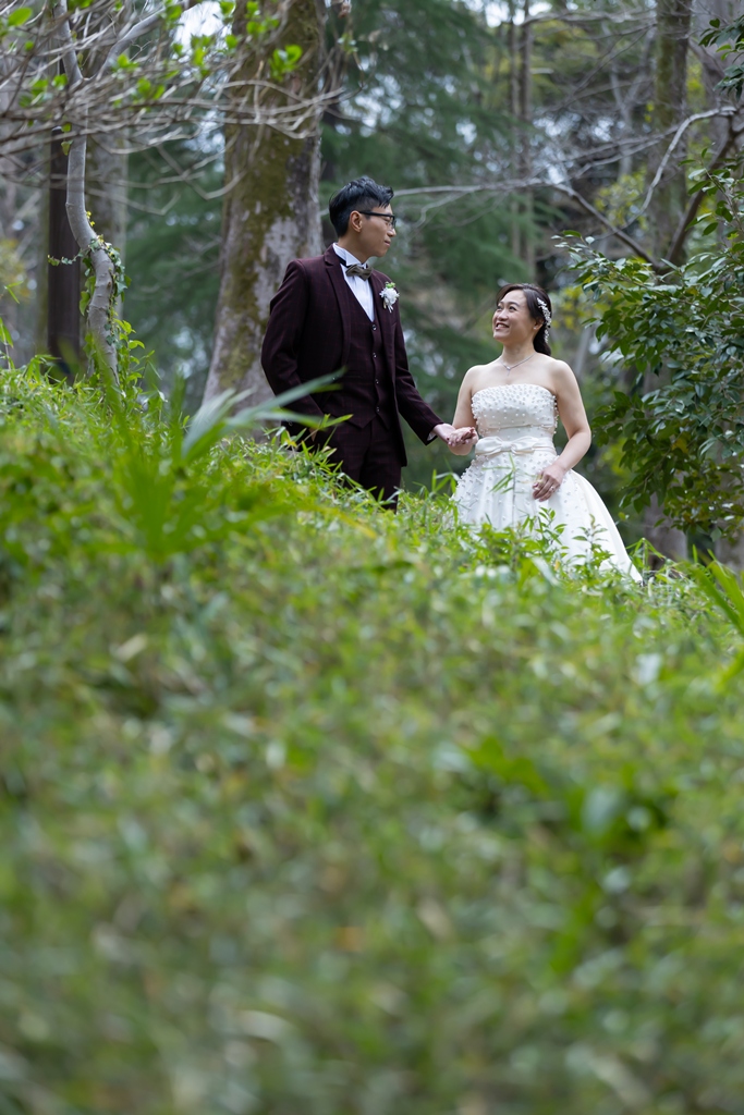 自然に囲まれた穏やかな時間の中、クラシカルな洋装に身を包んだおふたりの姿は、まさに絵本の中のワンシーンのようでした。木漏れ日の中で微笑み合うおふたりの表情や、静かな池のほとりで寄り添うシルエット、ひとつひとつのシーンが本当に美しくて、まるで時間がゆっくりと流れているような、そんな優しい空気に包まれていました。