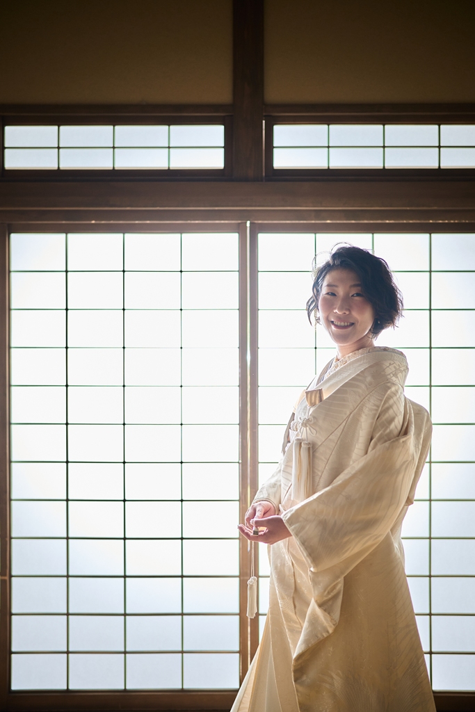 白無垢の透明感と、緑の中でこぼれる自然な笑顔が相まって、心に残る一枚が生まれました♡