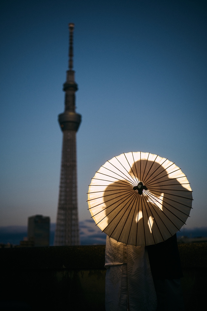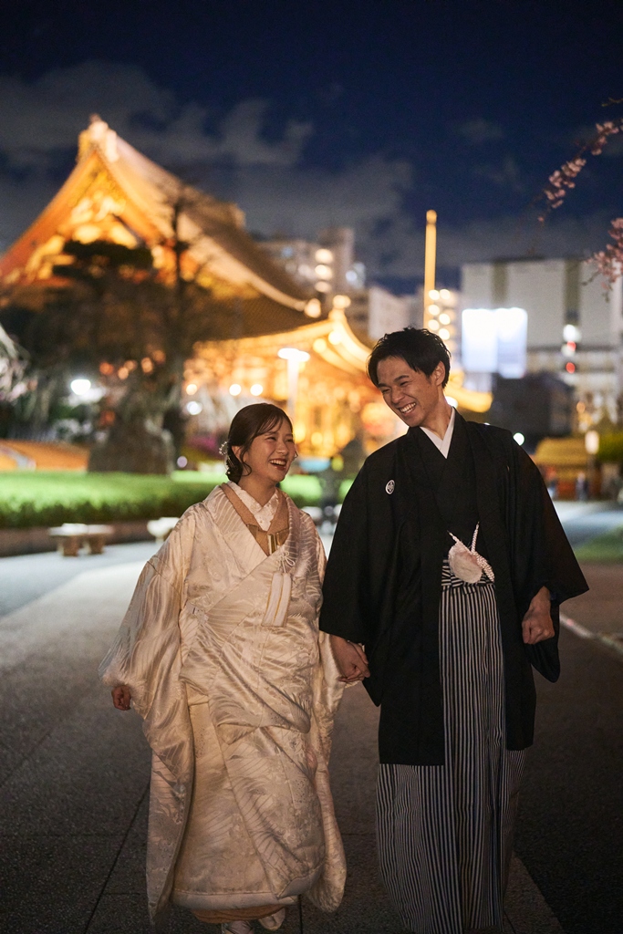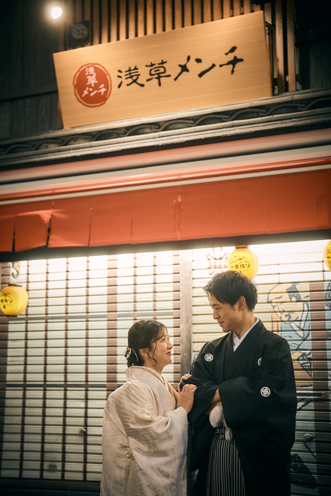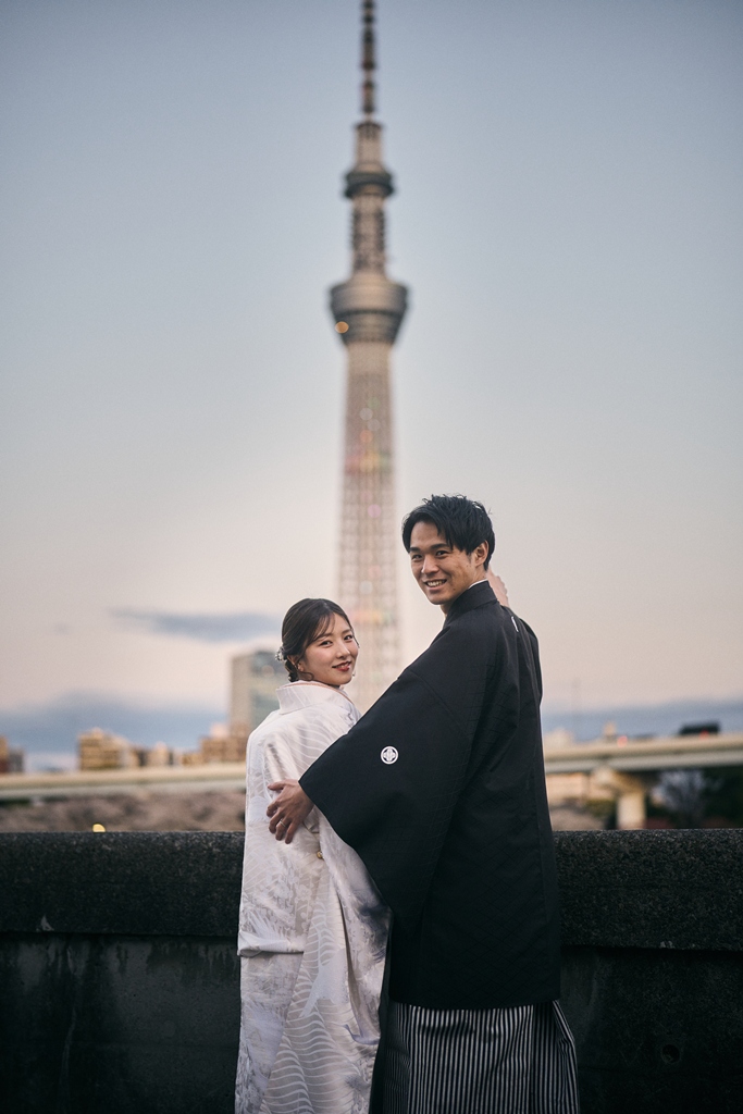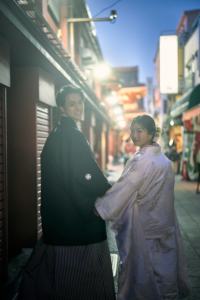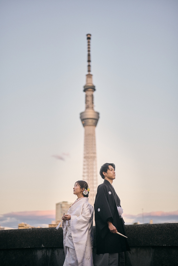 歴史と文化が息づく浅草の街並み。そして、現代の象徴とも言える東京スカイツリー。その2つが共存するこの特別なロケーションで、和装姿のおふたりが歩く姿は、まさに“日本の美”そのものでした。