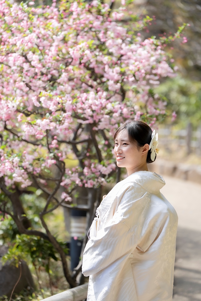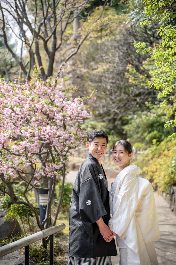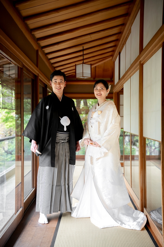 緑豊かで静寂に包まれた目白庭園。その中でおふたりが和装に身を包み歩む姿は、まるで古き良き日本の物語の中に迷い込んだような、息をのむほど美しい光景でした。