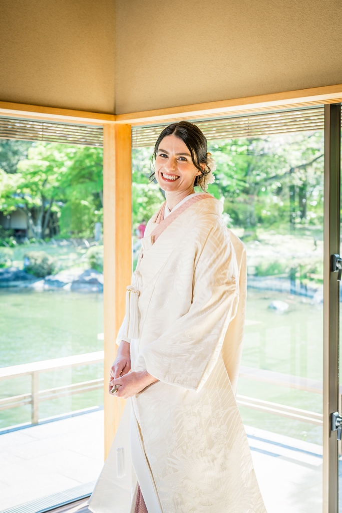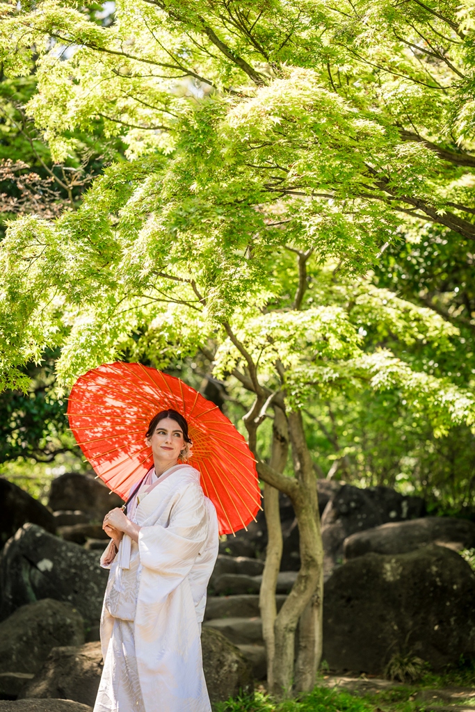 日本の美が息づく庭園と、格式ある和装の融合は、まさに時を超えた一枚一枚の芸術。