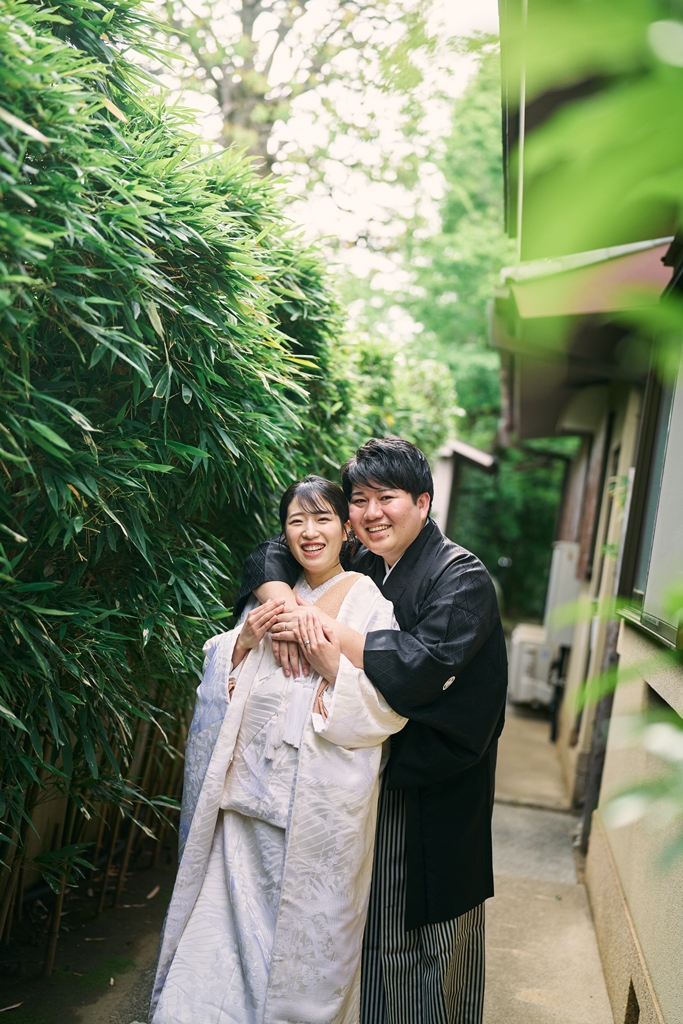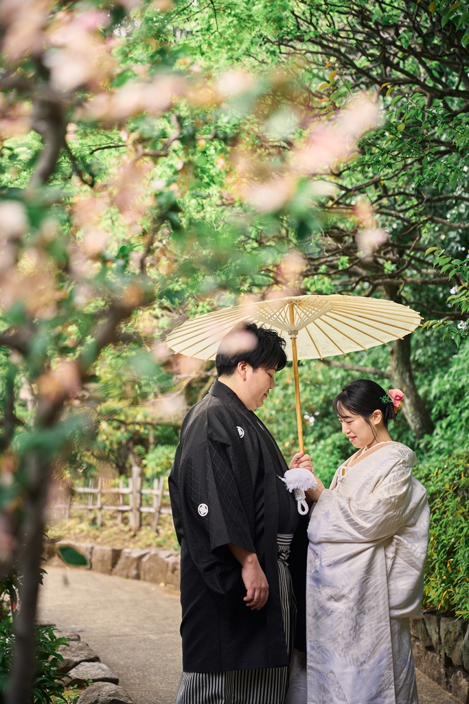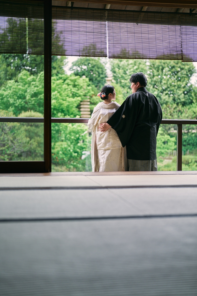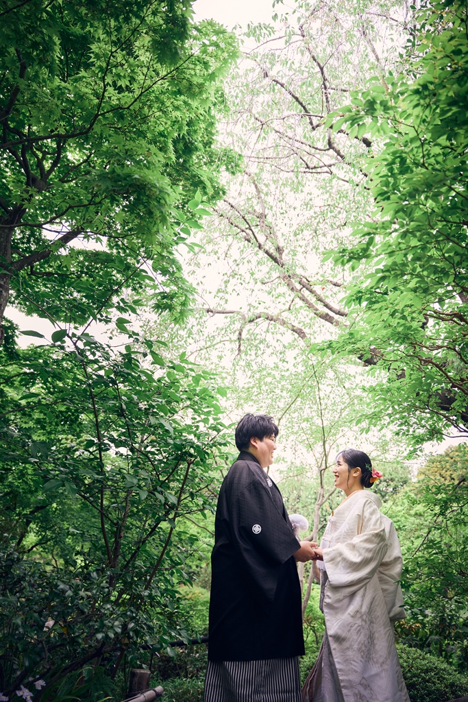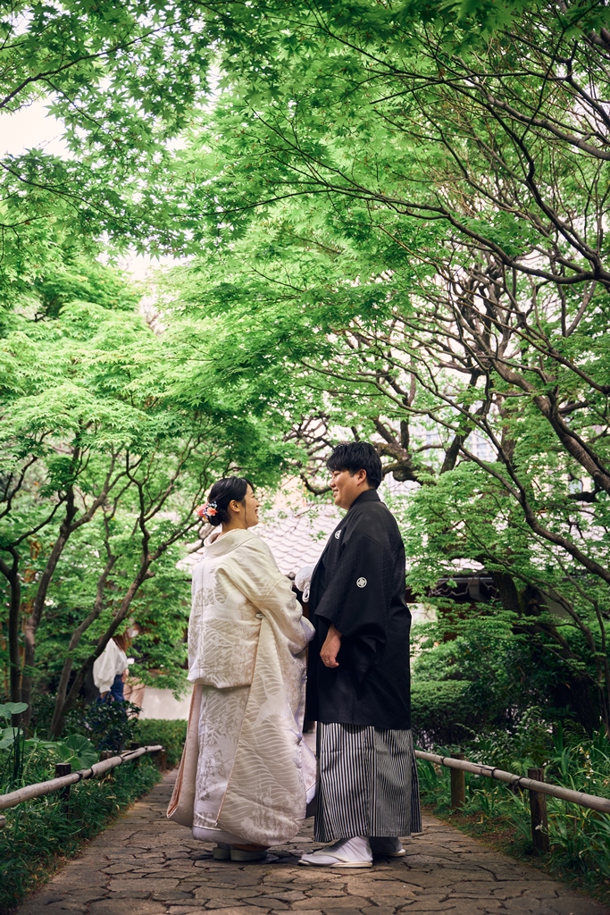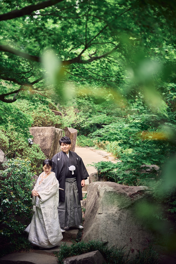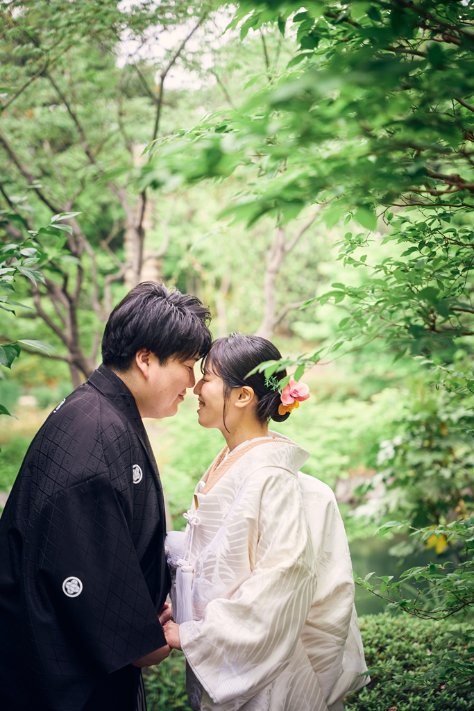 もともと和装で、緑が多いロケーションで撮影したいと思っていました。都内はなかなかそのような場所はなさそうですが、日本庭園での撮影が可能ということでこちらを選びました。新婦が色掛け下を着たかったので、こちらでお願いさせていただきました。