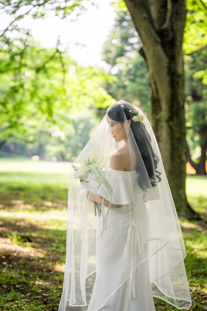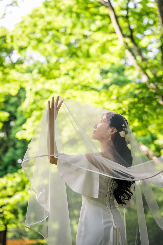 緑の中で風に揺れるドレス、優しい光に照らされたおふたりの姿は、本当に映画のワンシーンのようでした。洋装だからこそ引き立つ、おしゃれで洗練されたおふたりの雰囲気。撮影チームも思わずうっとりしてしまうほど、美しく、心に残る時間となりました。