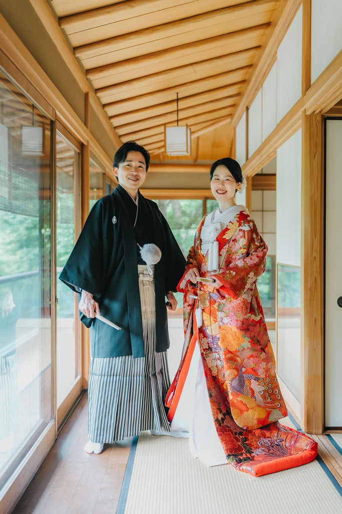 そのすべてが、おふたりの和装姿をいっそう美しく引き立ててくれました。白無垢や色打掛に身を包み、ゆっくりと歩くおふたりの姿は、まるで時間が少し止まったかのような、穏やかで尊い瞬間でした。