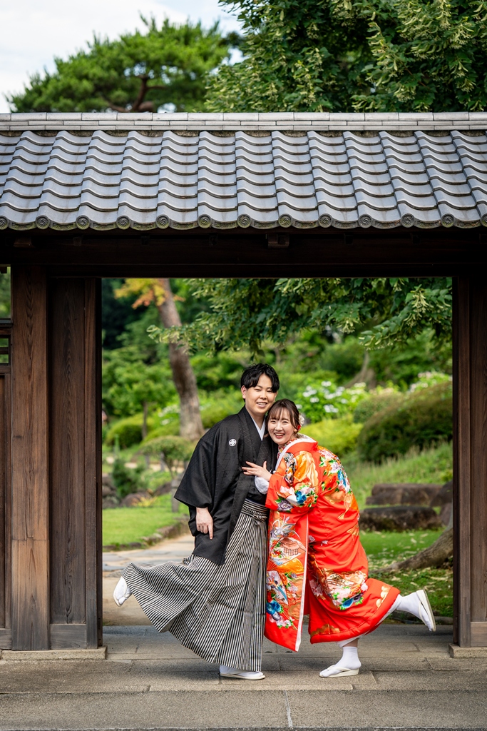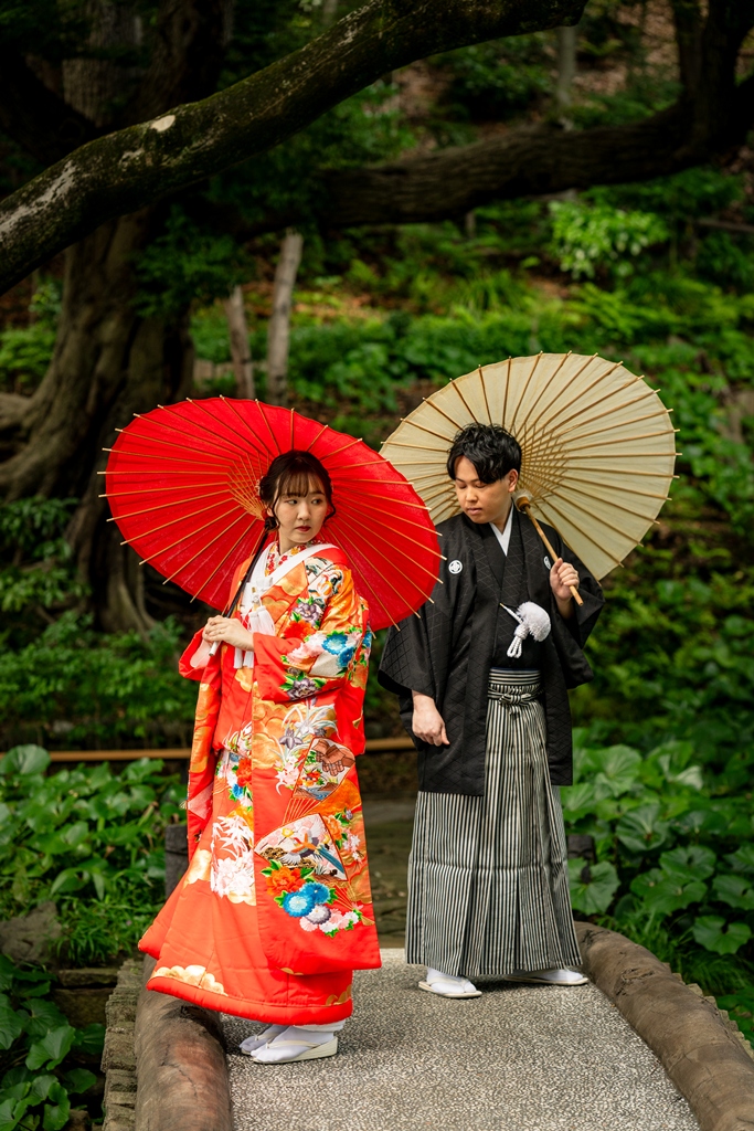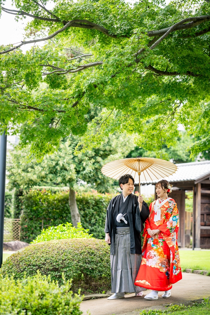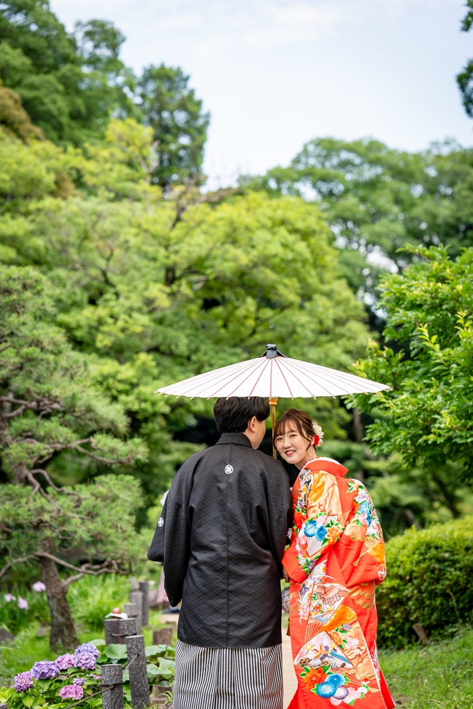 肥後細川庭園は、四季折々の表情を見せる木々や池、石畳や茶室といった日本庭園の趣が凝縮された、特別な場所です。その空間におふたりが自然と溶け込み、和装の美しさとともに、静かな情熱やこれからの決意が写真一枚一枚から伝わってきました。