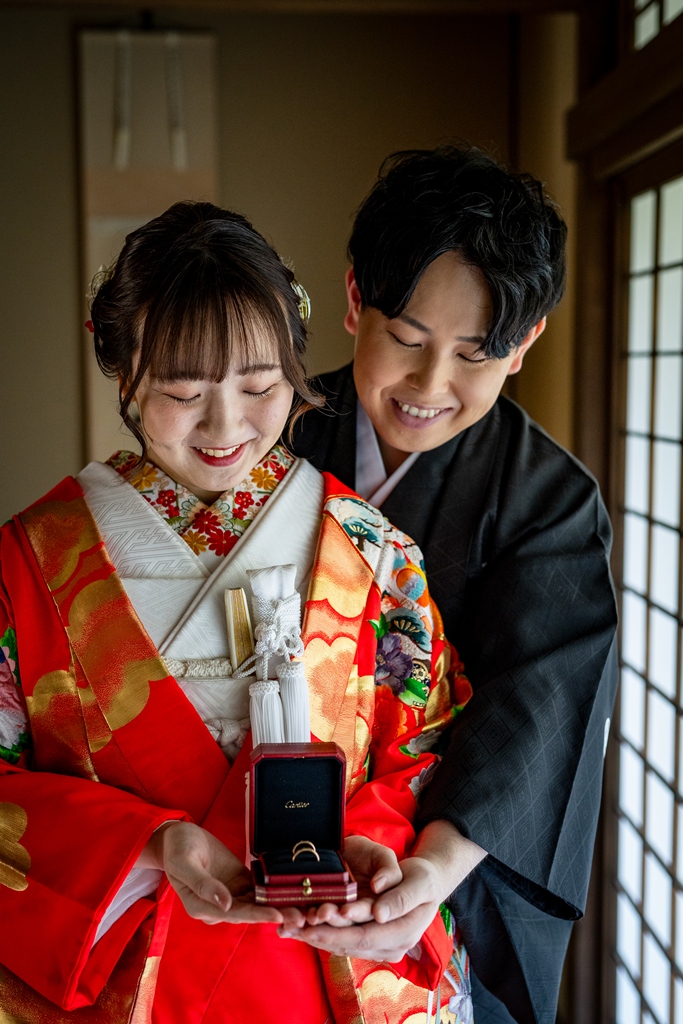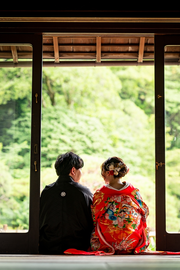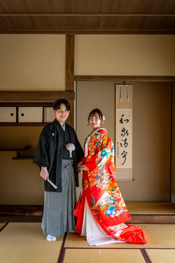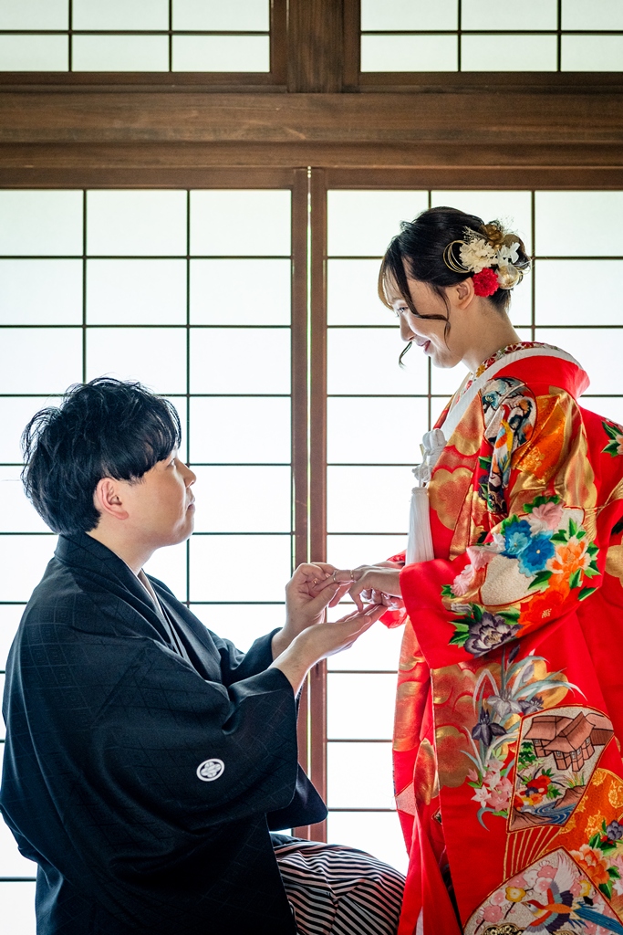 撮影中は、時に笑い合い、時にしっとりと目を閉じて思いを馳せる、そんなおふたりの表情のひとつひとつがとても印象的で、スタッフ一同、心から胸を打たれました。形式や流行ではなく、“自分たちらしさ”を大切にされているおふたりだからこそ、この和の空間にこれほど美しく寄り添えたのだと思います。