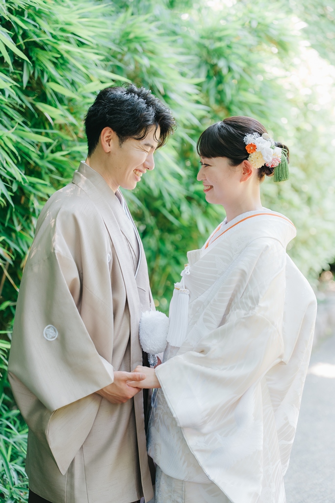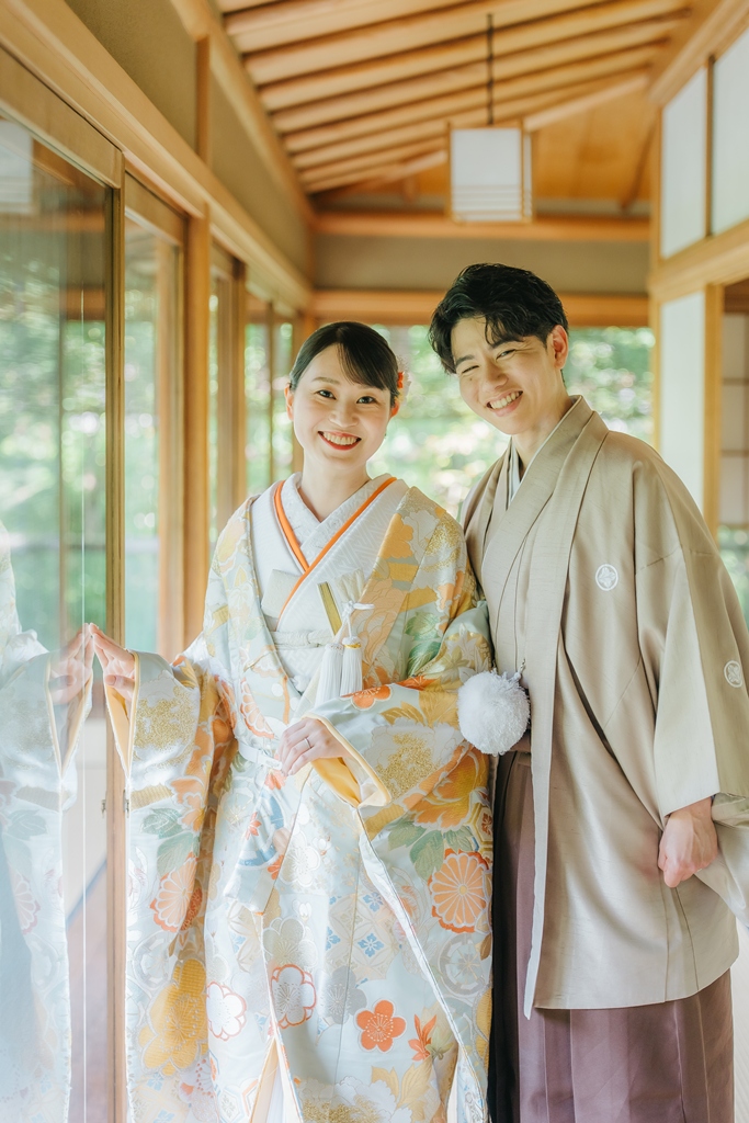 都会の喧騒から一歩離れた静寂の中、四季折々の自然と日本の美が息づく目白庭園。その凛とした空気に包まれながら和装に身を包んだおふたりの姿は、まるで時を超えて現れた物語の主人公のようでした。洋装のときの華やかでモダンな雰囲気とはまた違い、和の衣裳が醸し出す品格と奥ゆかしさが、おふたりの内に秘めた強さややさしさを引き立てていたのがとても印象的でした。