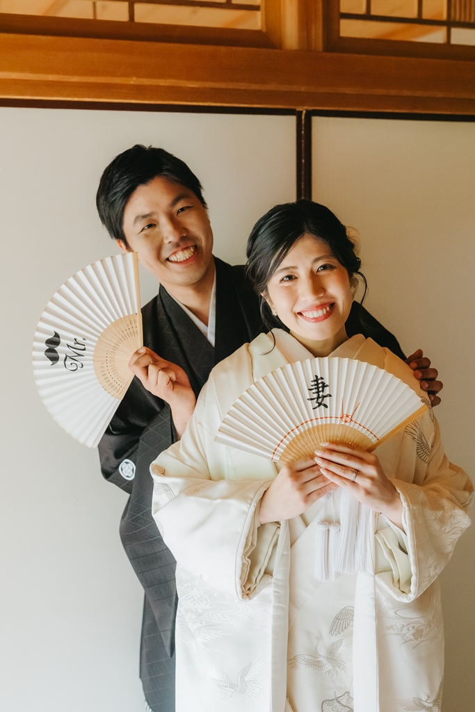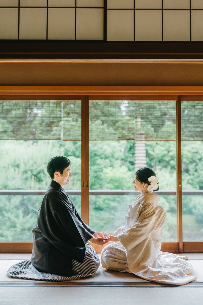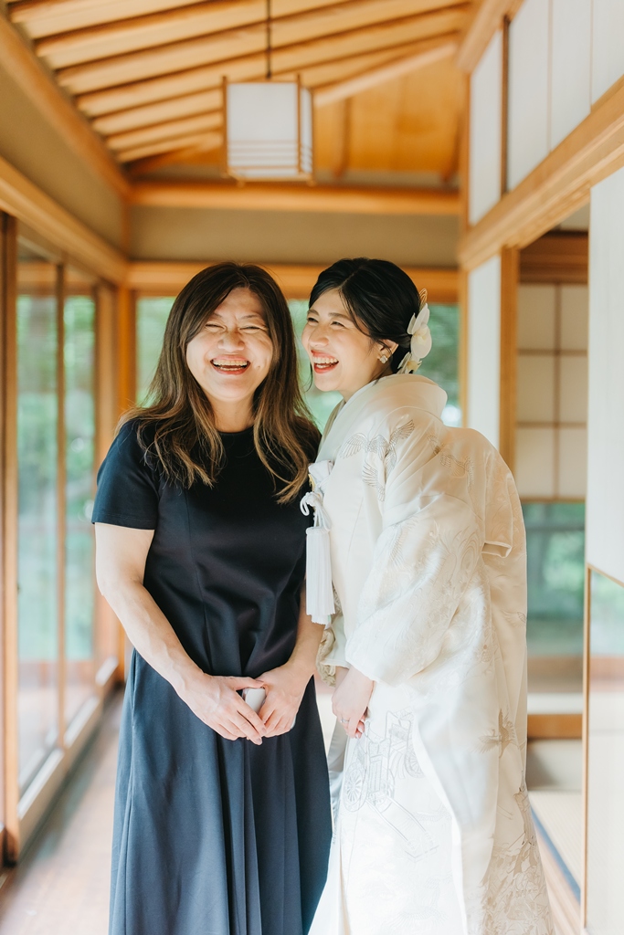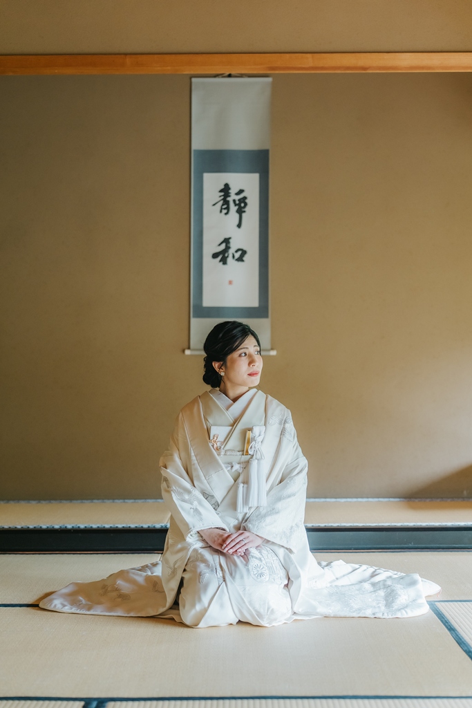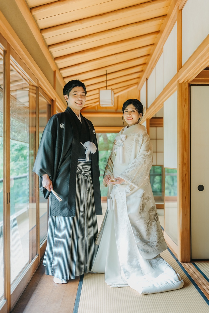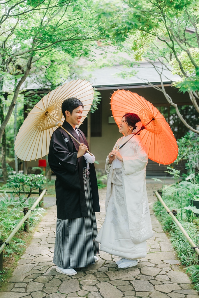 目白庭園では、四季折々の自然と静謐な佇まいの中で、伝統美を纏われたおふたりの凛としたお姿がまるで物語の主人公のように輝いていました。庭園の豊かな景観が和装の格調を引き立て、おふたりの絆の深さまでも映し出してくれたように感じます。