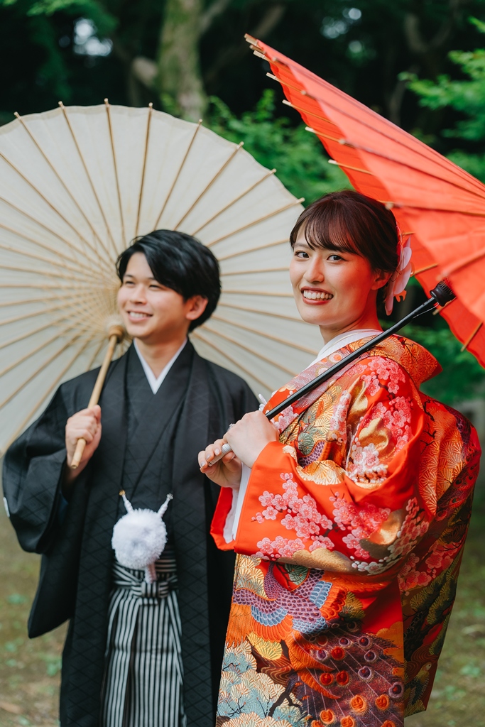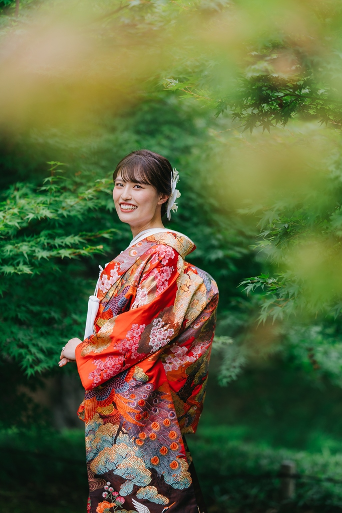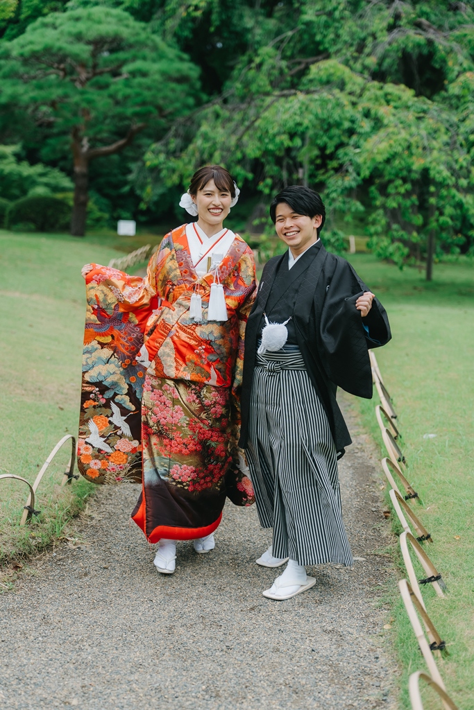 一歩一歩進むたびに、景色が移ろい、まるで物語の中を歩いているかのような撮影となりました。日本の美と伝統が息づくこの庭園で、優雅に微笑み合うおふたりの姿は、まさに時代を超えて愛を語る一枚だったと感じております。