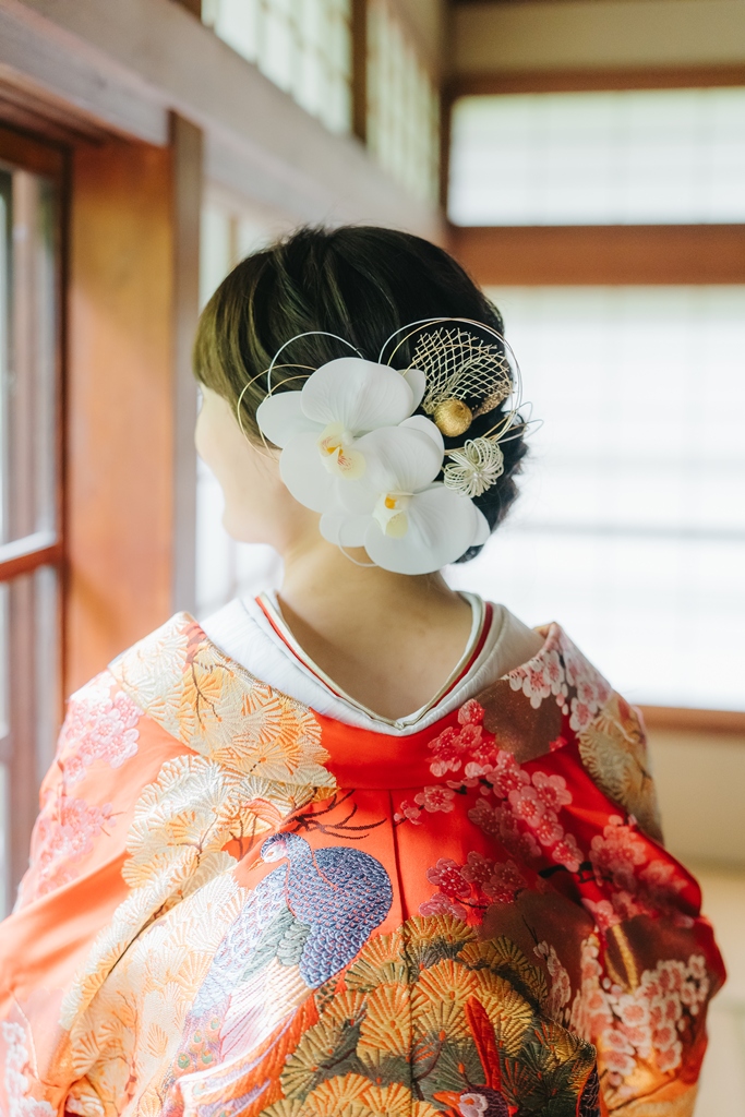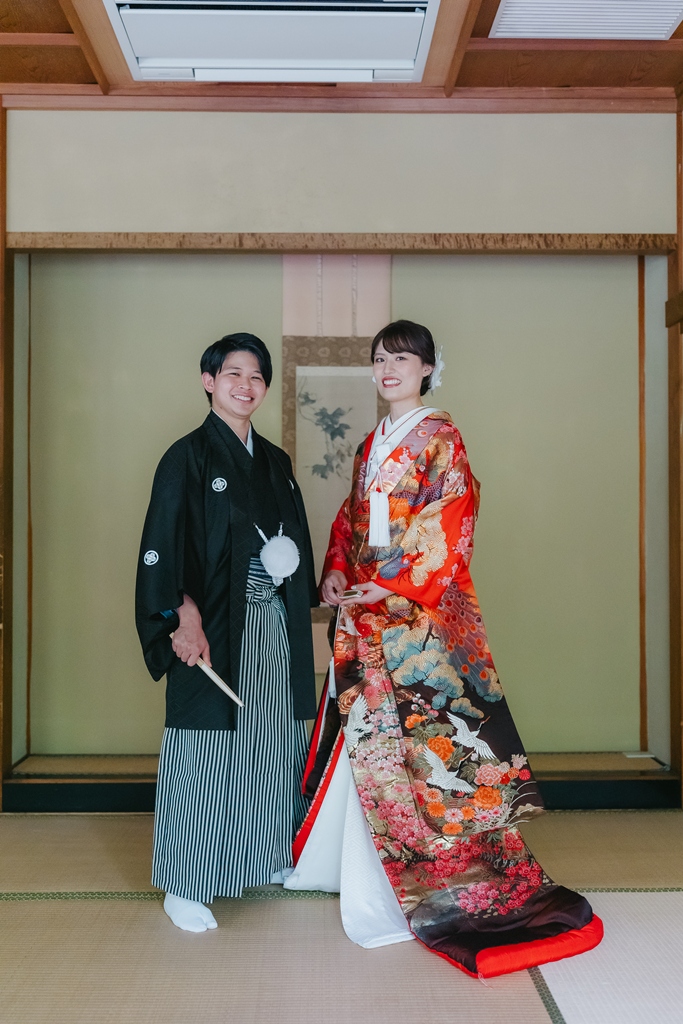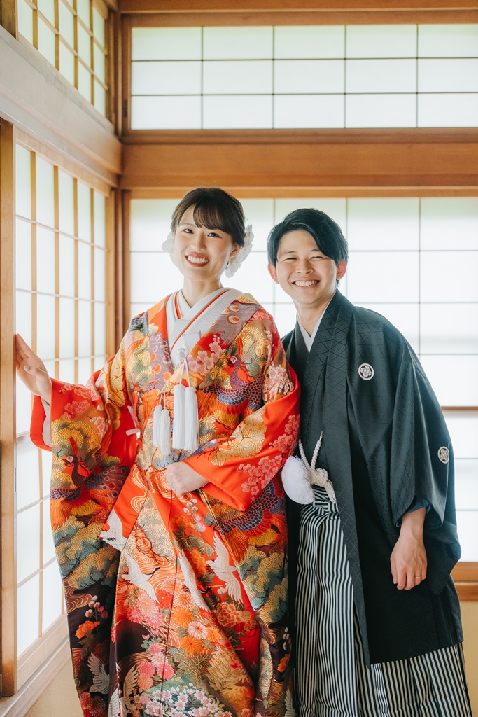 池泉回遊式庭園ならではの変化に富んだ風景と、趣ある建築や橋、そして柔らかな自然の光が、おふたりの凛とした和装姿を一層引き立てていました。