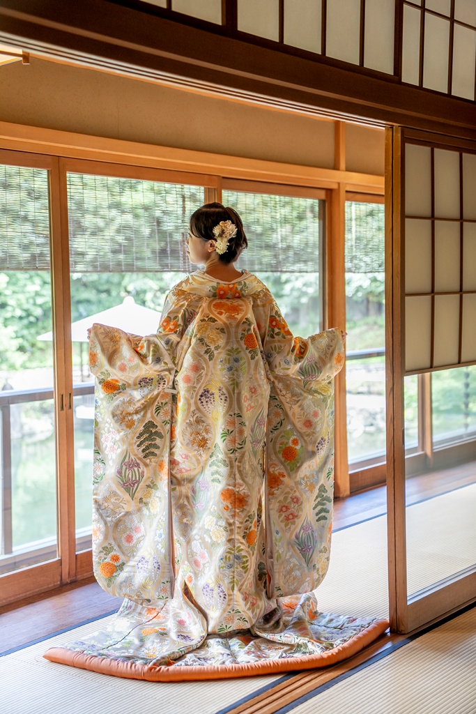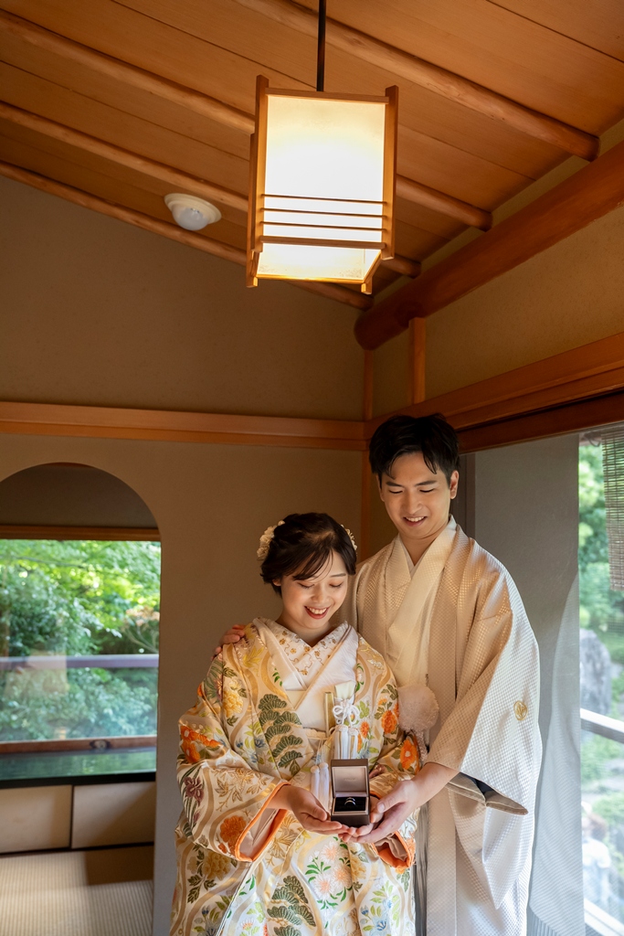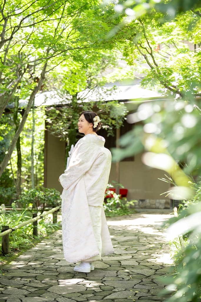 凛とした着物姿のおふたりが、その情景の中をそっと歩まれる姿は、静けさの中に華やかさが宿る、心に残る一瞬だったと感じております。撮影中には、ゆったりと流れる時間の中で、ふたりの自然な表情ややさしい眼差しが次々に現れ、その一枚一枚に、和装ならではの品格とあたたかさが込められていました。