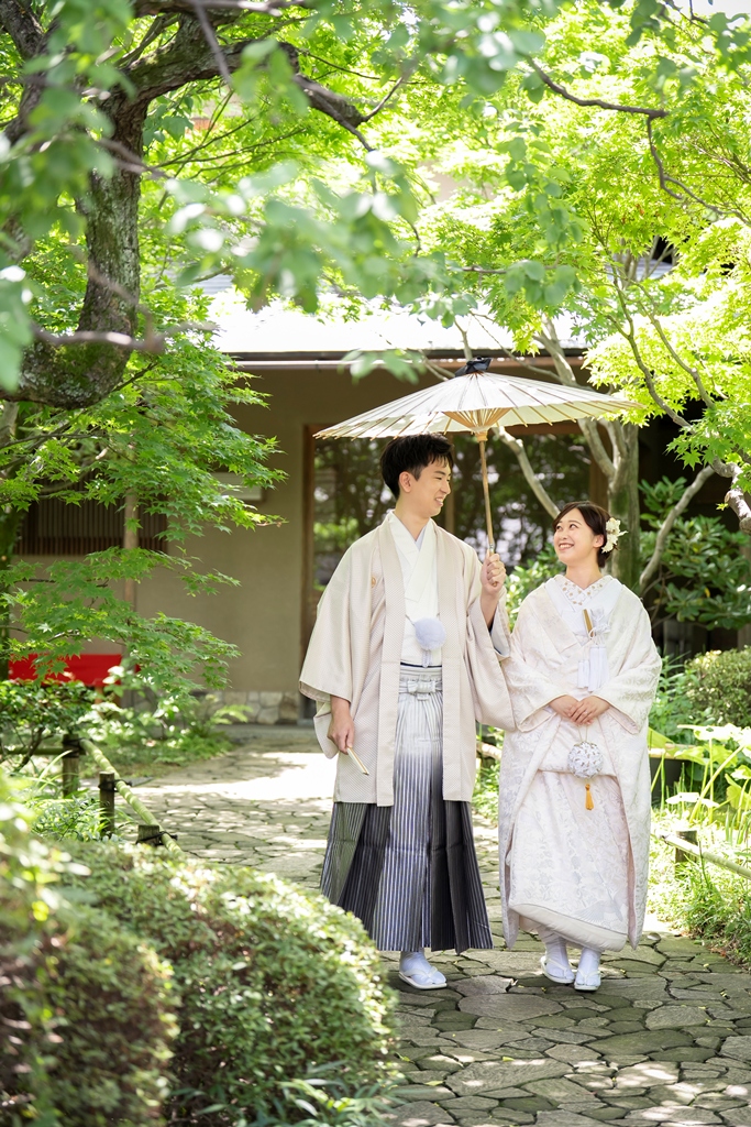 建物の縁側や庭の石畳、映り込む水面、舞い降りる木漏れ日など、目白庭園ならではの情緒ある風景が、おふたりの想いをそっと包み込み、特別な物語を紡いでくれたように思います。何年経っても、写真を見返すたびに、この日この場所で過ごされた穏やかな時間が鮮やかによみがえり、ふたりの記憶にやさしく寄り添い続けることを願っております。