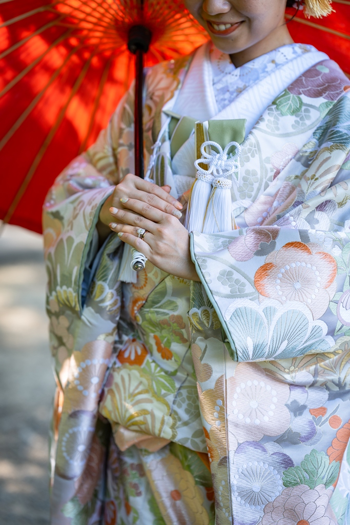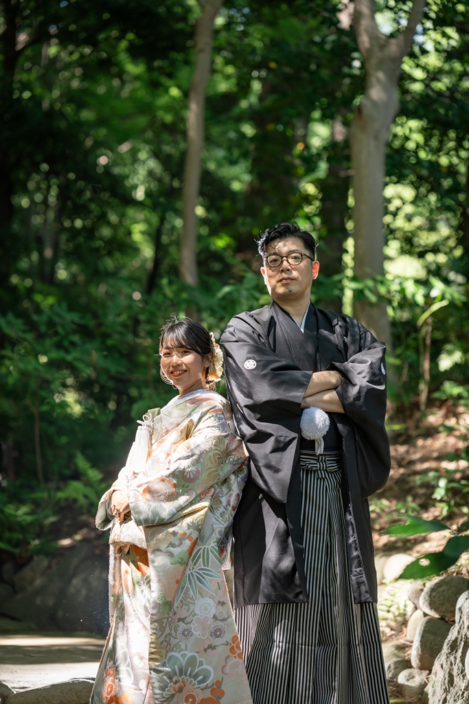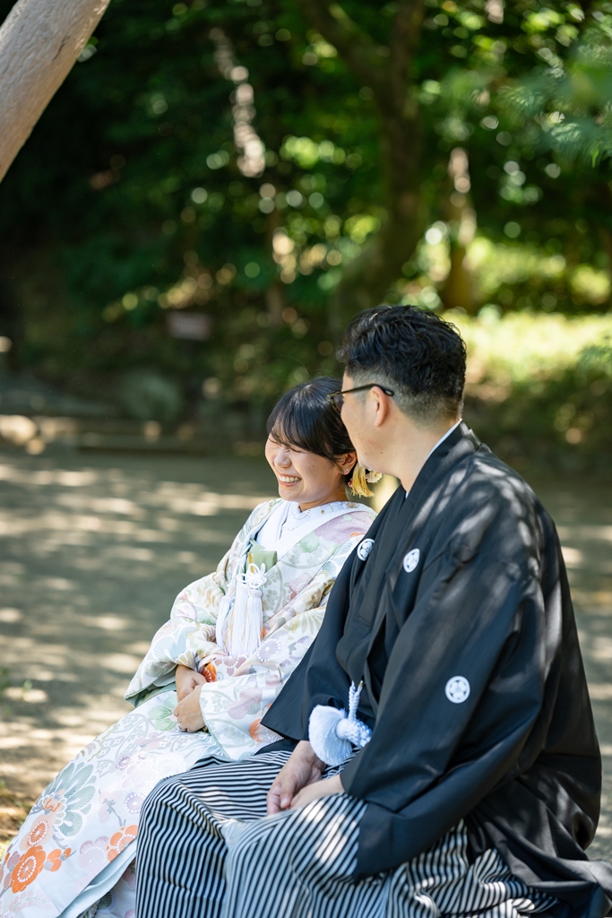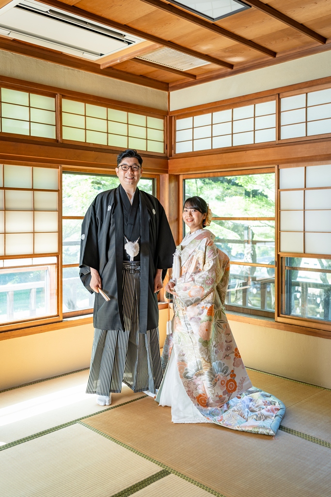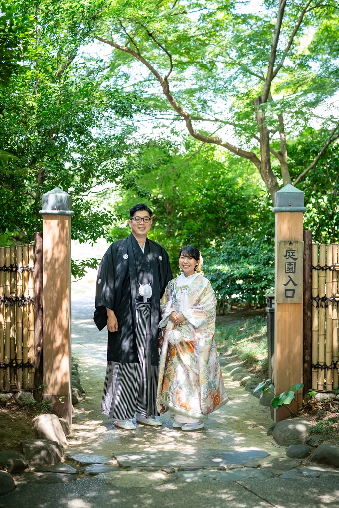 小石川後楽園は、江戸の時代から人々に愛され続けてきた日本庭園。水面に映る光や、四季折々に移ろう木々の彩りは、和装の魅力を格別に引き立て、おふたりの姿を一層輝かせてくれました。その景色の中で交わされた笑顔や眼差しは、写真という形を超え、未来への誓いを映し出すかけがえのない瞬間となったことでしょう。