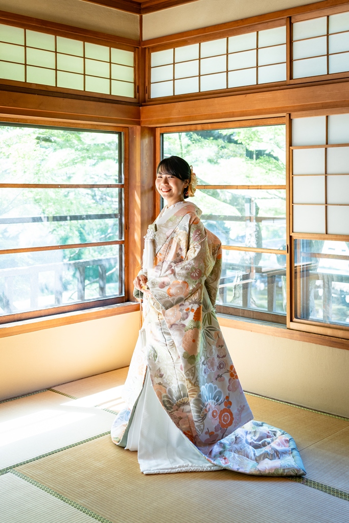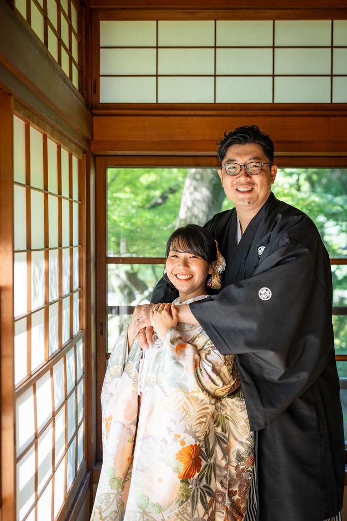 静寂に包まれた庭園を歩むおふたりの姿は、まるで時を超えて紡がれてきた物語の一頁のよう。和装が持つ気品と奥ゆかしさが、自然と調和し、唯一無二の美しさを奏でていました。流れる水音や風の囁きまでが祝福の調べとなり、この日の時間を永遠に記憶へと刻んでくれたに違いありません。