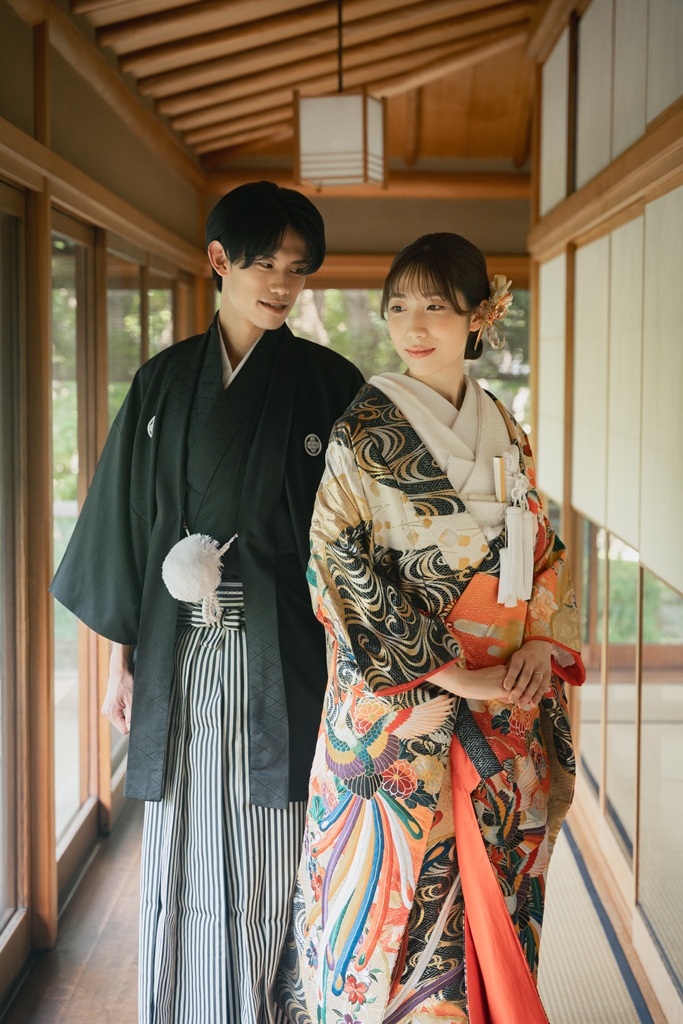 池に映る光と木々の緑に包まれたおふたりの後ろ姿は、穏やかでありながらも凛とした存在感を放ち、見る人の心を深く揺さぶります。また、おふたりの笑顔や寄り添う仕草は、和装が持つ厳かな雰囲気に温もりを添え、写真一枚一枚に物語を刻んでくれました。
