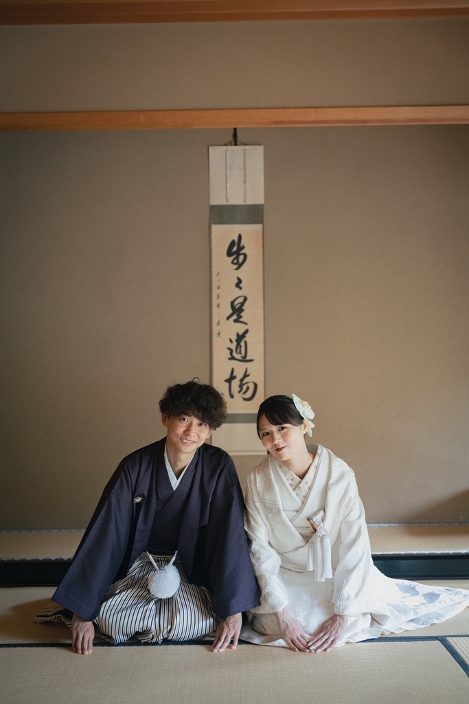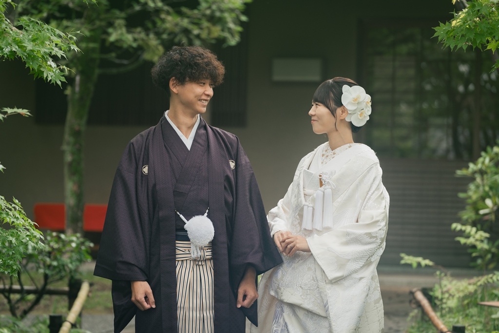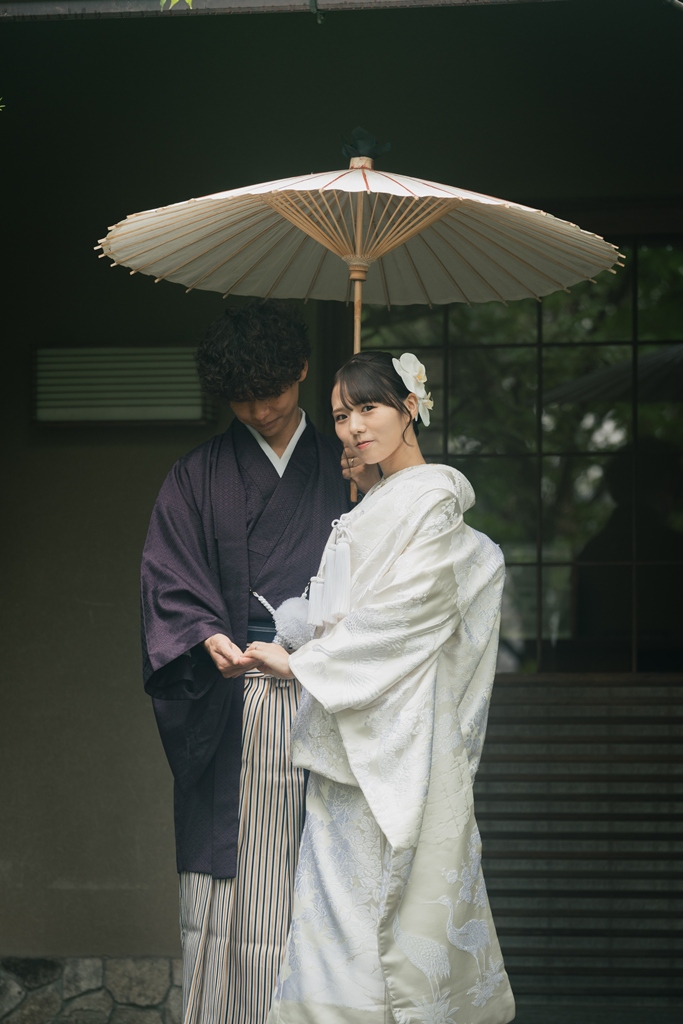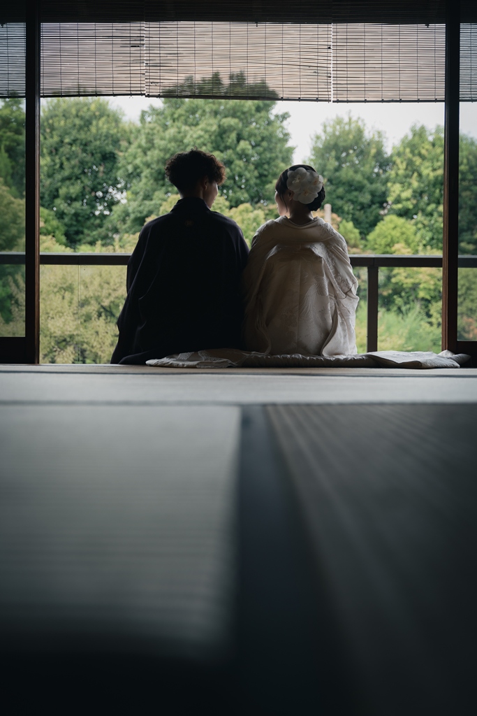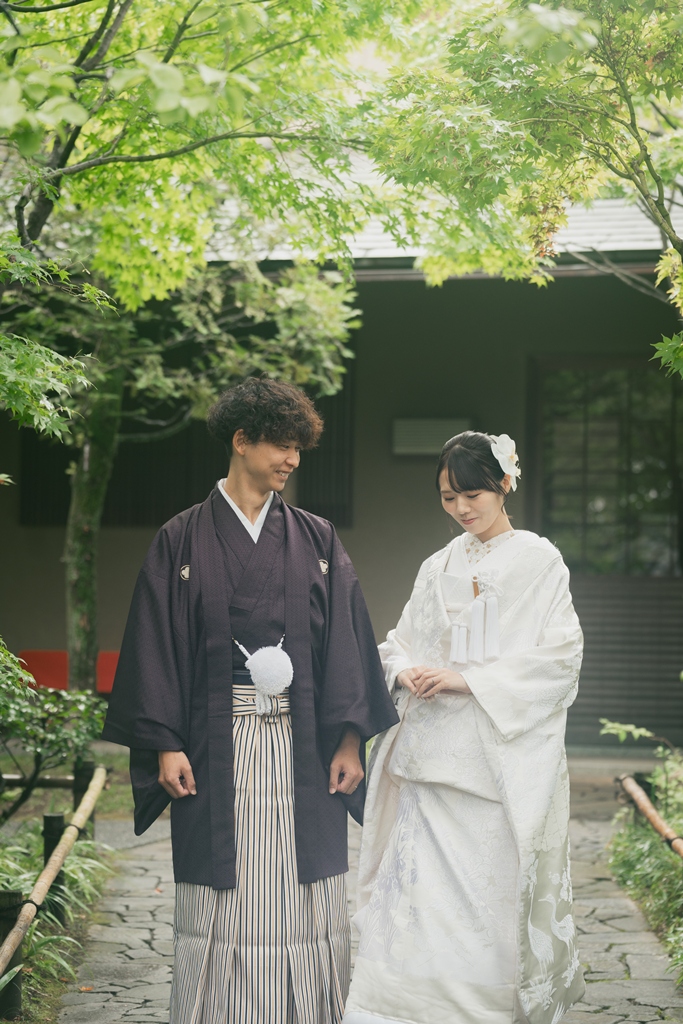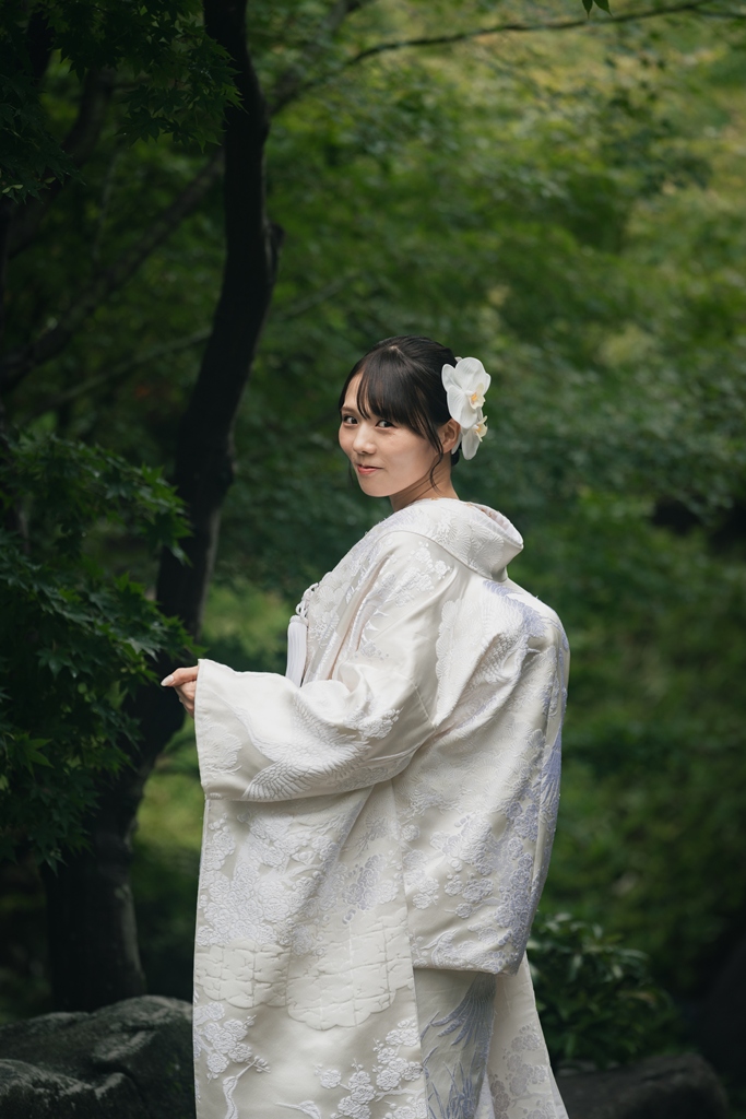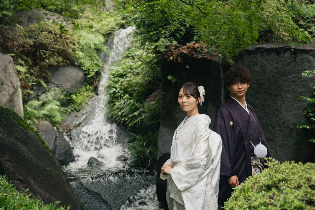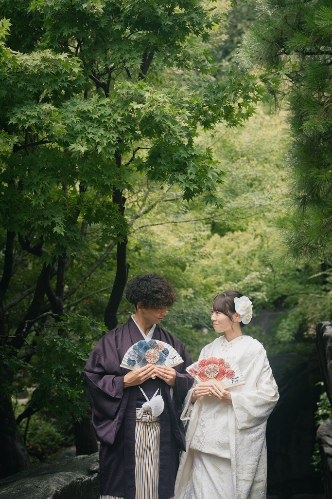 日本の伝統美を纏い、緑豊かな庭園の静けさの中で過ごす時間は、まるで時が止まったかのような特別な瞬間だったことと思います。お二人の美しい姿は、まるで絵巻物から抜け出してきたかのようで、和装の格式と気品が、庭園の風景に溶け込み、唯一無二の物語を紡ぎました。