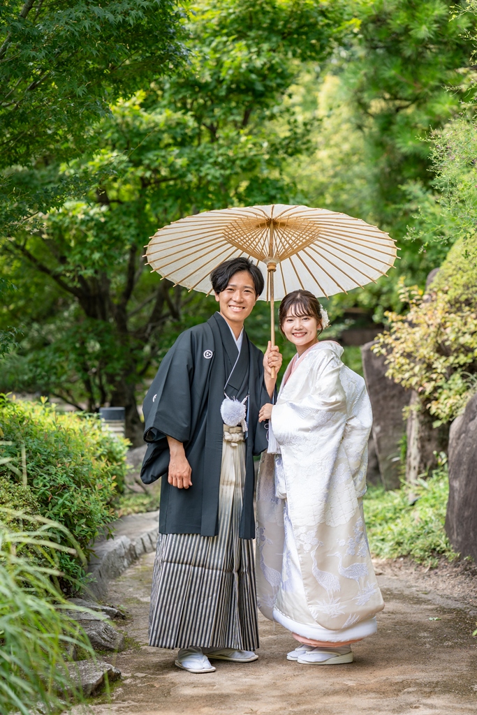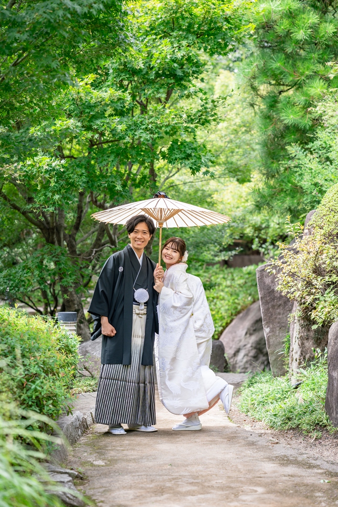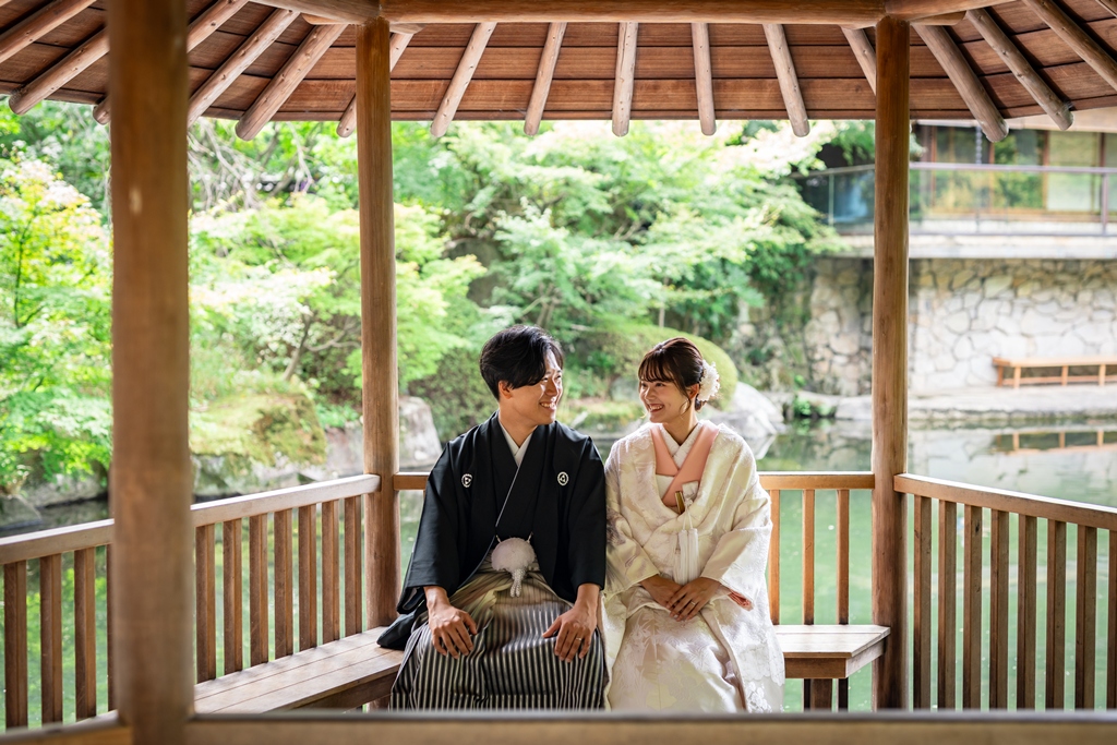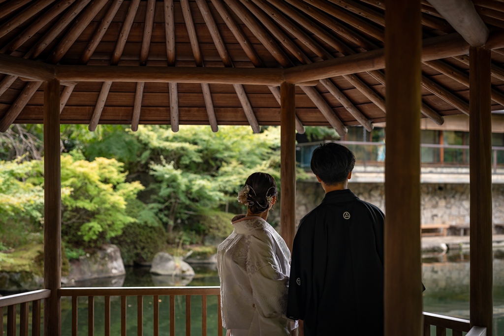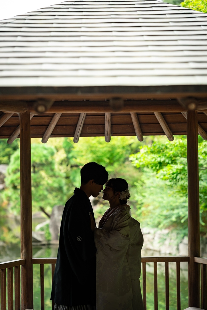 静寂と雅やかさを併せ持つこの庭園は、まるで日本の美そのもの。紅葉の彩りや水面に映る光、緑に包まれた回遊式庭園の佇まいが、おふたりの装いをより一層引き立ててくれましたね。