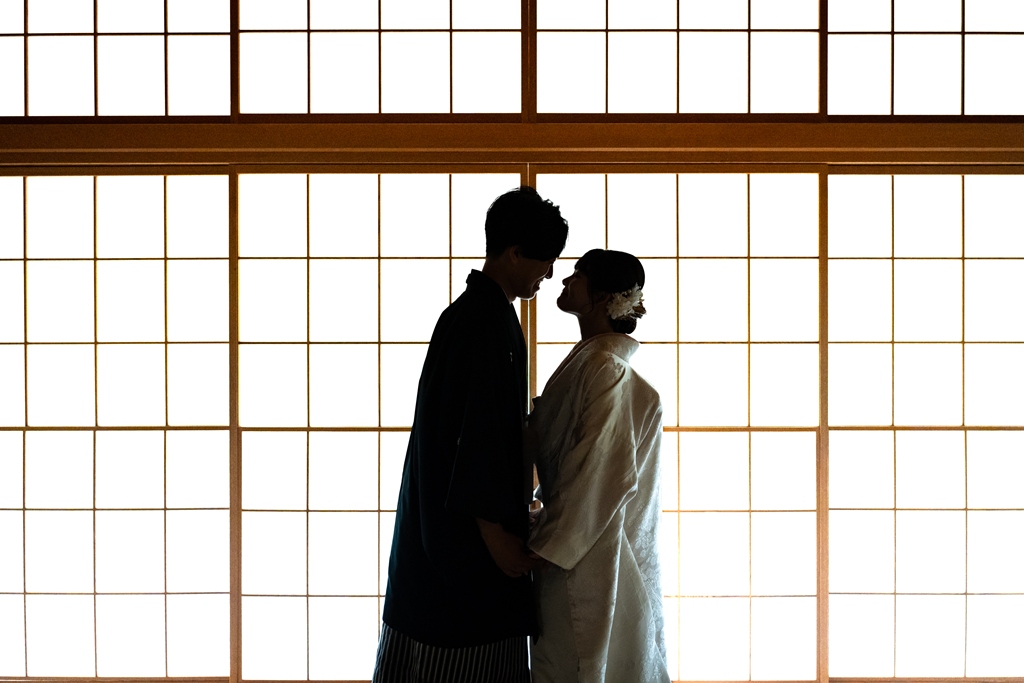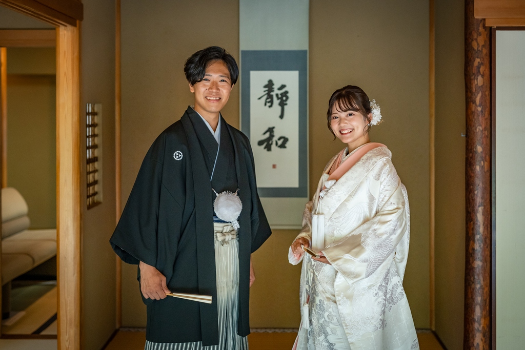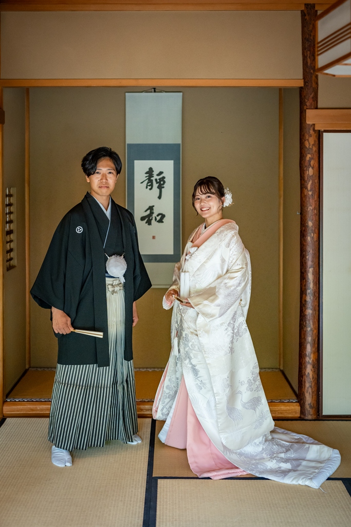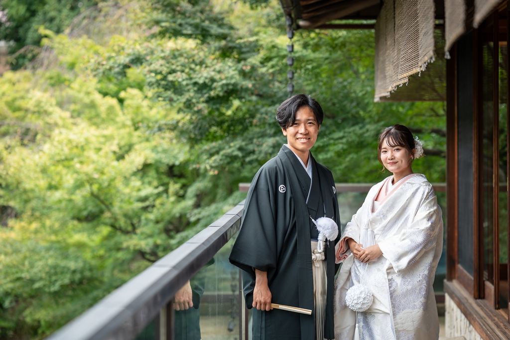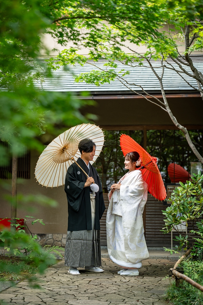 静寂と雅やかさを併せ持つこの庭園は、まるで日本の美そのもの。紅葉の彩りや水面に映る光、緑に包まれた回遊式庭園の佇まいが、おふたりの装いをより一層引き立ててくれましたね。