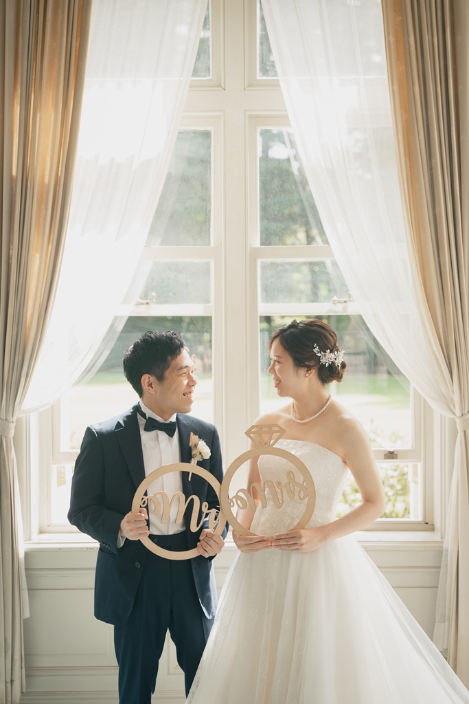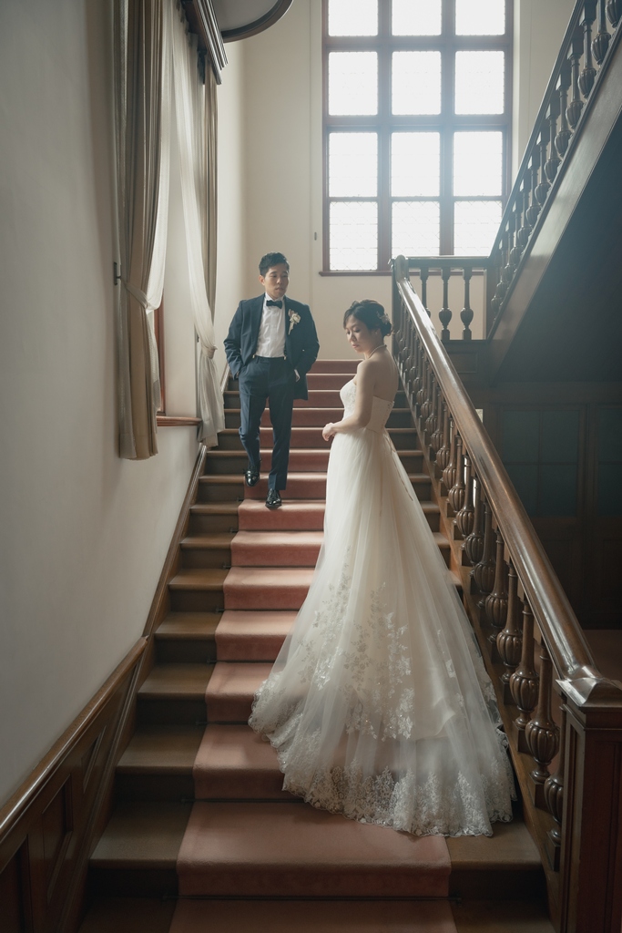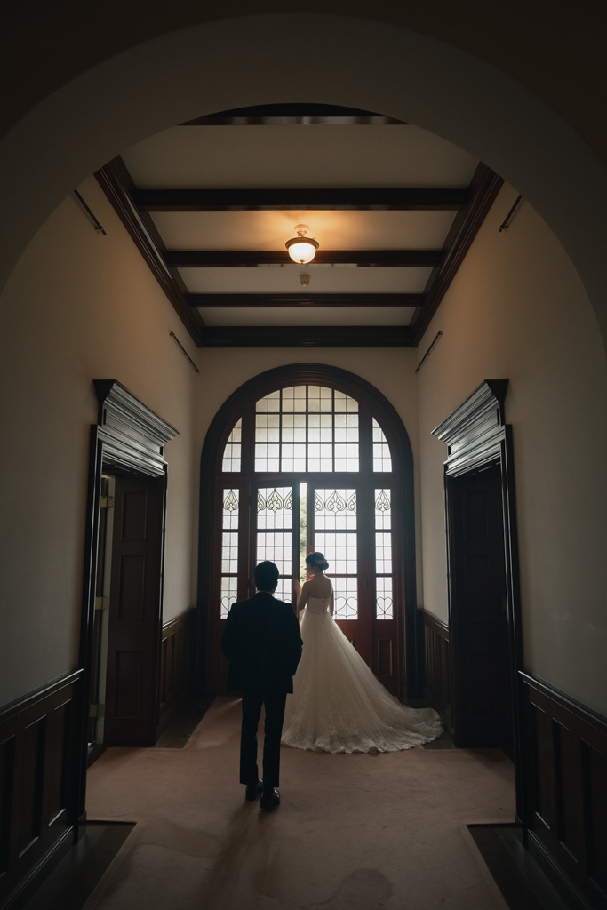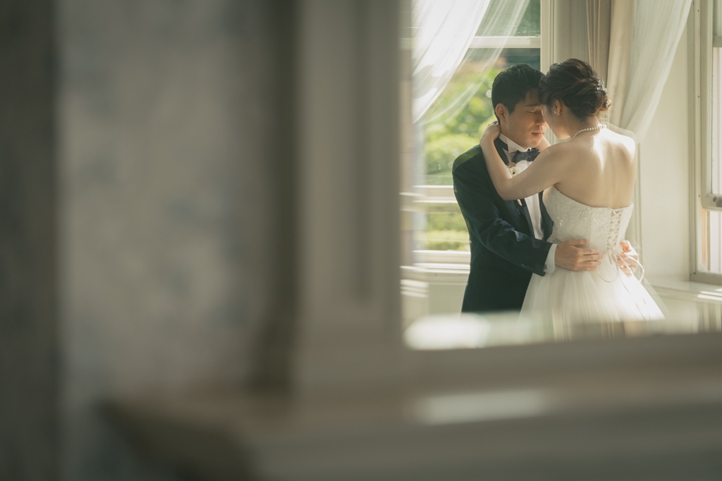 歴史ある建築と豊かな緑に囲まれた空間の中で、おふたりが寄り添う姿はまるで物語の主人公のようで、撮影のひとときがまさに芸術作品のように感じられました。重厚な石造りの外観やクラシカルな内装が、純白のドレスとタキシードの美しさを際立たせ、まるで時を超えて愛が描かれていくような瞬間の連続でした。
