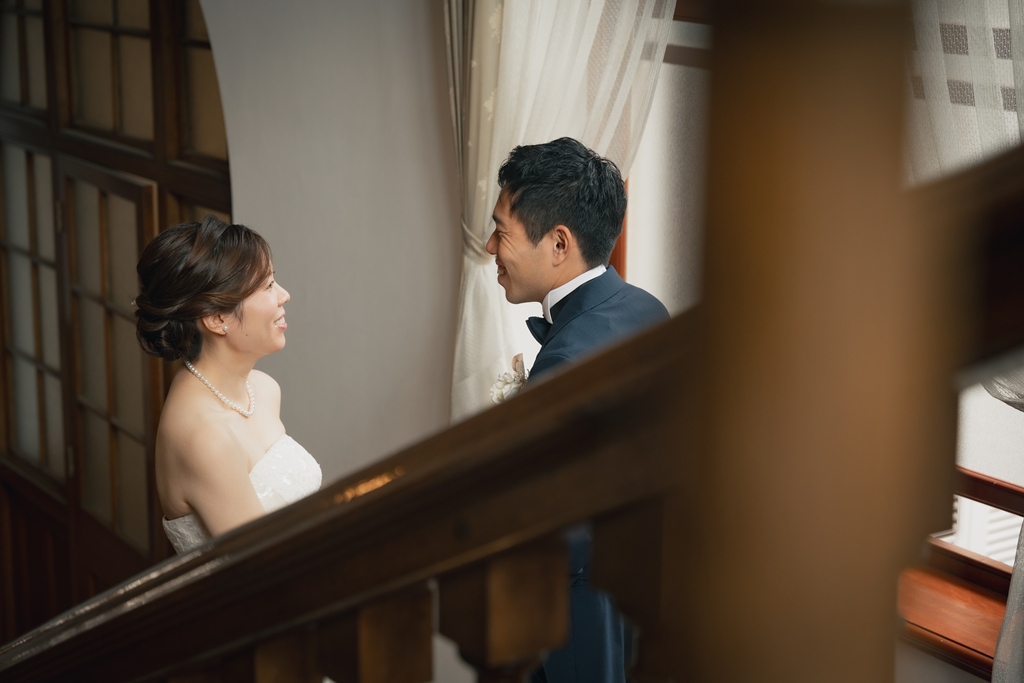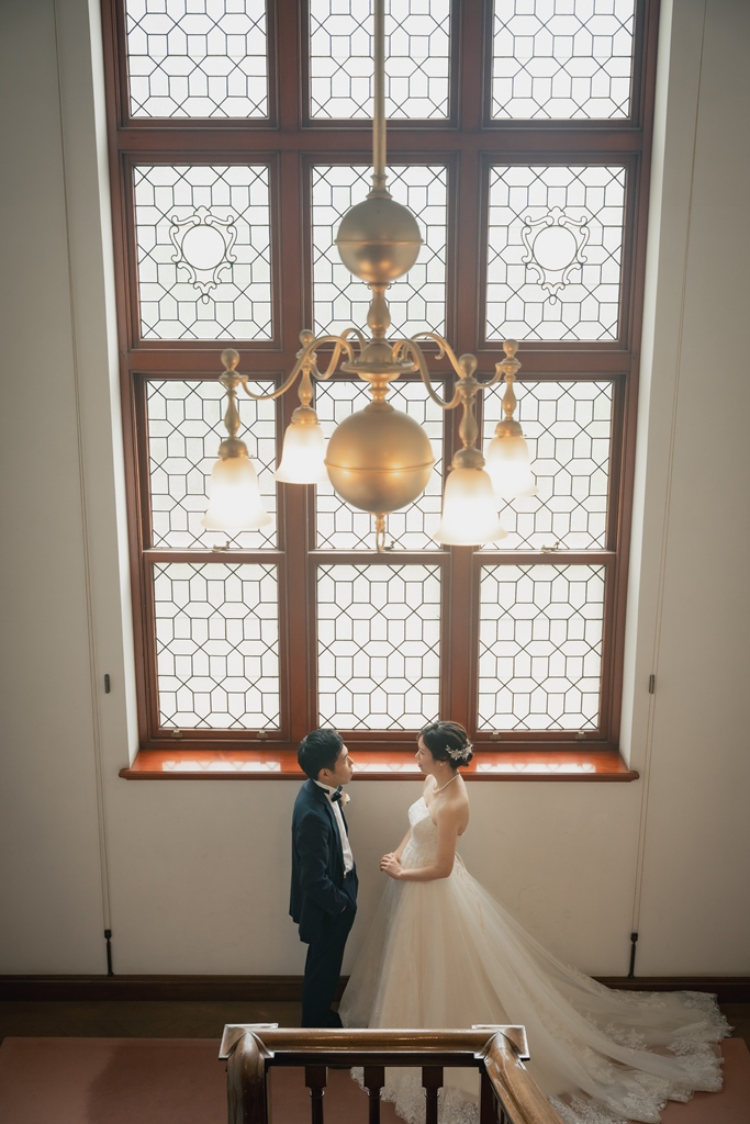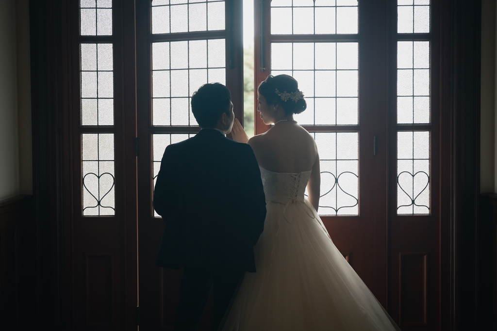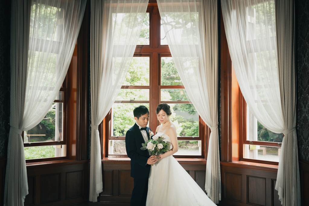 光が差し込む窓辺に立つおふたりの姿や、庭園で風に包まれながら微笑み合う表情には、言葉にできないほどの温もりと優しさがありました。旧古河邸は、明治の面影を色濃く残す特別な場所です。