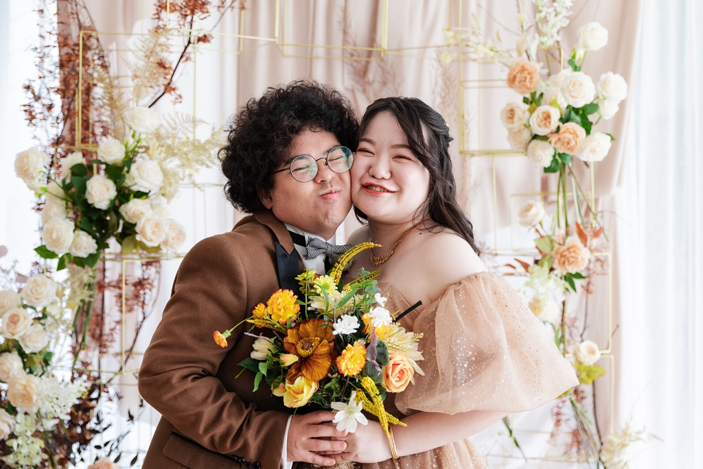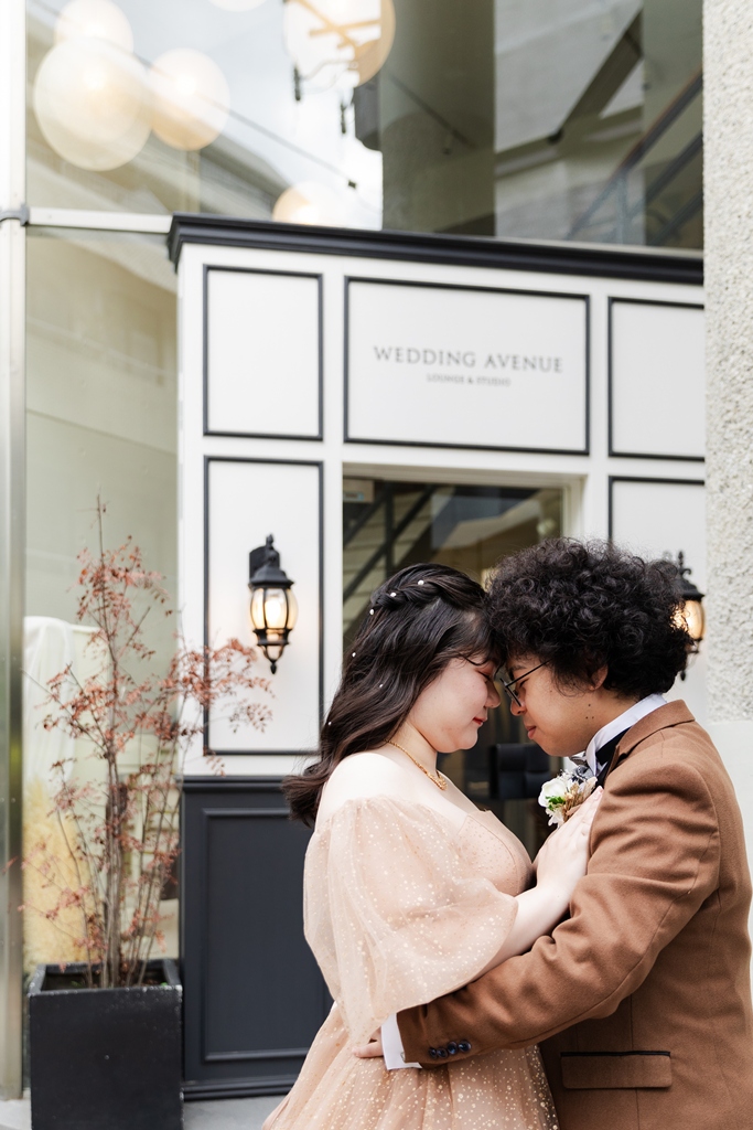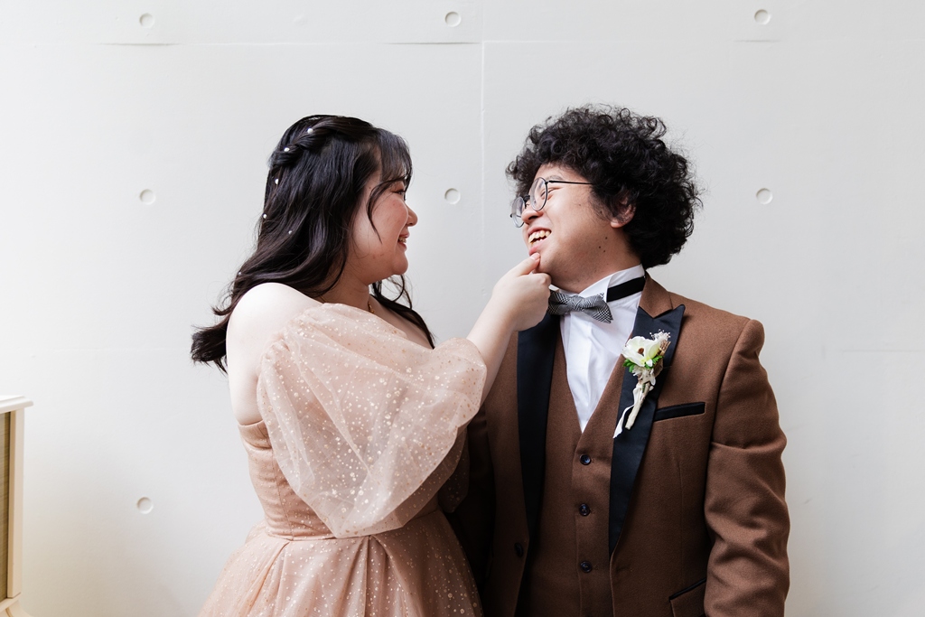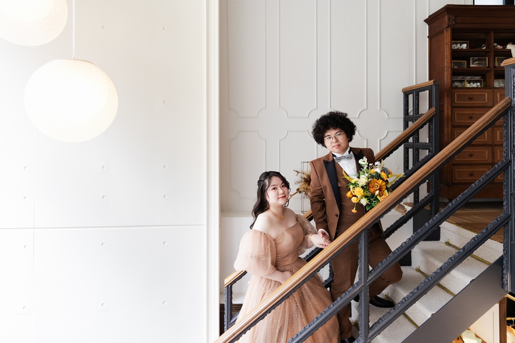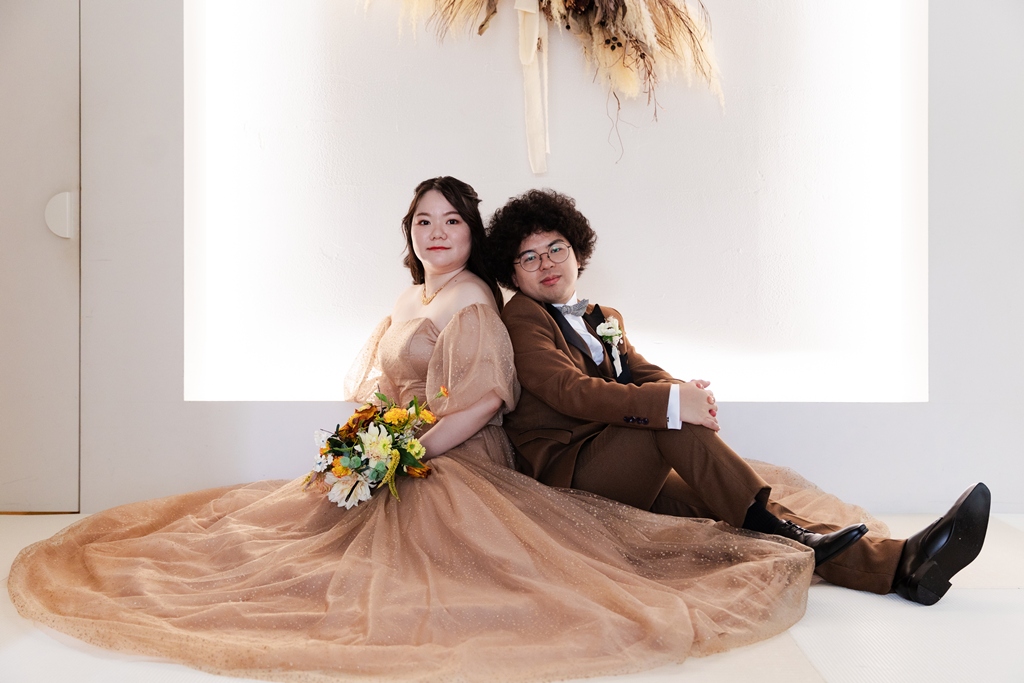 動くたびに変わる衣装の表情が光に寄り添い、おふたりらしい芯のある優しさが感じられました。洋装撮影では、空間の魅力が一層際立ち、おふたりの華やかさがスタジオいっぱいに広がりました。