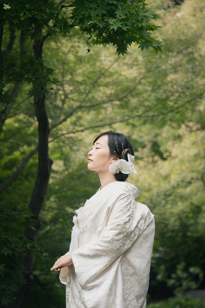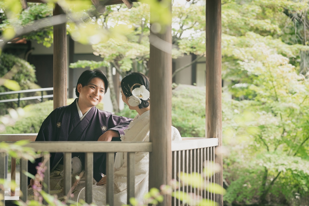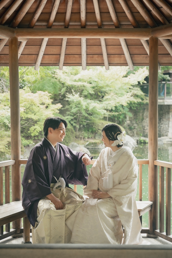 庭園を包み込む木々の緑や池のきらめき、橋を渡る瞬間に差し込むやわらかな光など、どの場面もおふたりの存在をより気品高く演出しておりました。