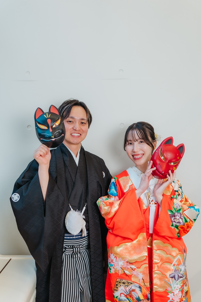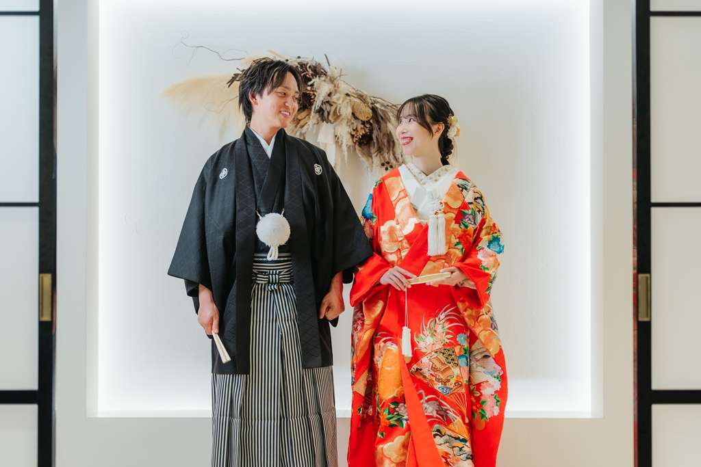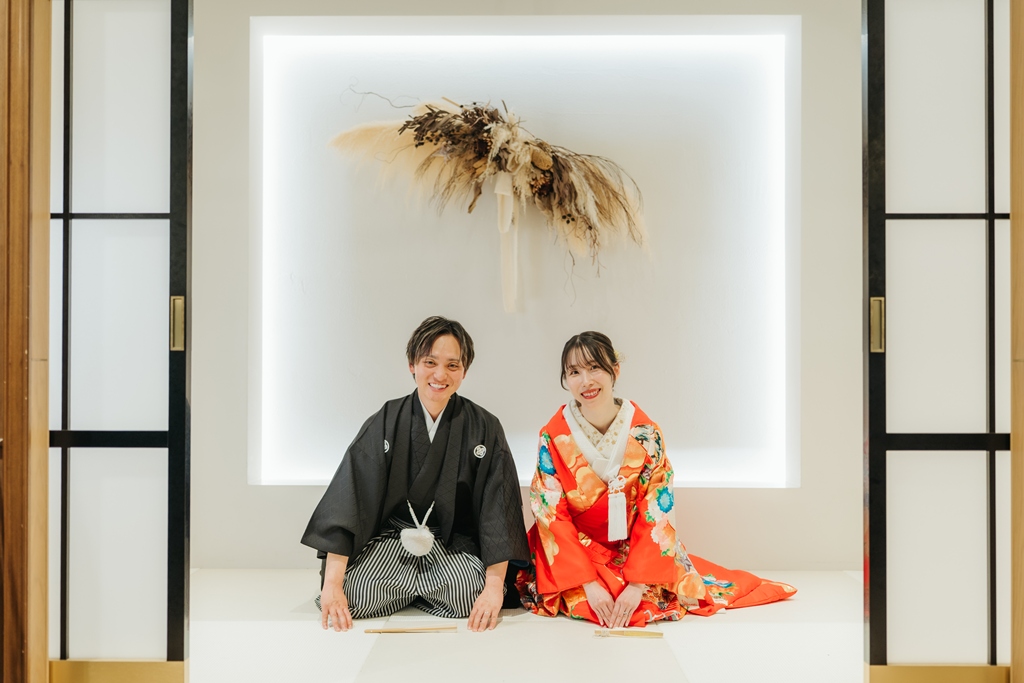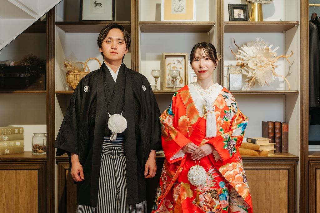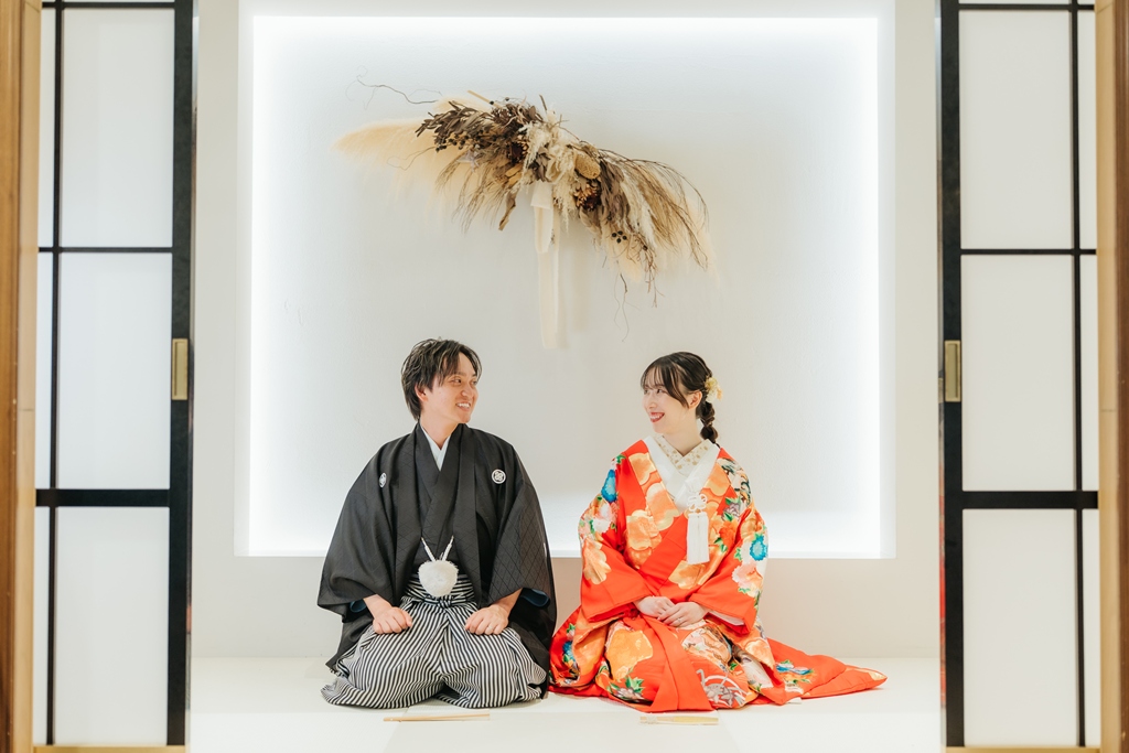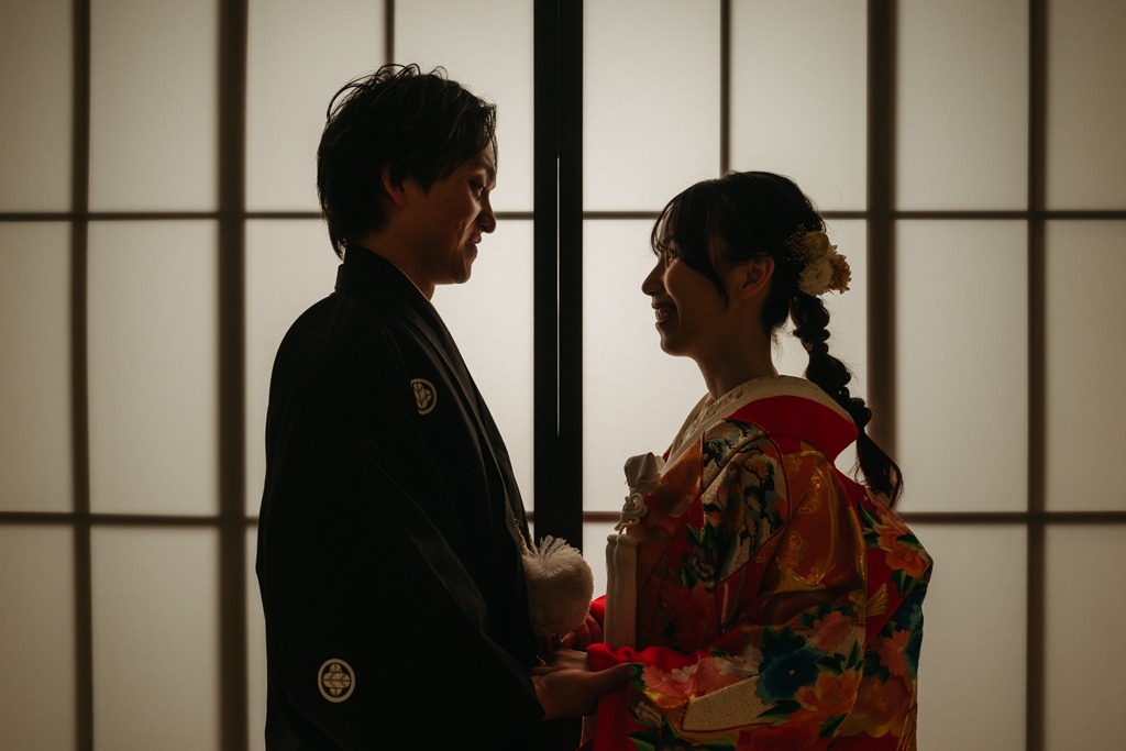 スタジオの背景に溶け込むような重厚感のある和の色彩、光の当たり方で浮かび上がる衣装の美しさ、そして静かな空間に響くおふたりの笑顔。
