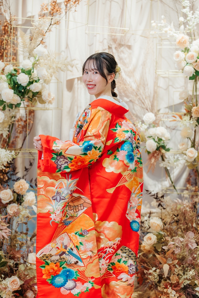 色打掛や白無垢の繊細な模様、帯の質感、小物の輝きまで、すべてが美しく浮かび上がるよう計算された光の中で、おふたりが立つ姿は本当に凛としており、その場の空気までも清らかに感じられました。