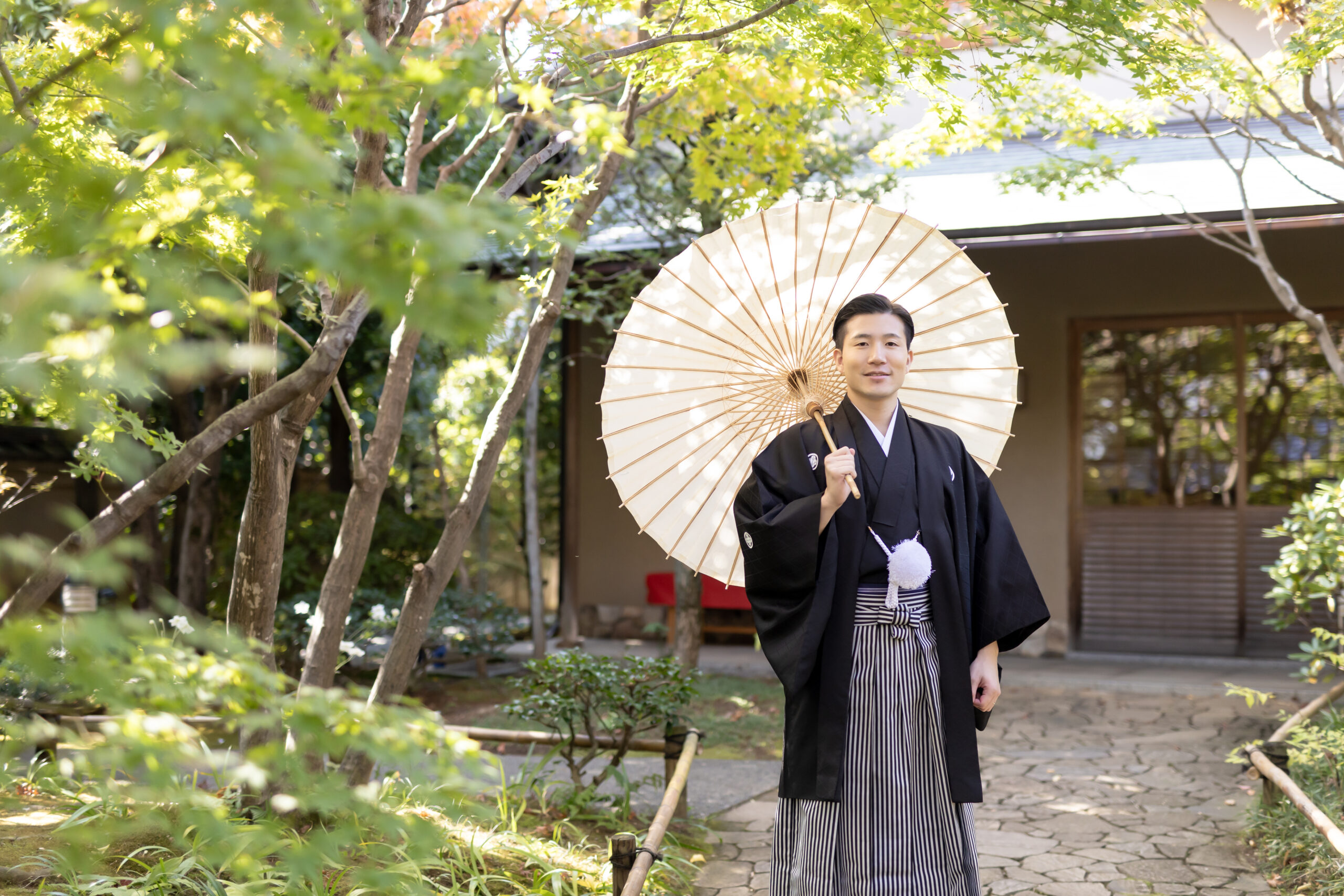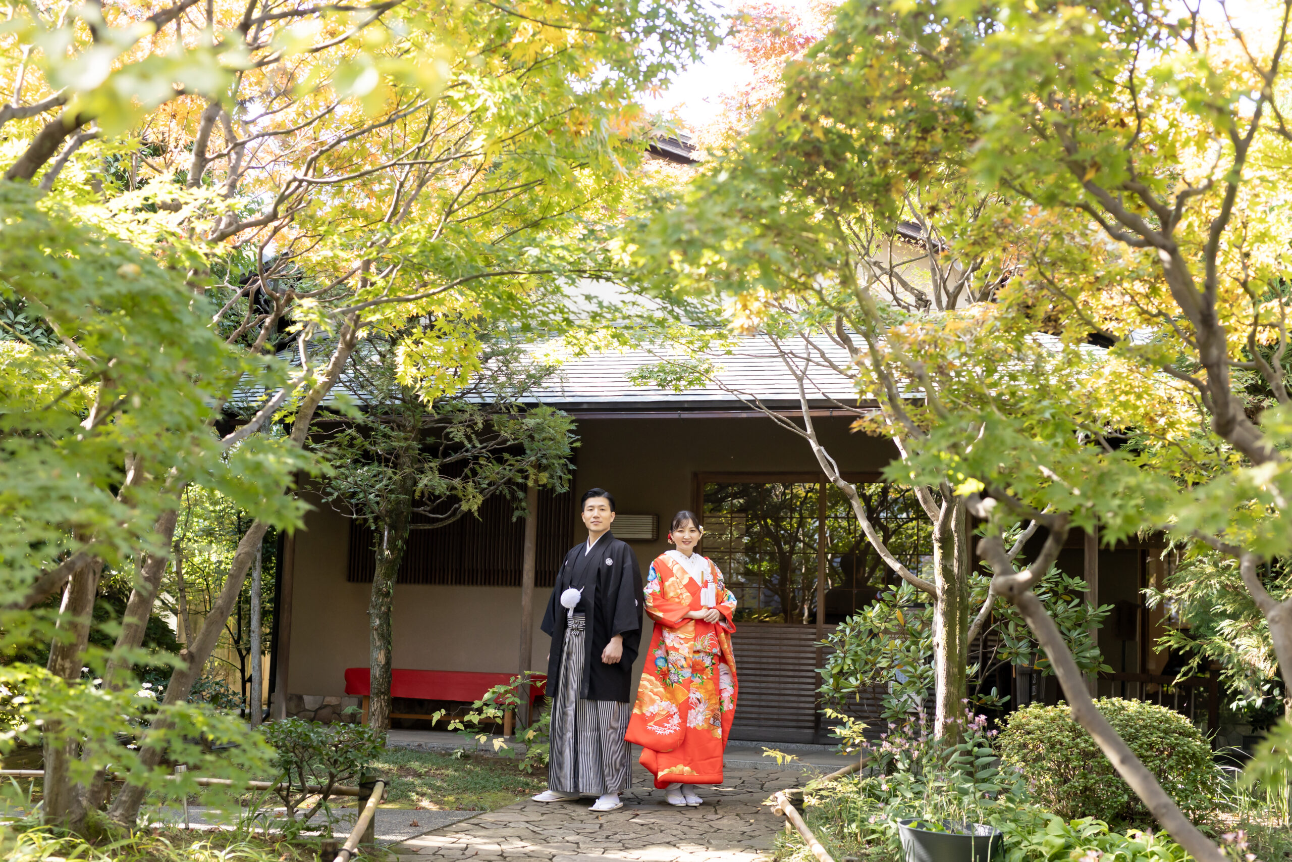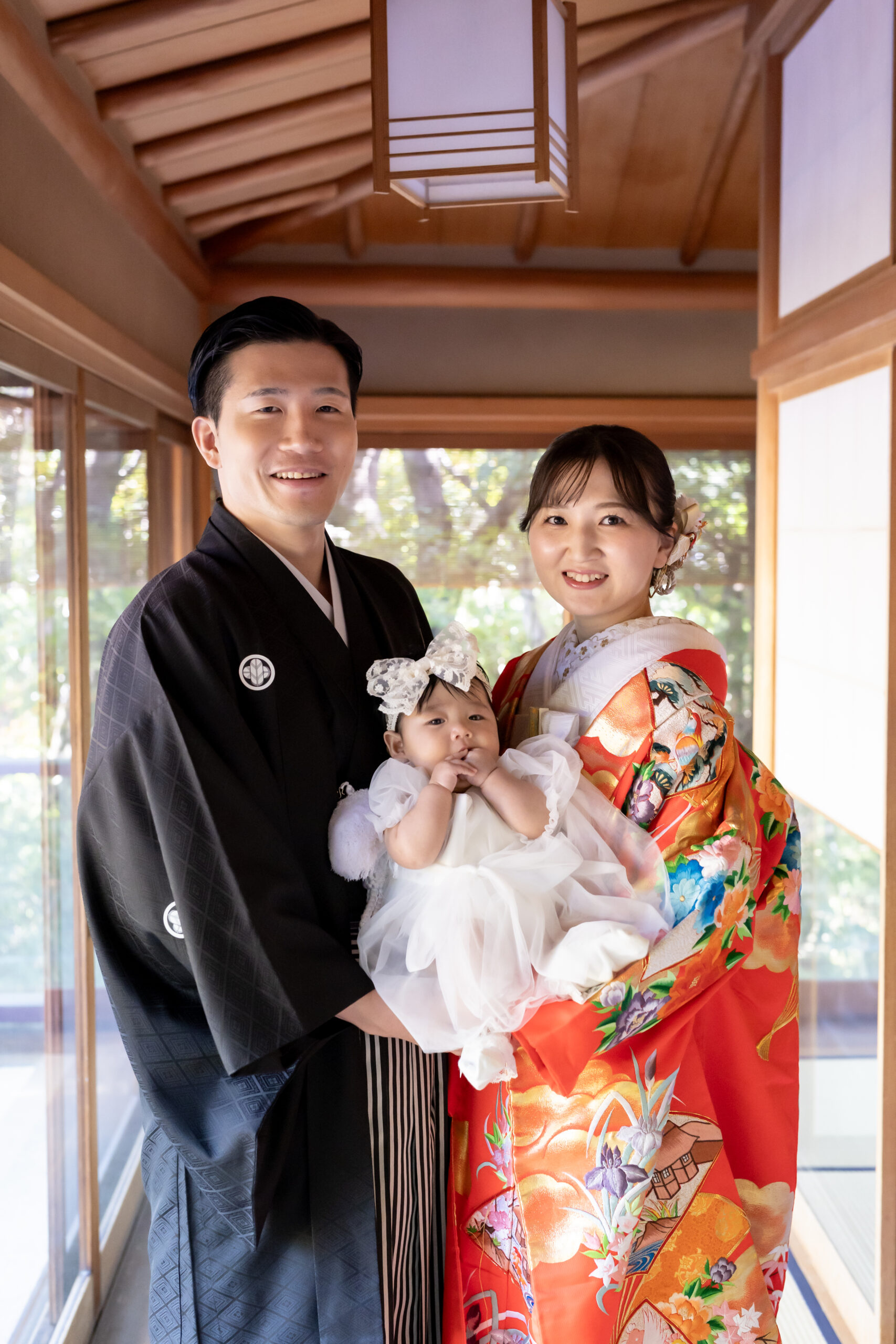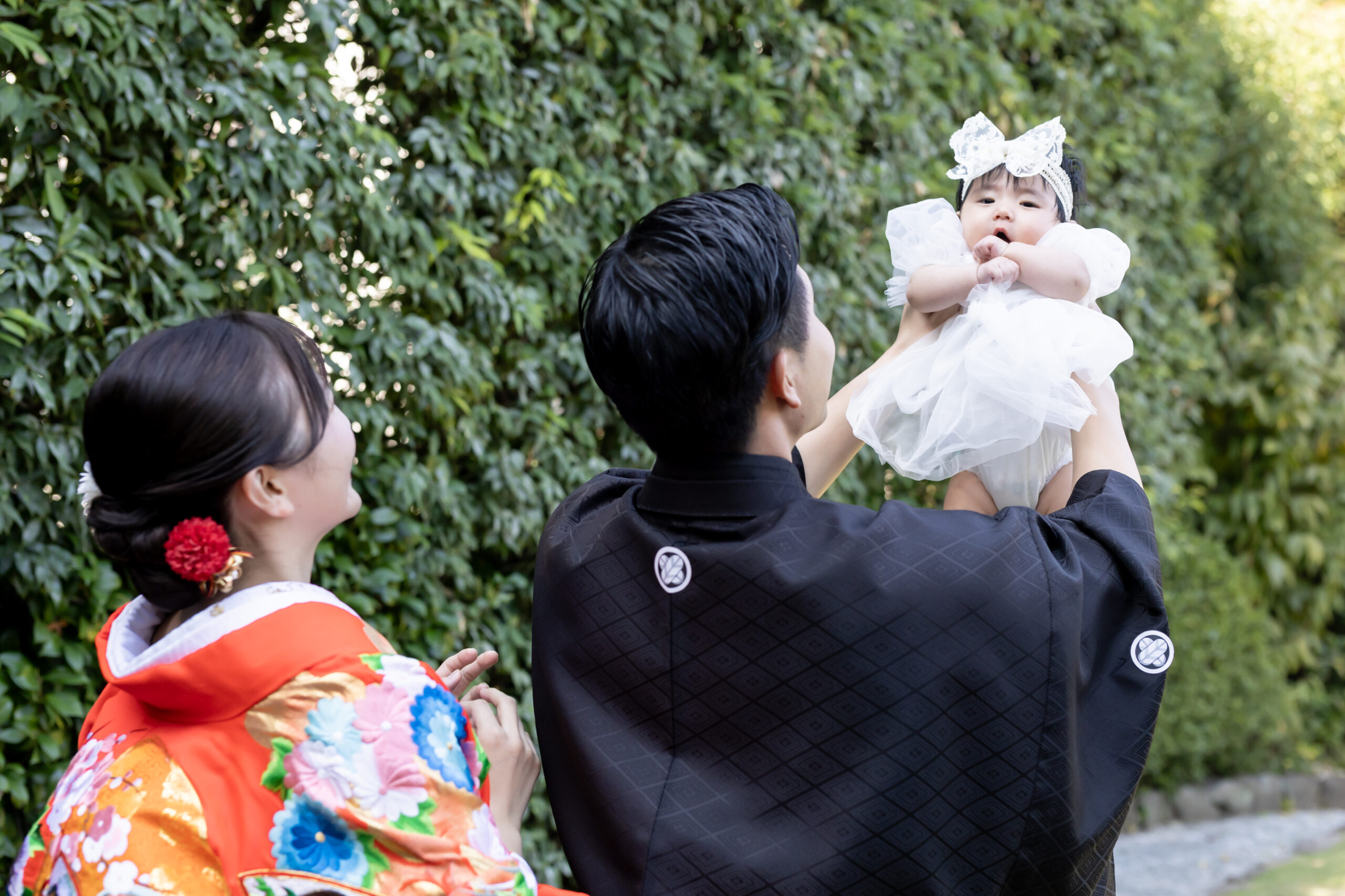 新郎様の紋付袴、新婦様の色打掛といった格式ある和装は、日本庭園の景色と美しく調和し、家族の節目を写真として丁寧に残すことができます。