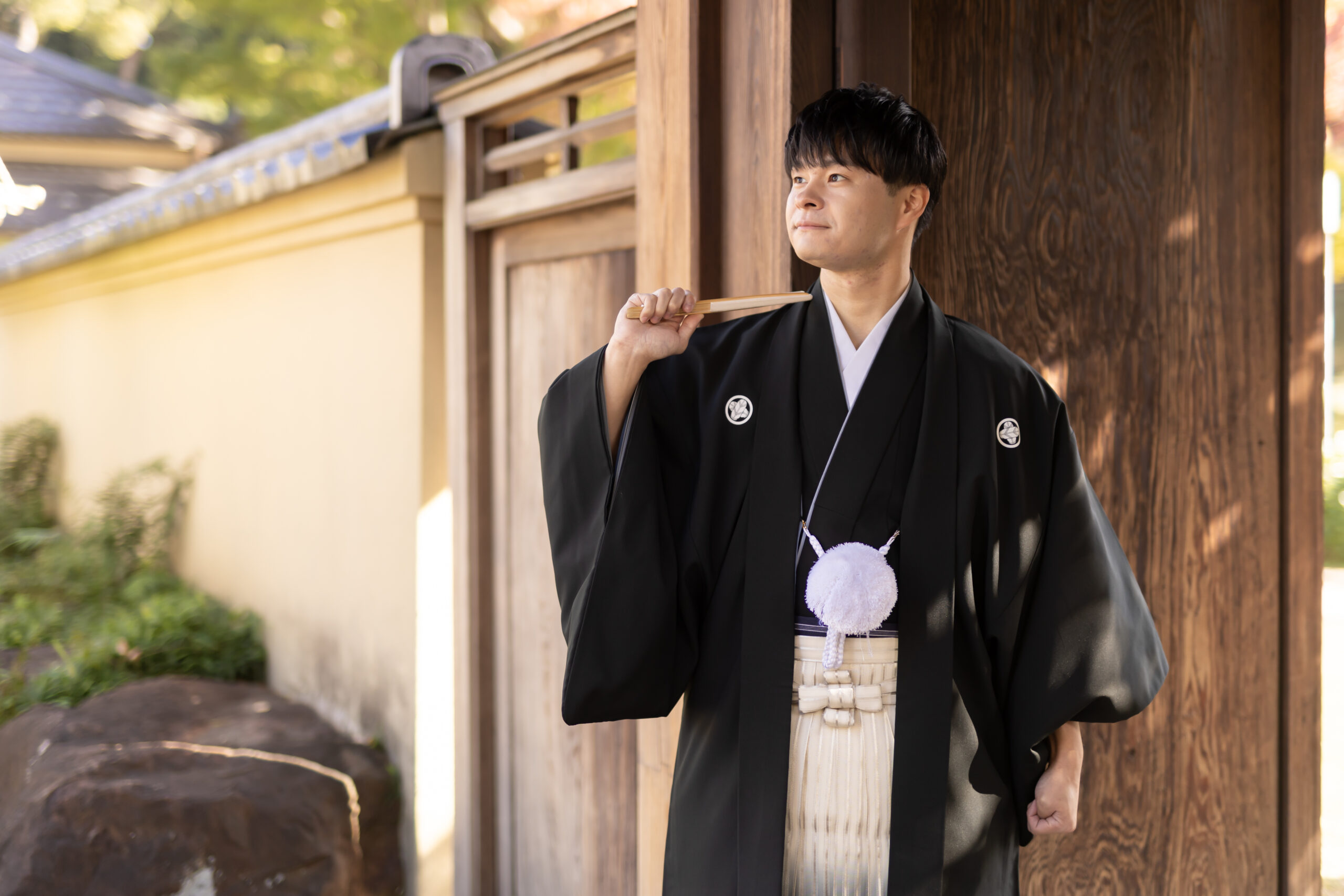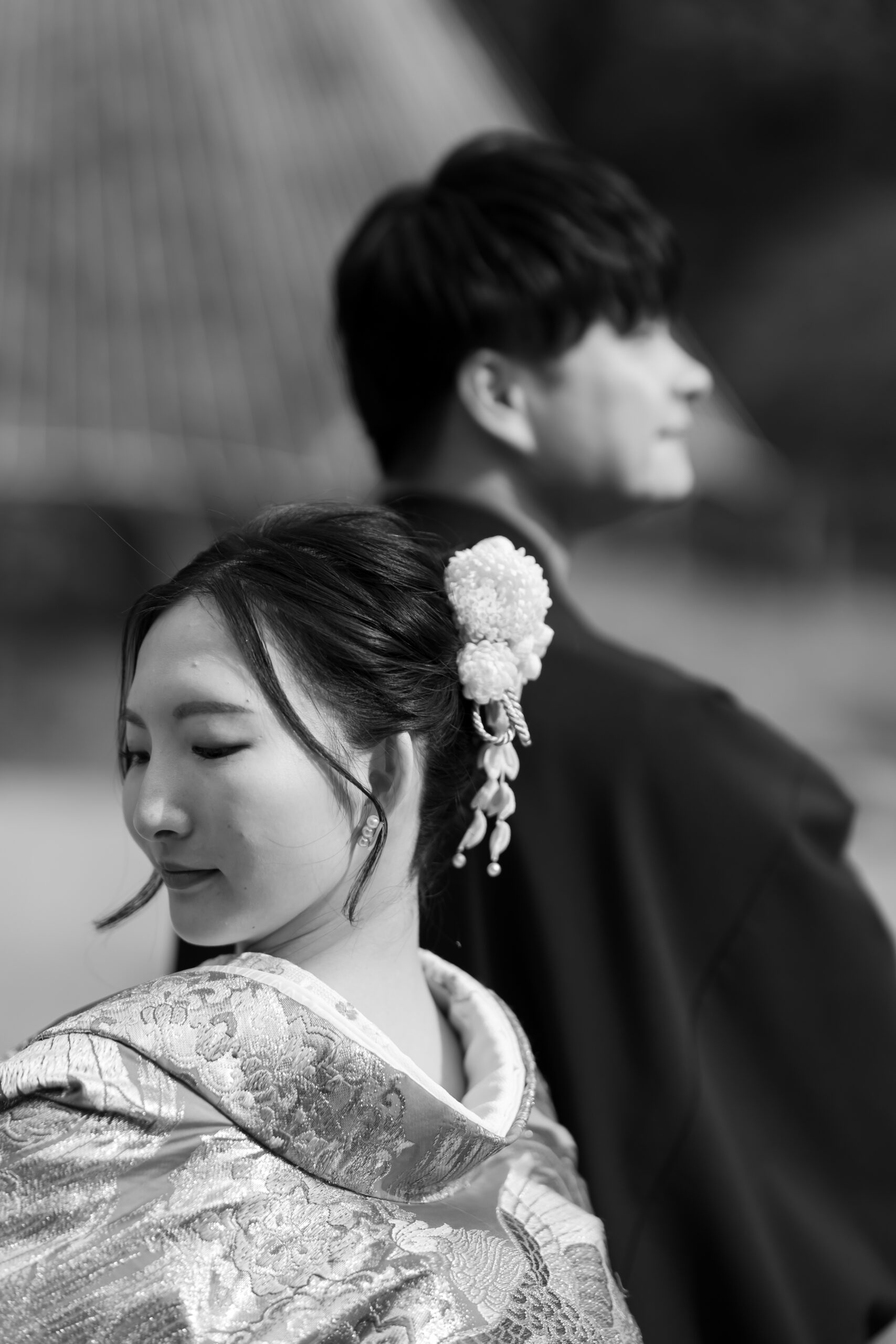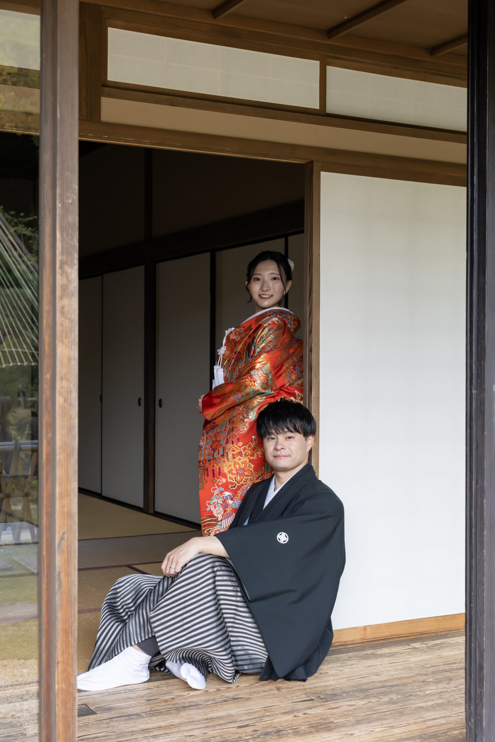 落ち着いた庭園の空気の中で、和装に身を包まれたおふたりの佇まいはとても美しく、自然と調和した印象的なひとときでした。