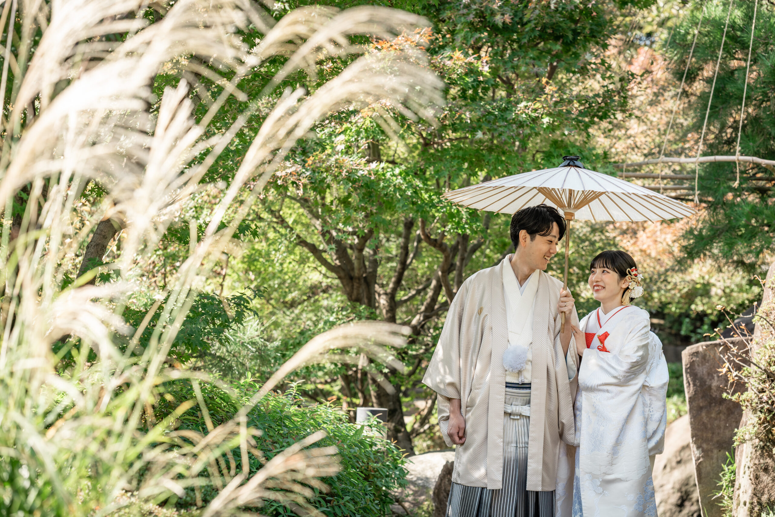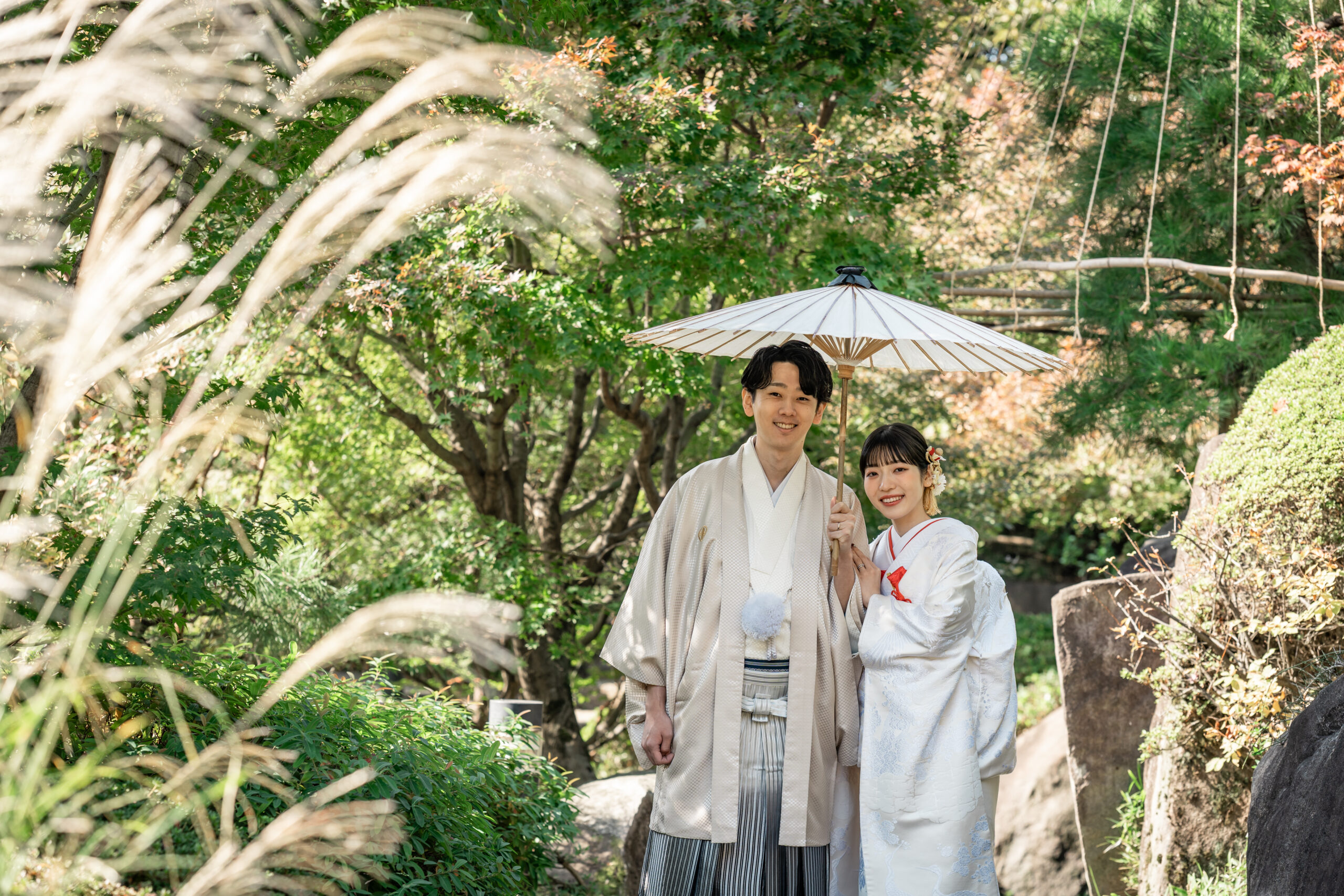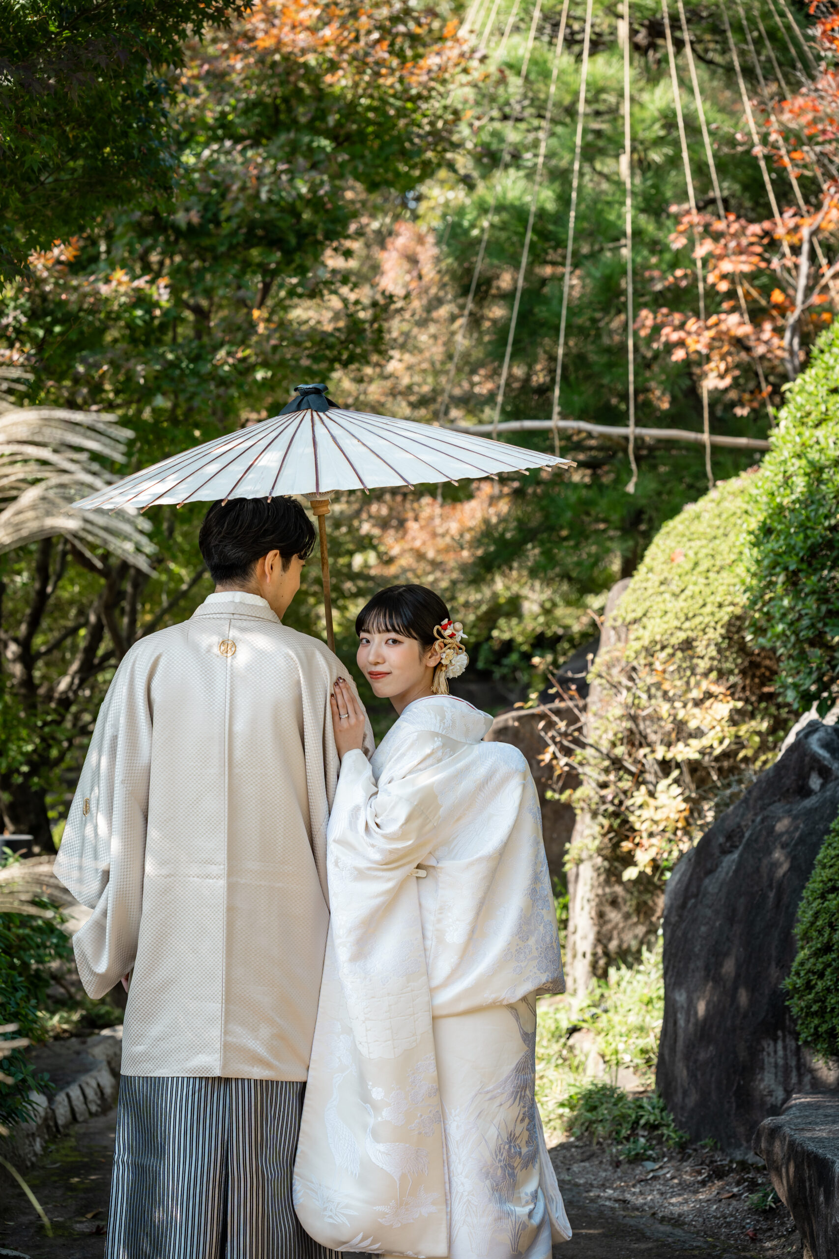 目白庭園の落ち着いた雰囲気が感じられるお写真となり、おふたりの優しく温かい雰囲気も伝わってきますね。