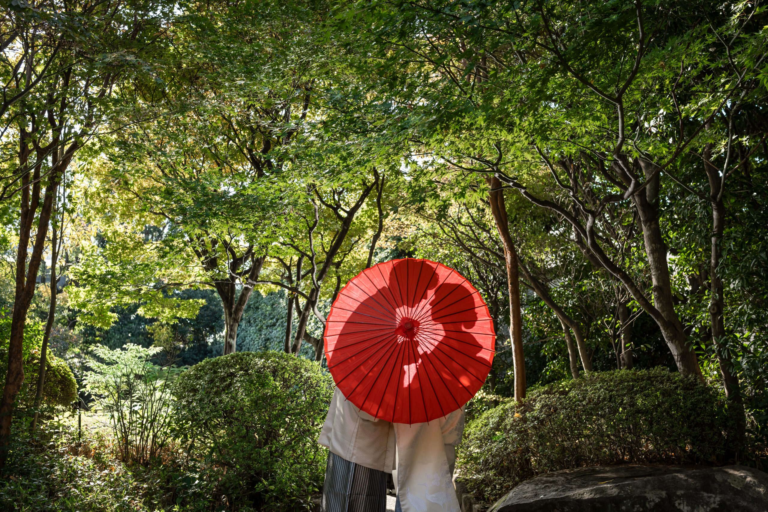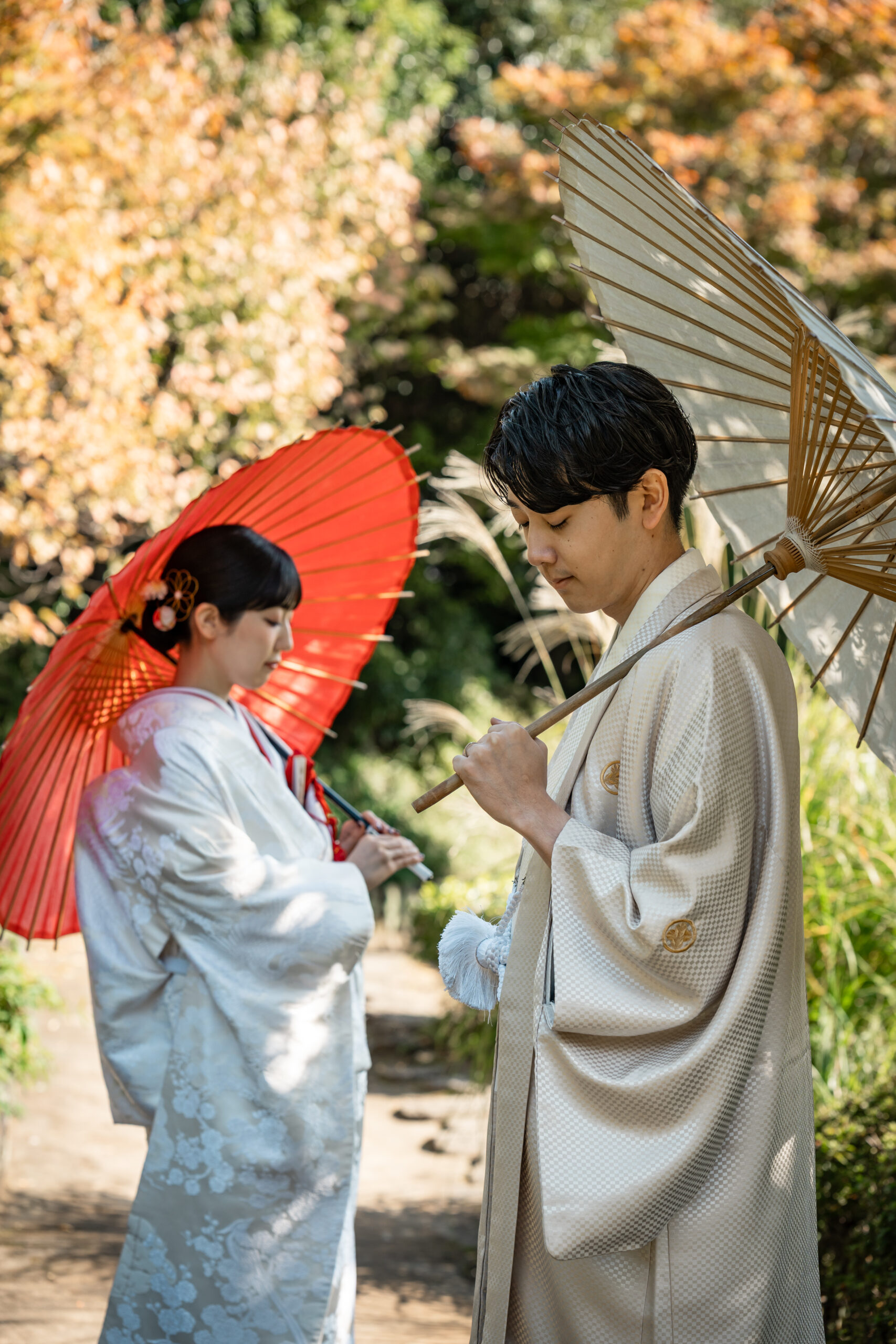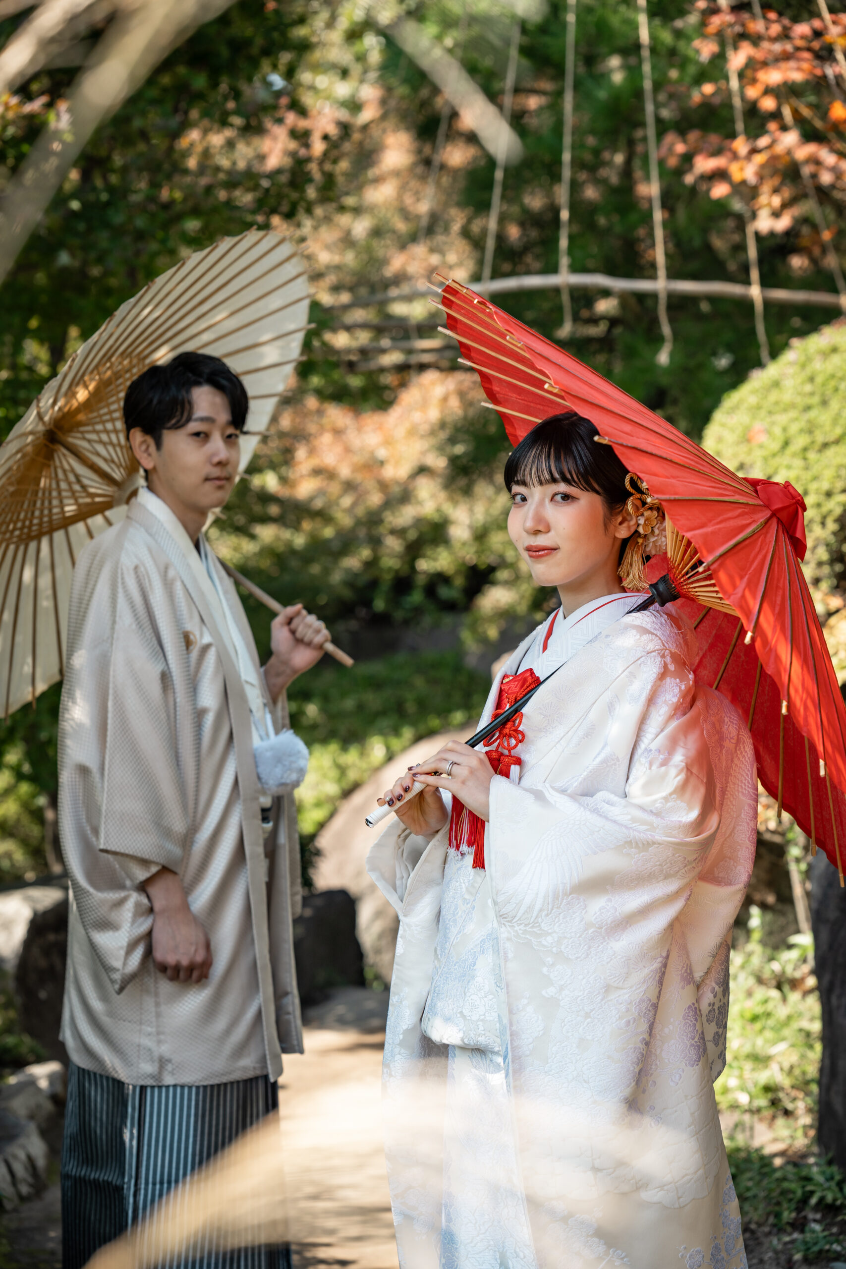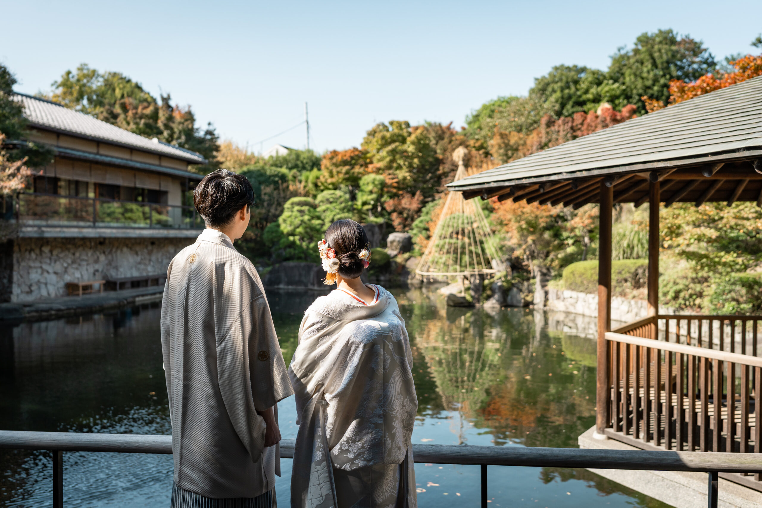 目白庭園の落ち着いた雰囲気が感じられるお写真となり、おふたりの優しく温かい雰囲気も伝わってきますね。